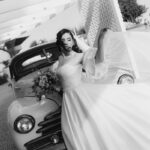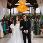Sofia estava absolutamente deslumbrante como noiva. O seu vestido de noiva La Modelista foi a tradução perfeita dessa essência: elegante, sofisticado e surpreendentemente moderno. O modelo evasê com decote tomara que caia trazia a elegância atemporal que toda noiva busca, mas com um toque contemporâneo que fez toda a diferença. O tecido com caimento impecável refletia a luz de forma suave, criando um brilho discreto que valorizava cada movimento. A saia descia delicadamente até uma cauda generosa, que deslizava pelo chão com leveza e criava uma silhueta majestosa. Mas o grande destaque do vestido eram as mangas bufantes ombro a ombro removíveis: volumosas, românticas e perfeitamente estruturadas, elas traziam dramaticidade sem pesar, equilibrando o minimalismo do corpo do vestido com um toque de romantismo moderno.