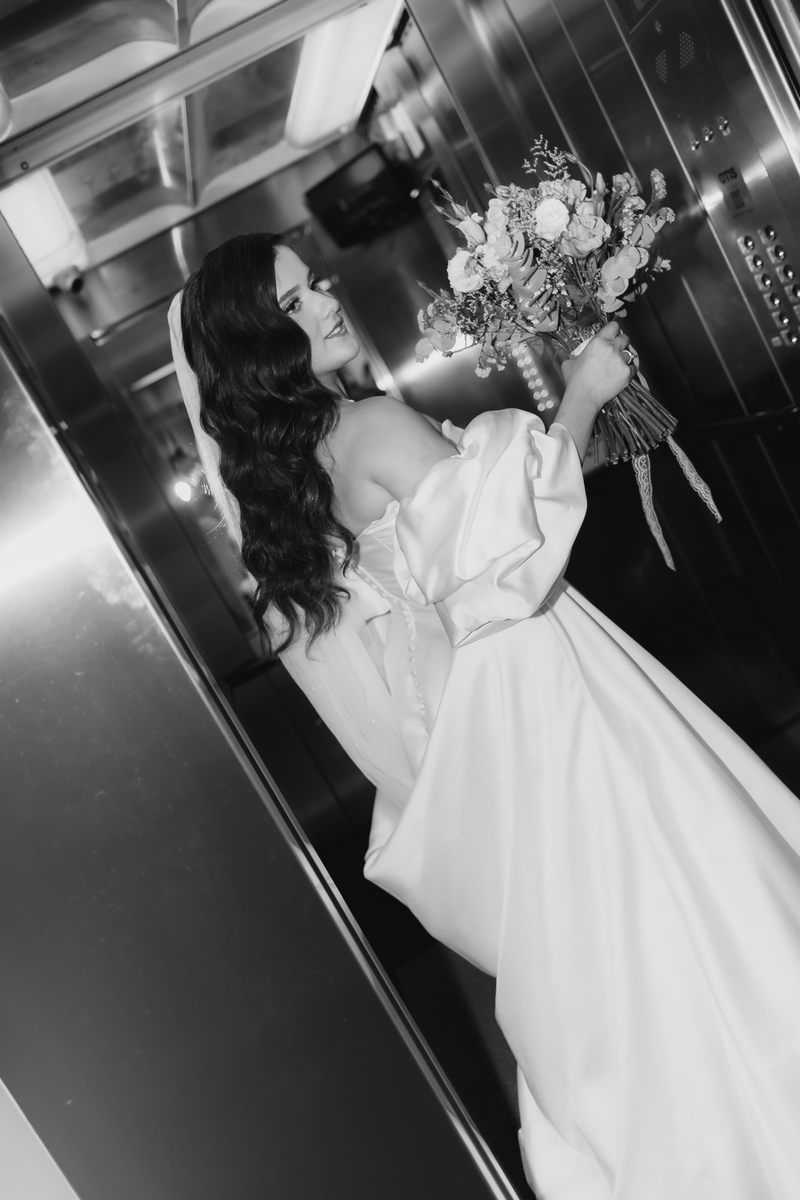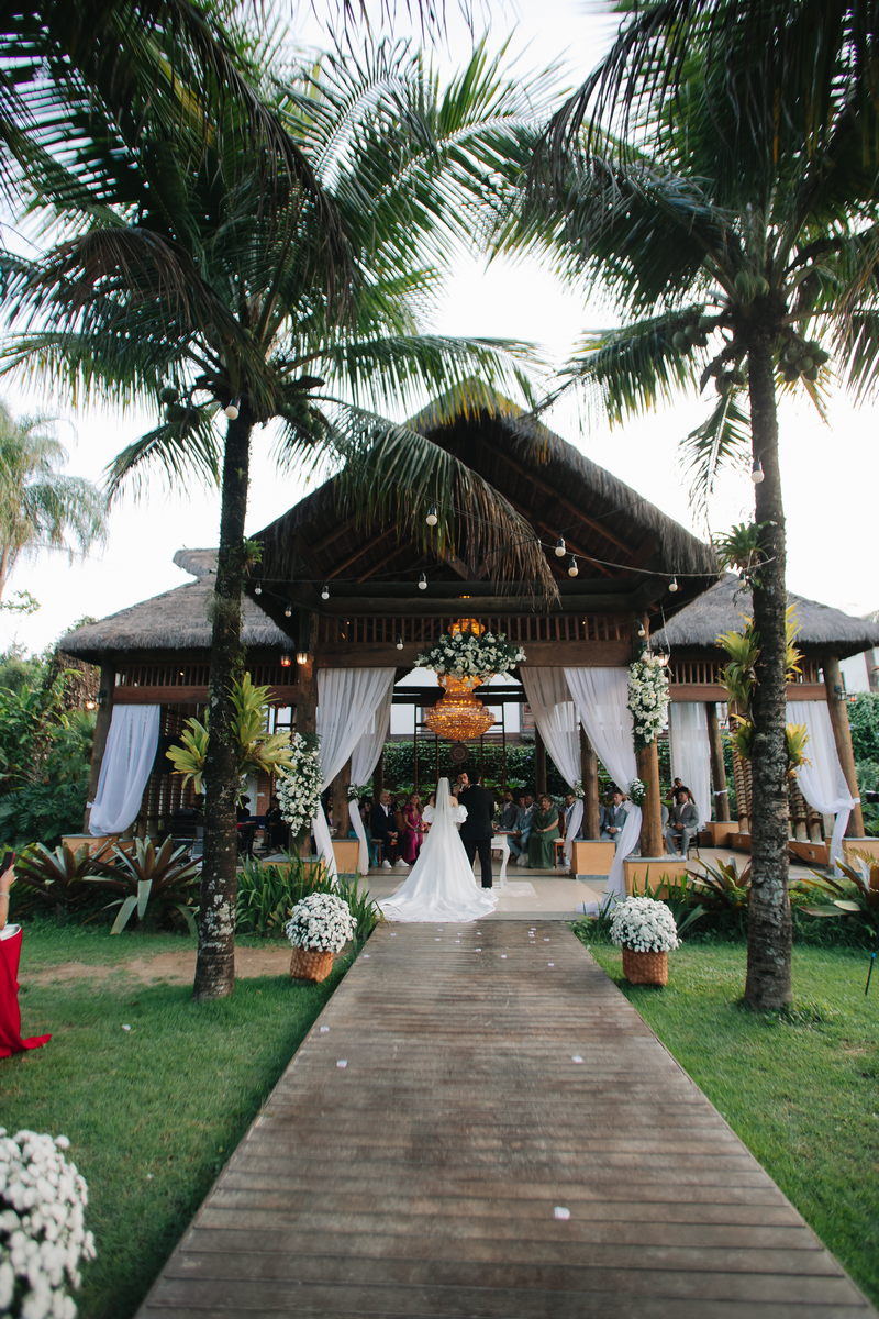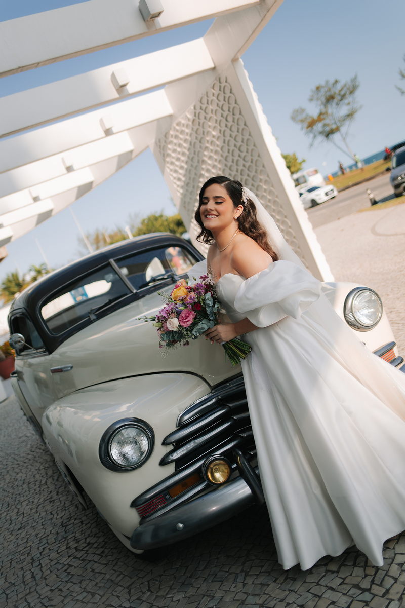 Sofia estava absolutamente deslumbrante como noiva. O seu vestido de noiva La Modelista foi a tradução perfeita dessa essência: elegante, sofisticado e surpreendentemente moderno. O modelo evasê com decote tomara que caia trazia a elegância atemporal que toda noiva busca, mas com um toque contemporâneo que fez toda a diferença. O tecido com caimento impecável refletia a luz de forma suave, criando um brilho discreto que valorizava cada movimento. A saia descia delicadamente até uma cauda generosa, que deslizava pelo chão com leveza e criava uma silhueta majestosa. Mas o grande destaque do vestido eram as mangas bufantes ombro a ombro removíveis: volumosas, românticas e perfeitamente estruturadas, elas traziam dramaticidade sem pesar, equilibrando o minimalismo do corpo do vestido com um toque de romantismo moderno.