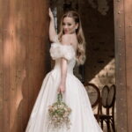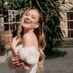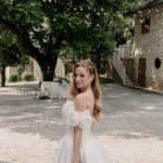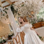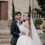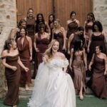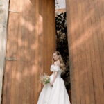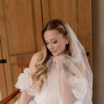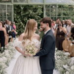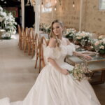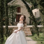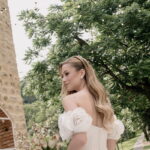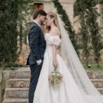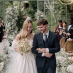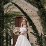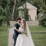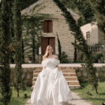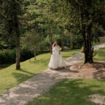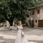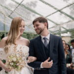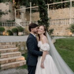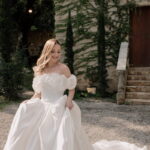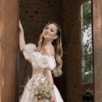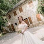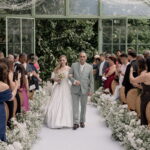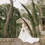 Gabriella é daquelas noivas que encantam assim que aparecem, belíssima com seu sorriso sereno. O seu vestido de noiva La Modelista trazia aquele caimento impecável que valoriza a silhueta, e o decote ombro a ombro vinha adornado com grandes flores tridimensionais, um trabalho único que transformava o vestido em escultura. Eram rosas delicadas, sobrepostas camada por camada, com textura suave e volume que dava personalidade à parte superior da peça. A saia volumosa, com pregas amplas e suaves, criava movimento a cada passo, e a cauda acompanhava Gabriella com elegância pelas escadarias do Lago Enfesta.
