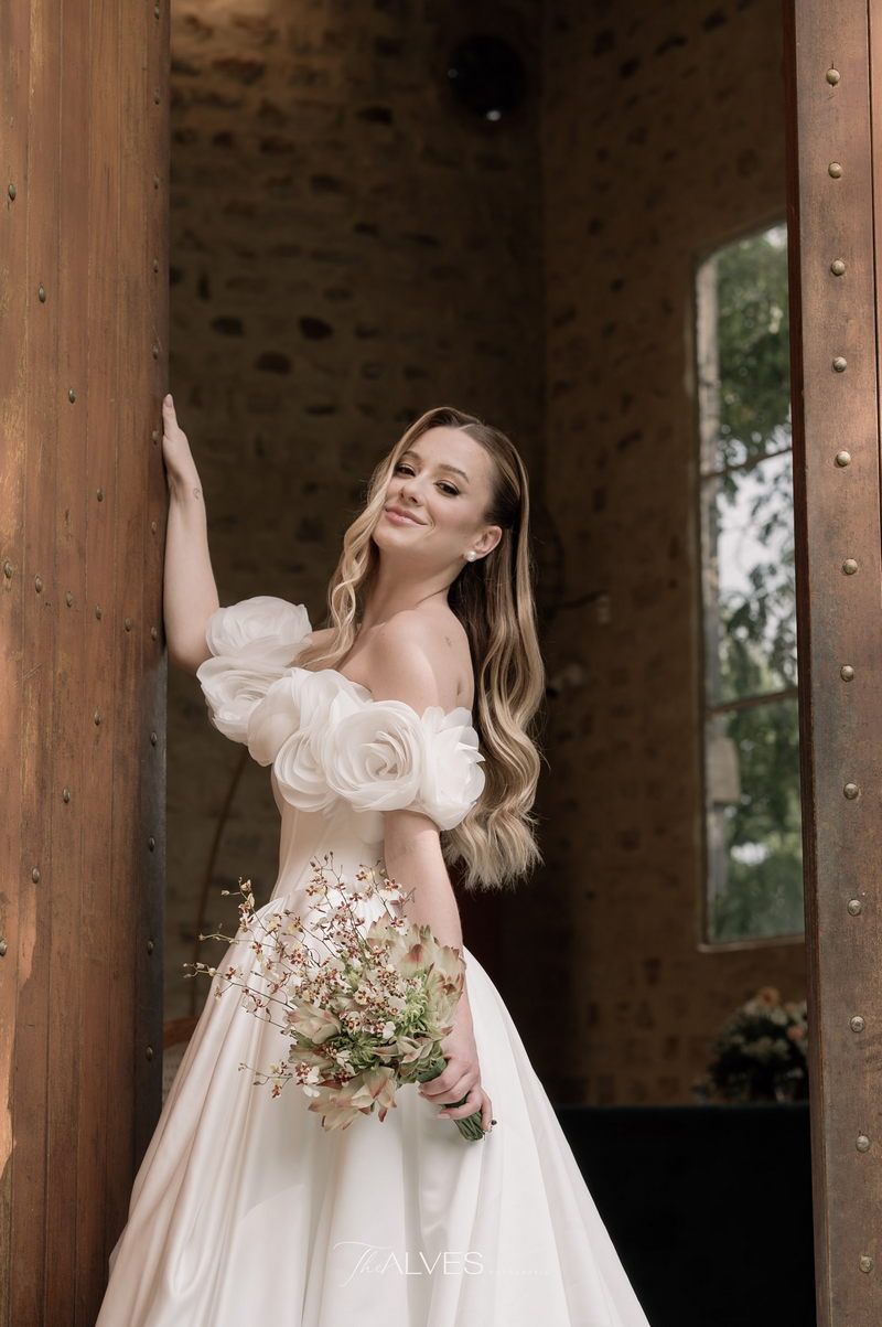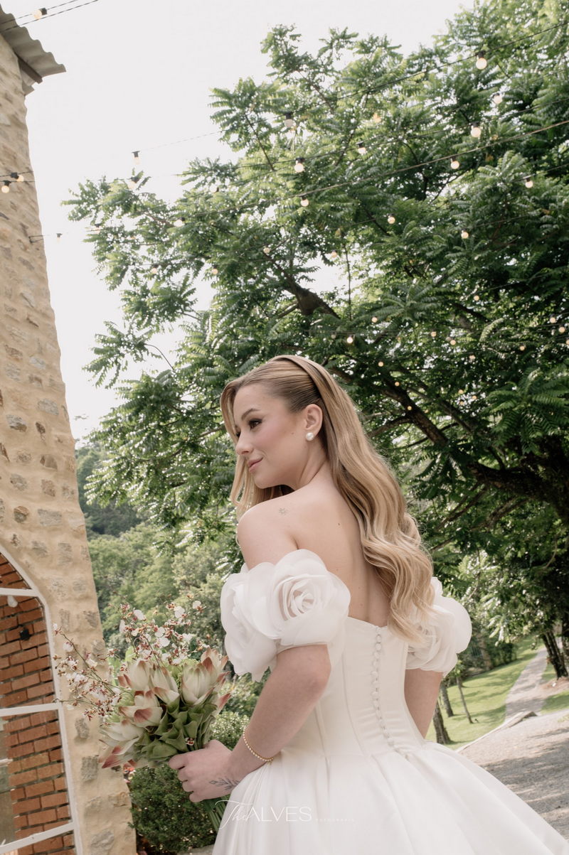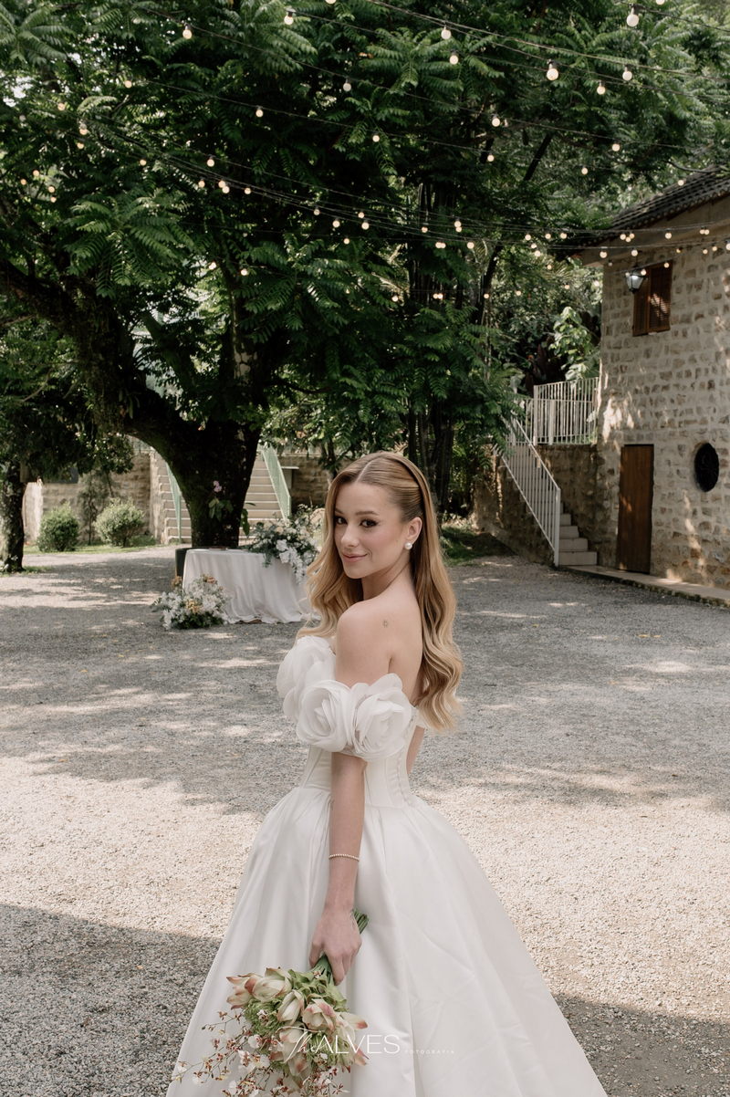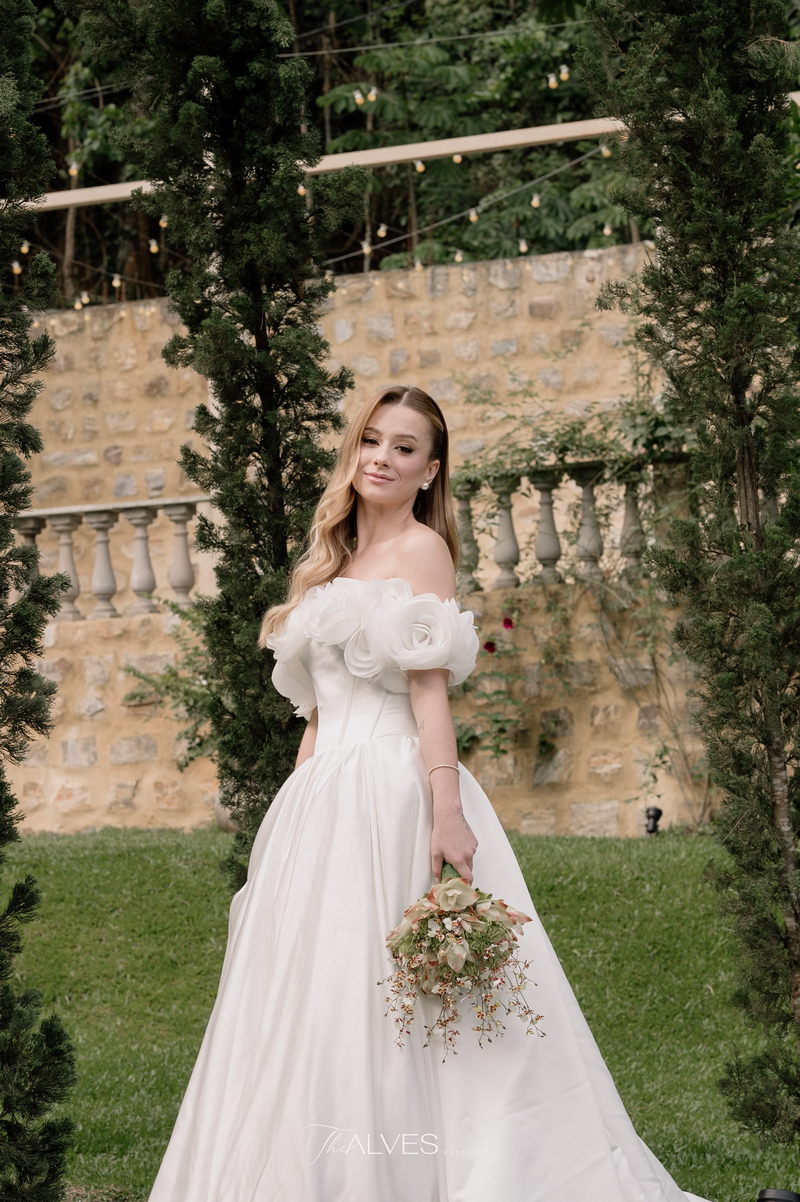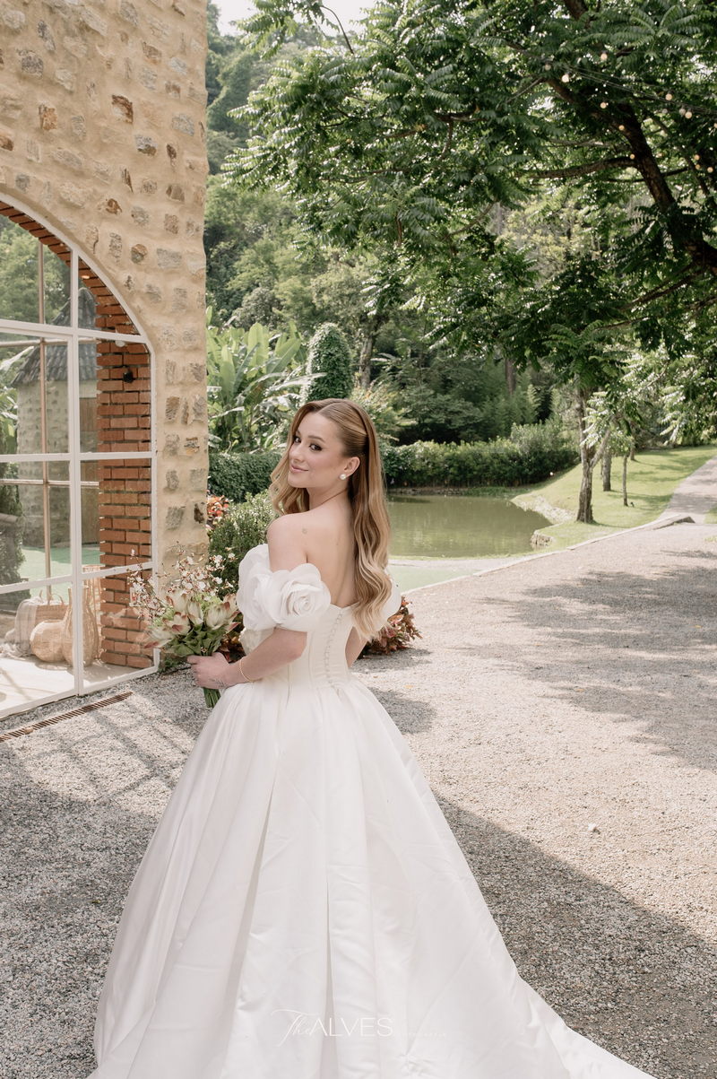 Gabriella é daquelas noivas que encantam assim que aparecem, belíssima com seu sorriso sereno. O seu vestido de noiva La Modelista trazia aquele caimento impecável que valoriza a silhueta, e o decote ombro a ombro vinha adornado com grandes flores tridimensionais, um trabalho único que transformava o vestido em escultura. Eram rosas delicadas, sobrepostas camada por camada, com textura suave e volume que dava personalidade à parte superior da peça. A saia volumosa, com pregas amplas e suaves, criava movimento a cada passo, e a cauda acompanhava Gabriella com elegância pelas escadarias do Lago Enfesta.