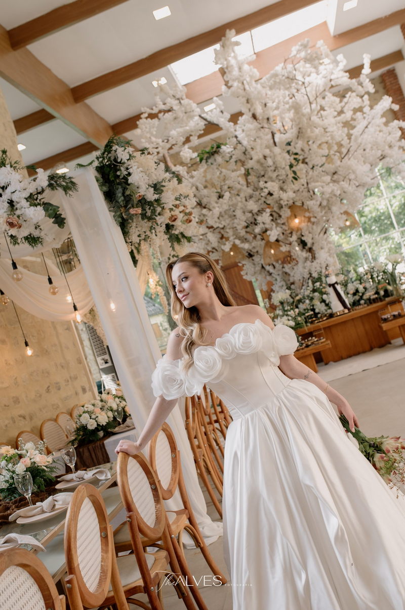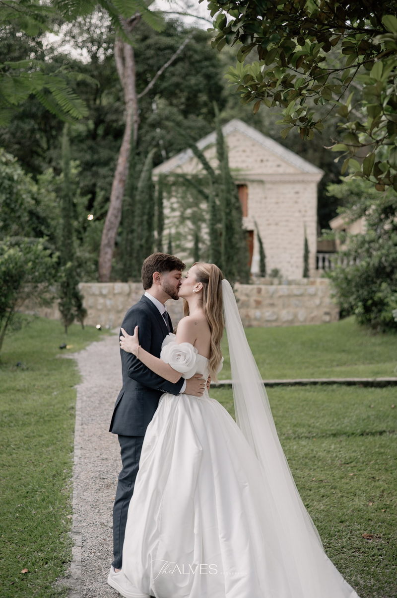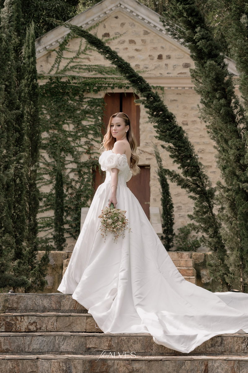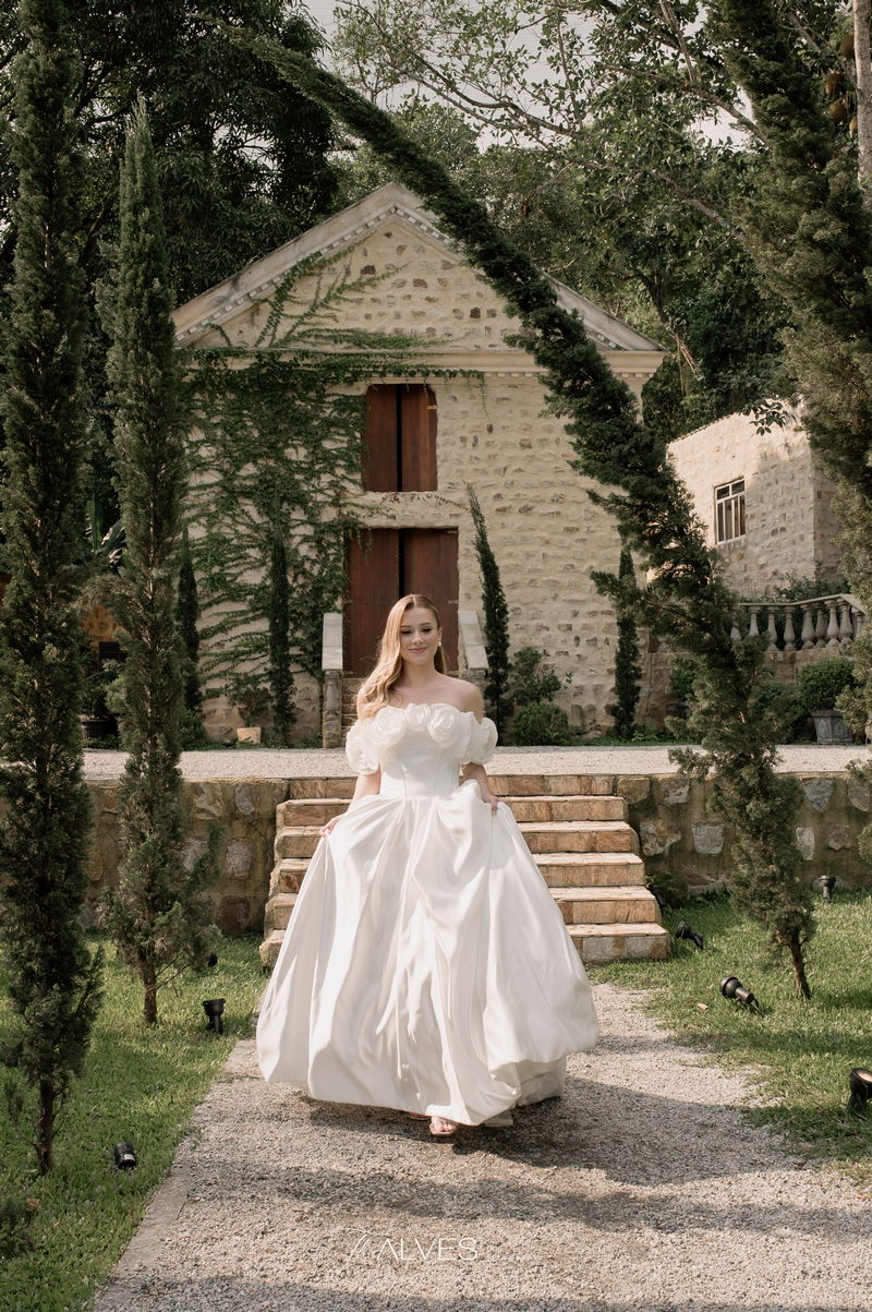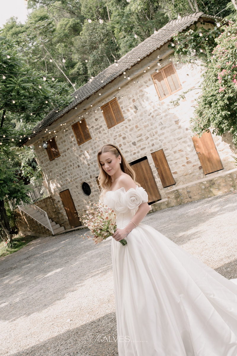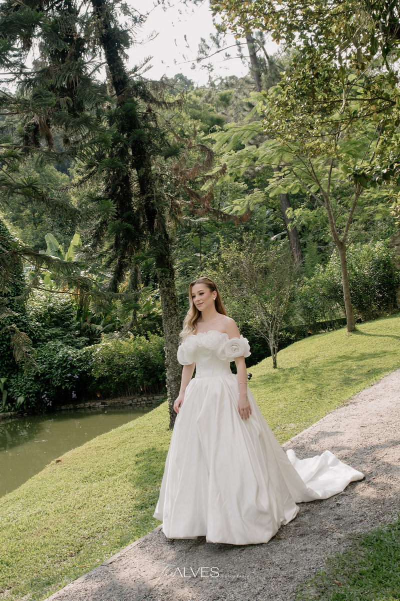Gabriella é daquelas noivas que encantam assim que aparecem, belíssima com seu sorriso sereno. O seu vestido de noiva La Modelista trazia aquele caimento impecável que valoriza a silhueta, e o decote ombro a ombro vinha adornado com grandes flores tridimensionais, um trabalho único que transformava o vestido em escultura. Eram rosas delicadas, sobrepostas camada por camada, com textura suave e volume que dava personalidade à parte superior da peça. A saia volumosa, com pregas amplas e suaves, criava movimento a cada passo, e a cauda acompanhava Gabriella com elegância pelas escadarias do Lago Enfesta.