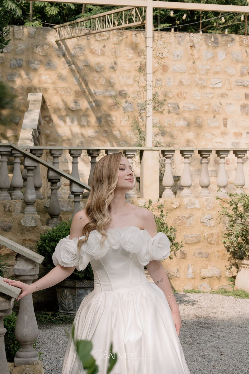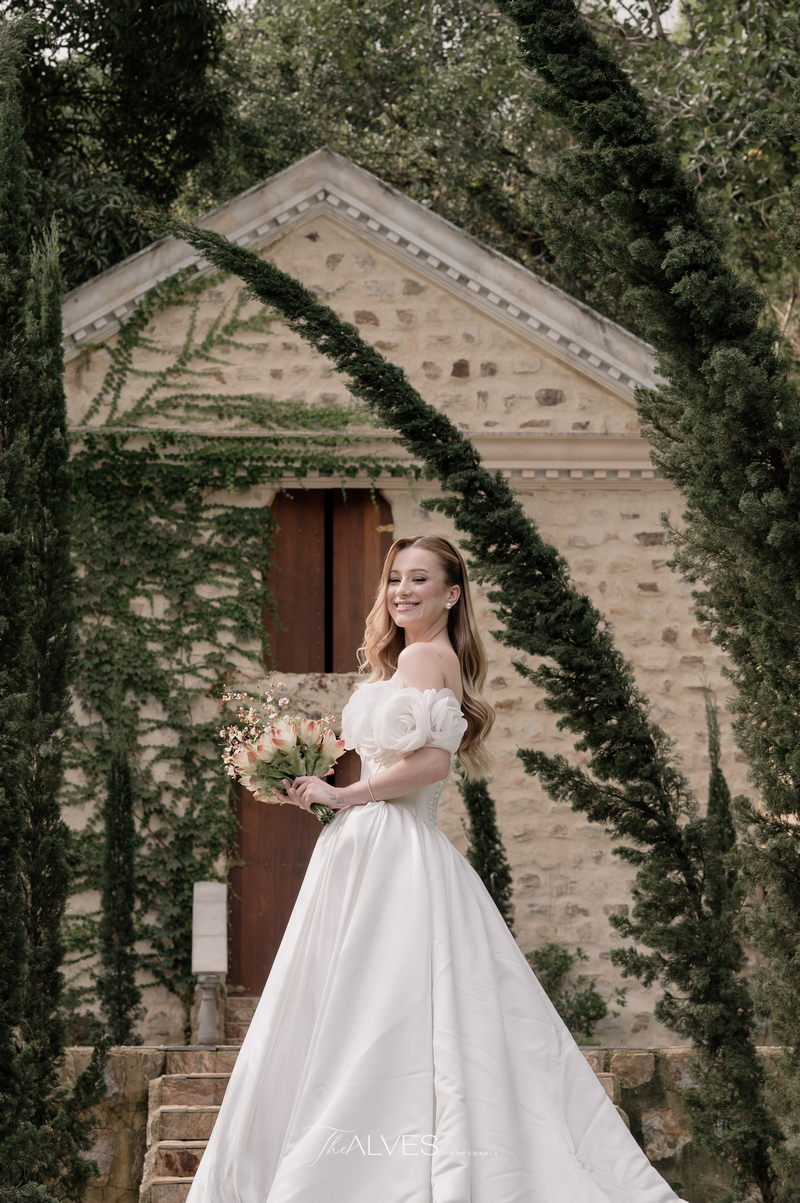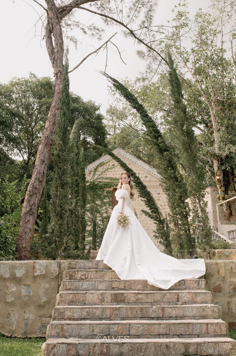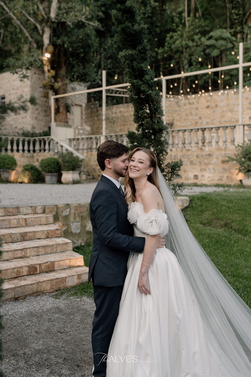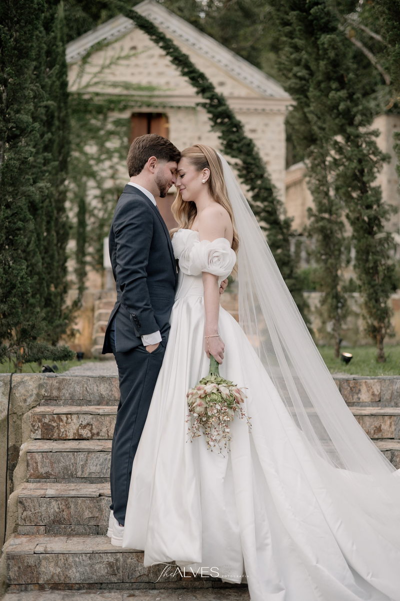 Gabriella é daquelas noivas que encantam assim que aparecem, belíssima com seu sorriso sereno. O seu vestido de noiva La Modelista trazia aquele caimento impecável que valoriza a silhueta, e o decote ombro a ombro vinha adornado com grandes flores tridimensionais, um trabalho único que transformava o vestido em escultura. Eram rosas delicadas, sobrepostas camada por camada, com textura suave e volume que dava personalidade à parte superior da peça. A saia volumosa, com pregas amplas e suaves, criava movimento a cada passo, e a cauda acompanhava Gabriella com elegância pelas escadarias do Lago Enfesta.