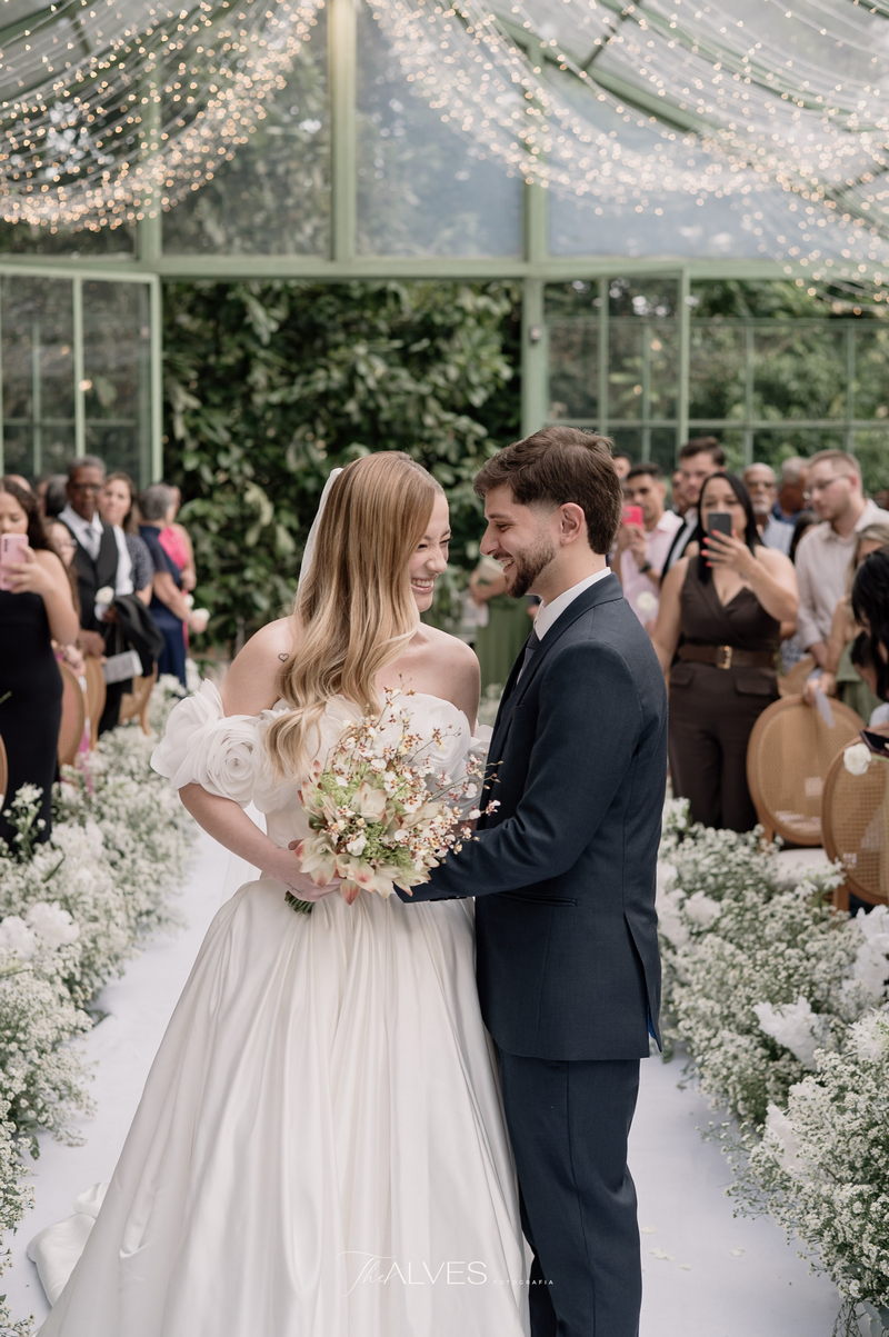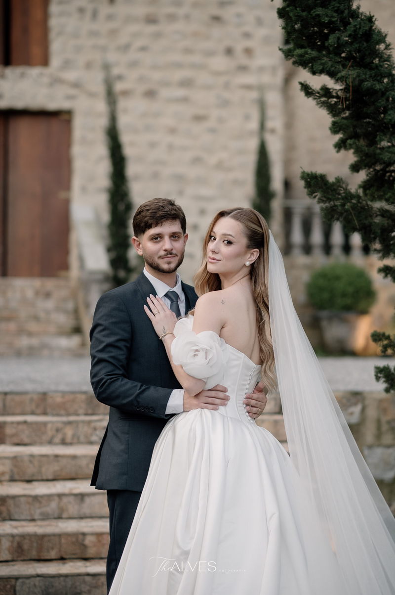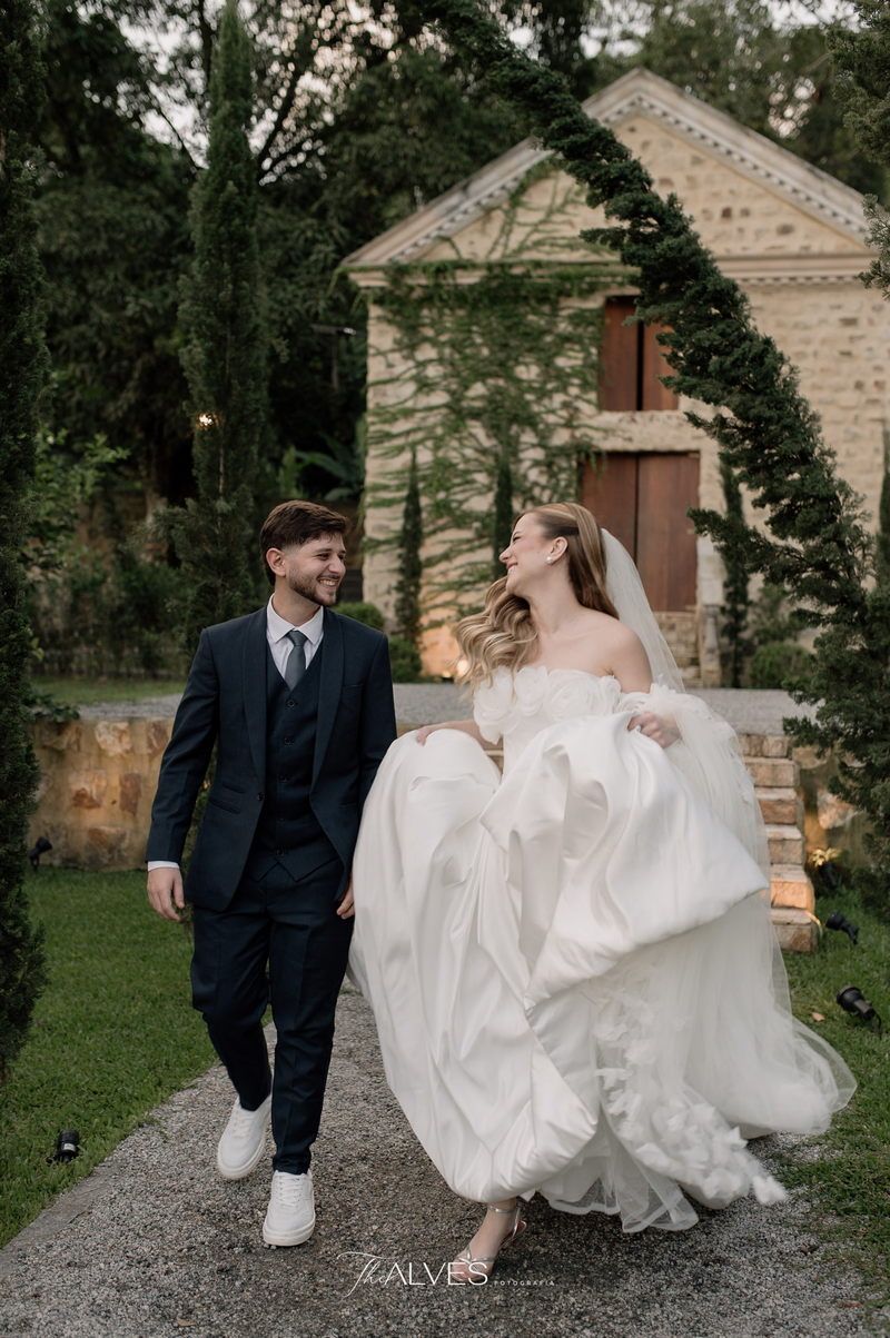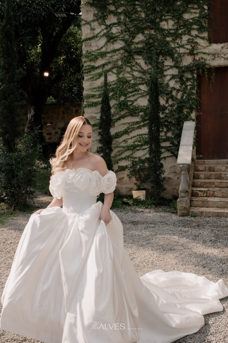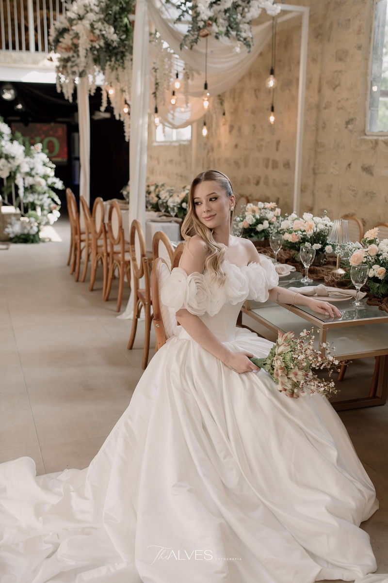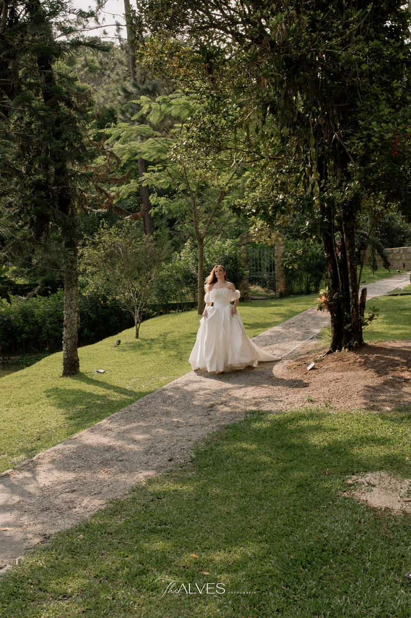 Gabriella é daquelas noivas que encantam assim que aparecem, belíssima com seu sorriso sereno. O seu vestido de noiva La Modelista trazia aquele caimento impecável que valoriza a silhueta, e o decote ombro a ombro vinha adornado com grandes flores tridimensionais, um trabalho único que transformava o vestido em escultura. Eram rosas delicadas, sobrepostas camada por camada, com textura suave e volume que dava personalidade à parte superior da peça. A saia volumosa, com pregas amplas e suaves, criava movimento a cada passo, e a cauda acompanhava Gabriella com elegância pelas escadarias do Lago Enfesta.