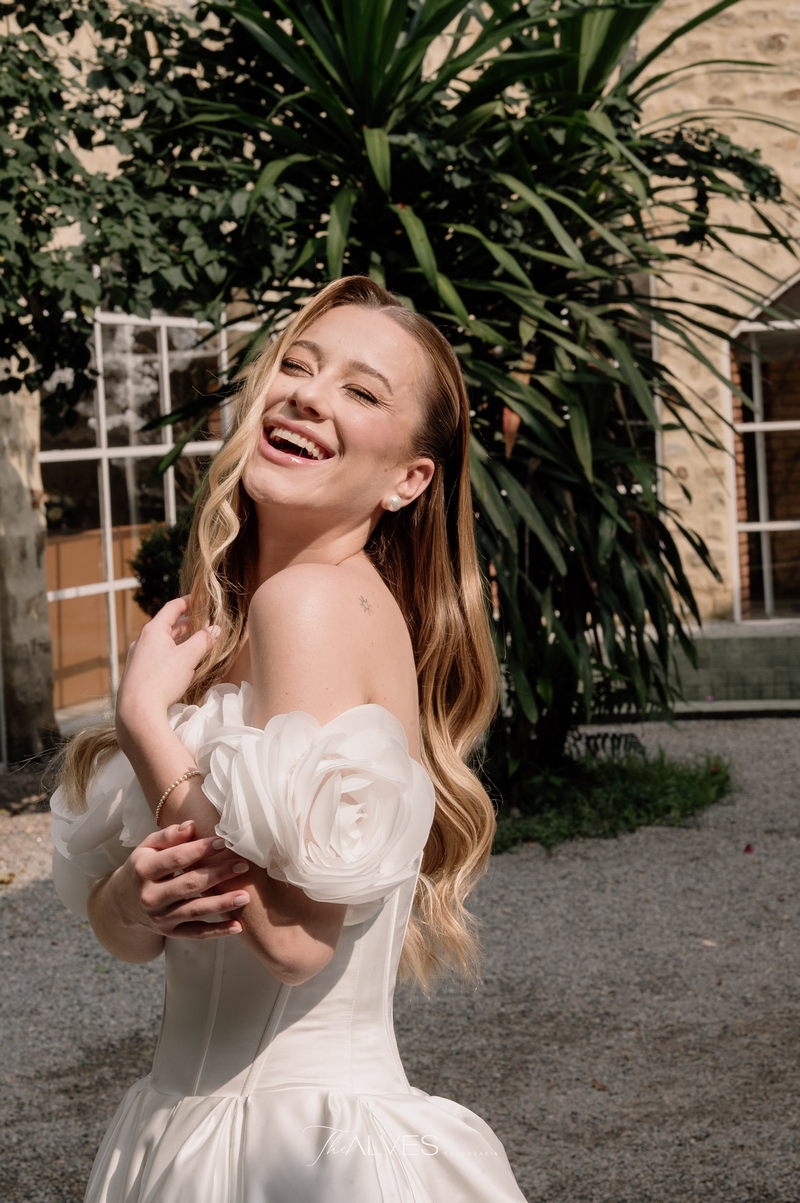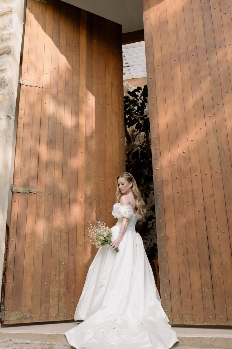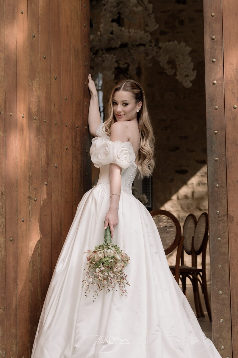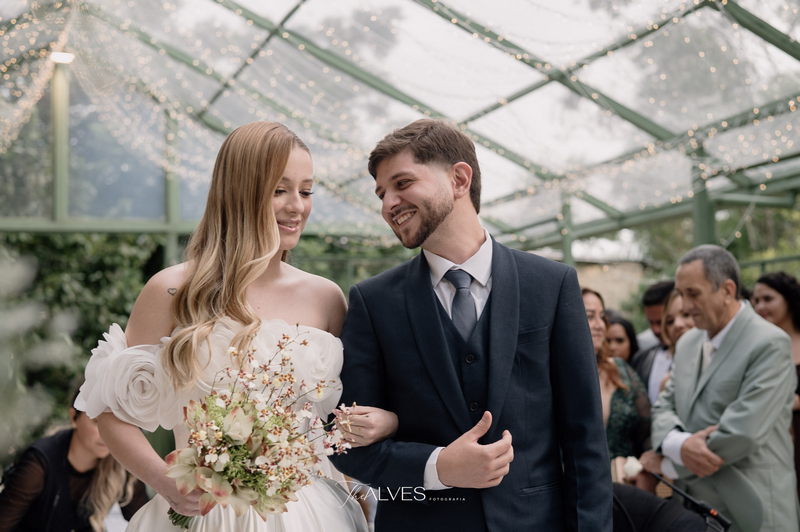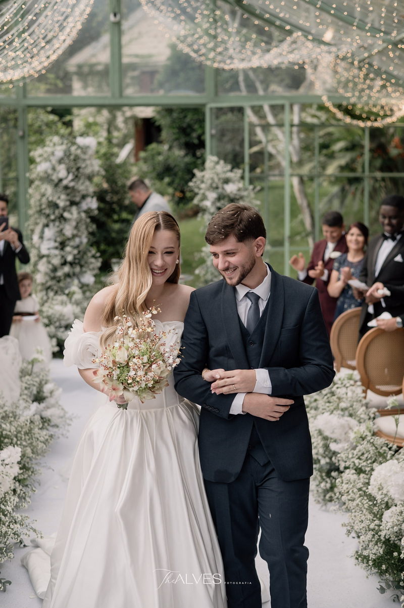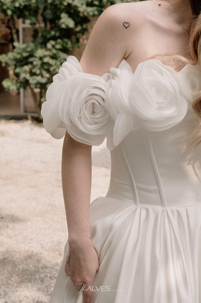 Gabriella é daquelas noivas que encantam assim que aparecem, belíssima com seu sorriso sereno. O seu vestido de noiva La Modelista trazia aquele caimento impecável que valoriza a silhueta, e o decote ombro a ombro vinha adornado com grandes flores tridimensionais, um trabalho único que transformava o vestido em escultura. Eram rosas delicadas, sobrepostas camada por camada, com textura suave e volume que dava personalidade à parte superior da peça. A saia volumosa, com pregas amplas e suaves, criava movimento a cada passo, e a cauda acompanhava Gabriella com elegância pelas escadarias do Lago Enfesta.