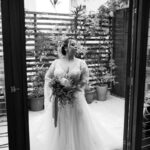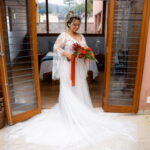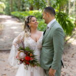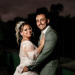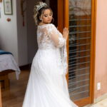 Livia tem aquela beleza tranquila e inesquecível: sorriso aberto, olhar seguro e um carisma que passa de foto em foto. Seu vestido de noiva La Modelista estilo evasê, tinha saia em camadas e cauda suave que se espalhava com leveza. O busto em V, com renda floral bordada, abraçava o colo e os ombros com elegância. As mangas longas e fluidas em renda leve, finalizadas por recortes delicados, traziam movimento encantador. O destaque fica na linda fenda, que trouxe o toque final ao modelo, surpreendendo a cada passo da noiva.