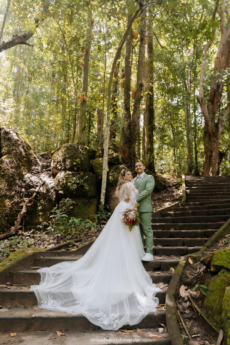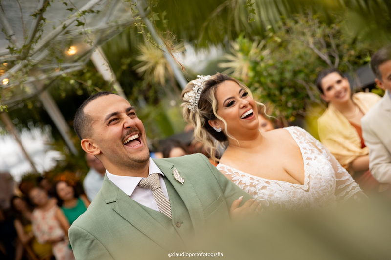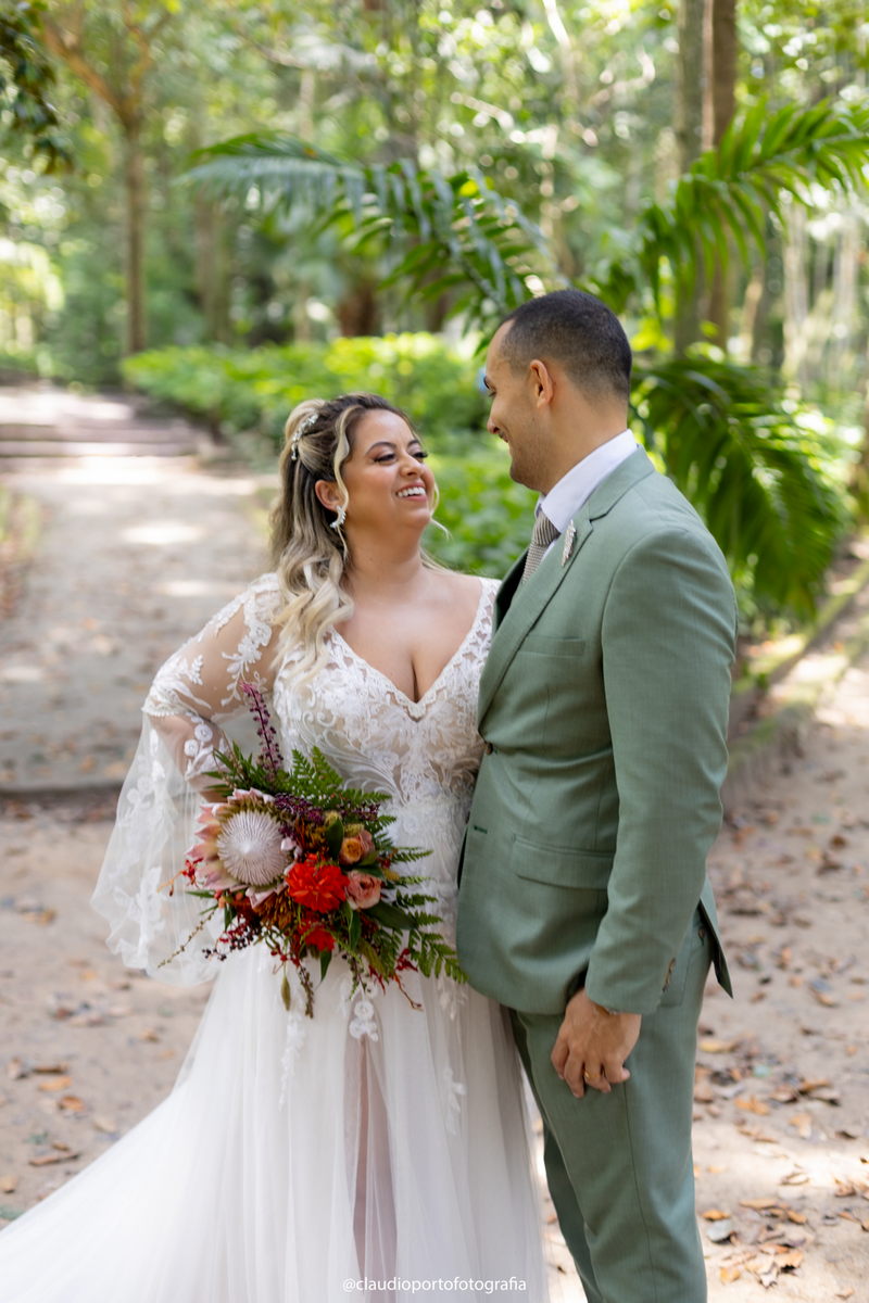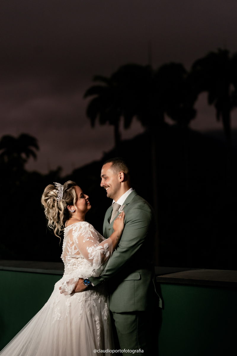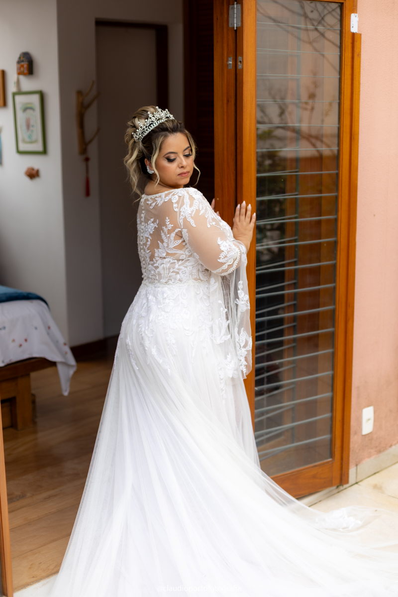 Nos detalhes, uma tiara de cristais realça o penteado preso e depois, a noiva opta por um penteado semipreso para os retratos ao ar livre. A maquiagem assinada por @marcellymenendes trouxe um visual marcante, com olhar estruturado, intensidade nos olhos e pele luminosa que se manteve impecável do início ao fim. Os registros de @claudioportofotografia foram rápidos, precisos e sensíveis, perfeitos para retratar cada momento do dia.
