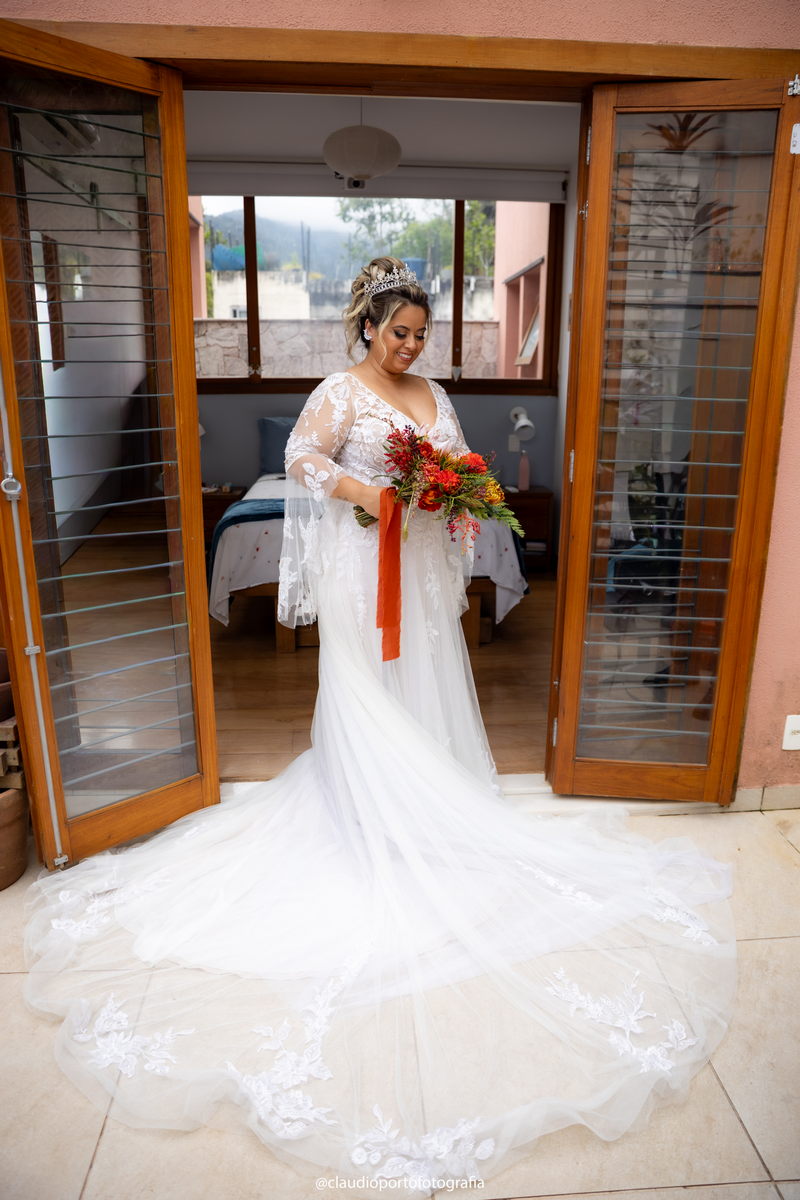 Livia tem aquela beleza tranquila e inesquecível: sorriso aberto, olhar seguro e um carisma que passa de foto em foto. Seu vestido de noiva La Modelista estilo evasê, tinha saia em camadas e cauda suave que se espalhava com leveza. O busto em V, com renda floral bordada, abraçava o colo e os ombros com elegância. As mangas longas e fluidas em renda leve, finalizadas por recortes delicados, traziam movimento encantador. O destaque fica na linda fenda, que trouxe o toque final ao modelo, surpreendendo a cada passo da noiva.