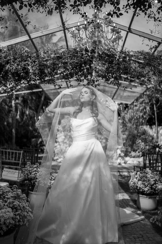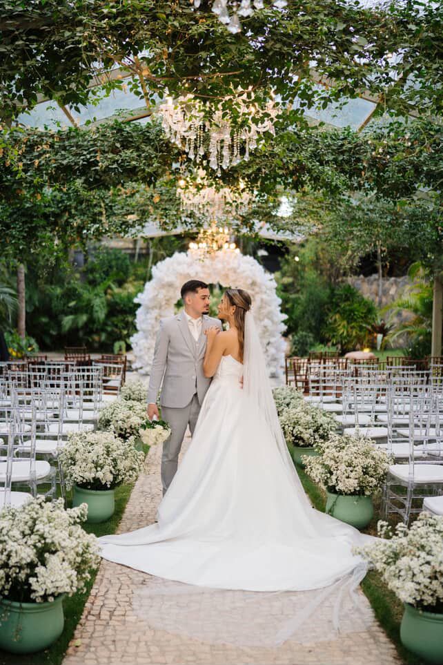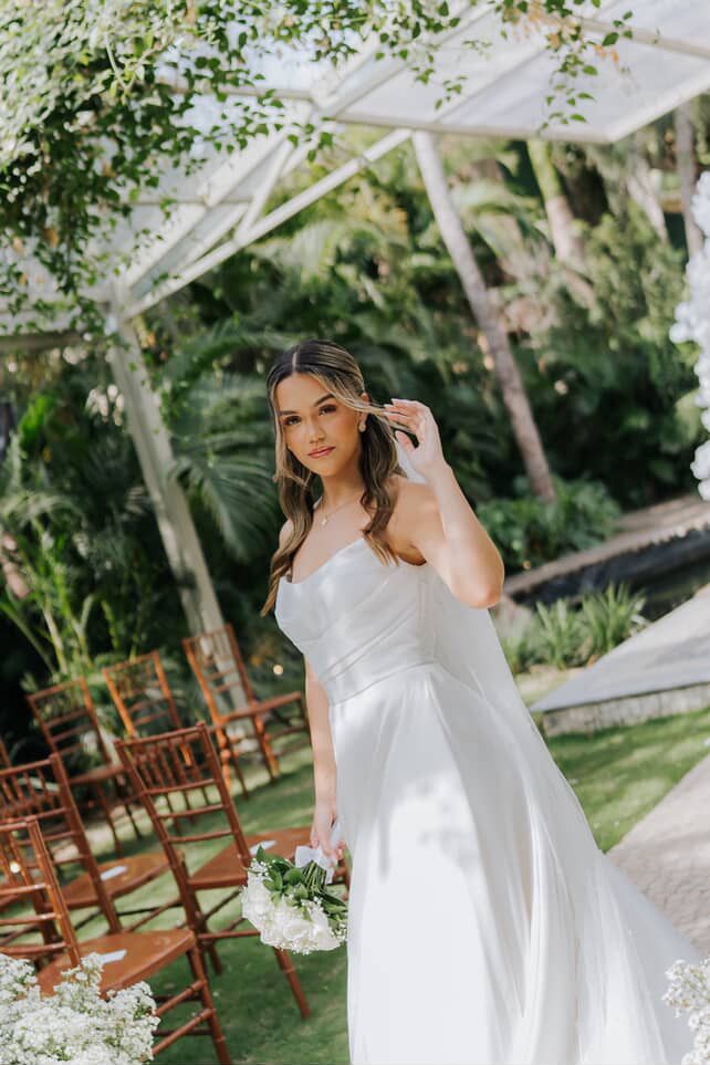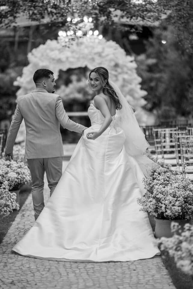 Agatha estava deslumbrante, sua beleza e seu sorriso conquistavam a todos a cada passo em direção ao altar. Seu vestido de noiva La Modelista merece um capítulo à parte. A peça era um modelo minimalista tomara-que-caia impecável, com modelagem evasê. O corpete estruturado apresentava delicadas pregas horizontais que conferiam sofisticação, enquanto a cintura marcada criava uma transição elegante para a saia volumosa. Cada detalhe do vestido realçou a beleza de Agatha, e o resultado foi simplesmente encantador.
