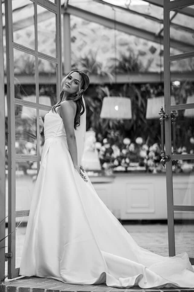 Agatha estava deslumbrante, sua beleza e seu sorriso conquistavam a todos a cada passo em direção ao altar. Seu vestido de noiva La Modelista merece um capítulo à parte. A peça era um modelo minimalista tomara-que-caia impecável, com modelagem evasê. O corpete estruturado apresentava delicadas pregas horizontais que conferiam sofisticação, enquanto a cintura marcada criava uma transição elegante para a saia volumosa. Cada detalhe do vestido realçou a beleza de Agatha, e o resultado foi simplesmente encantador.