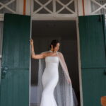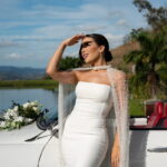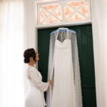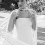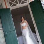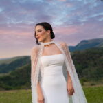 Gabi estava deslumbrante de noiva, com sua presença radiante e um sorriso iluminado. E o vestido de noiva da La Modelista foi a moldura perfeita para tanto brilho. Um modelo sereia com leve brilho, que valorizava cada curva com sofisticação, enquanto a saia se abria suavemente em uma cauda que deslizava com movimento fluido a cada passo. O decote tomara que caia, clean e atemporal, destacava o colo e os ombros da noiva com discrição elegante. Mas o verdadeiro protagonismo ficou por conta da capa de tule translúcido bordada com pérolas, que criava um efeito quase celestial. As pérolas captavam a luz natural e criavam pequenos reflexos que davam vida e movimento ao look.