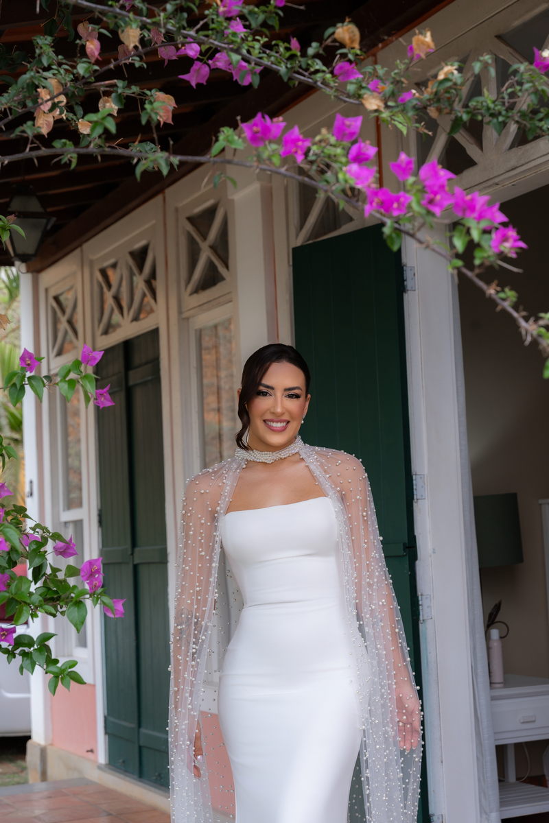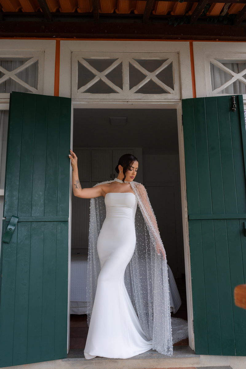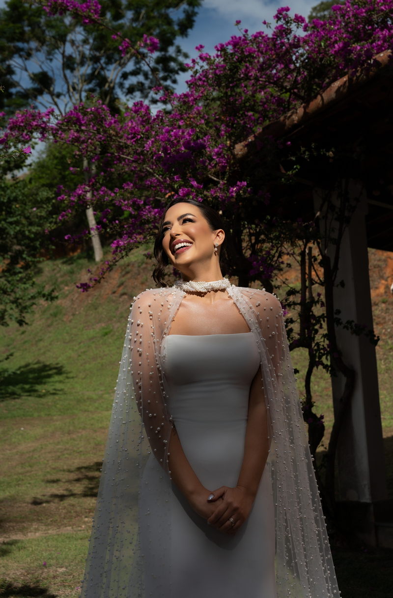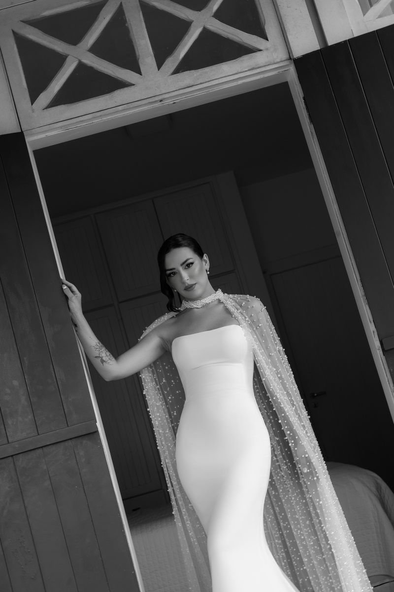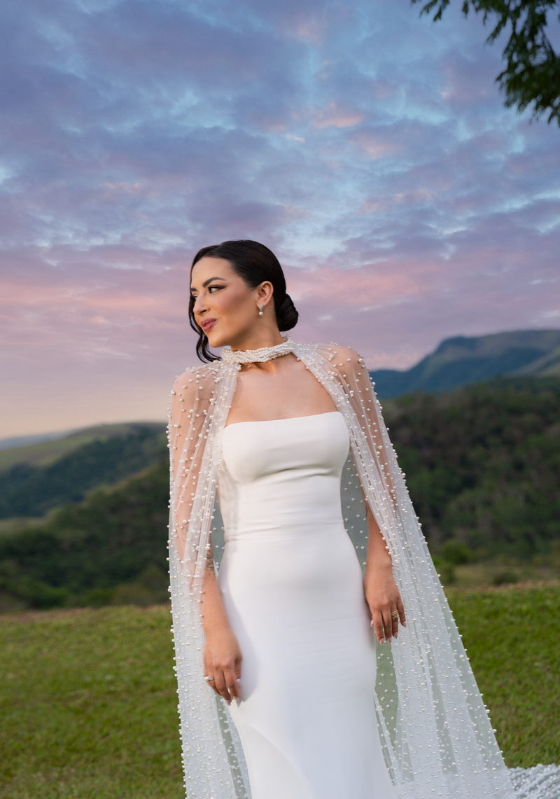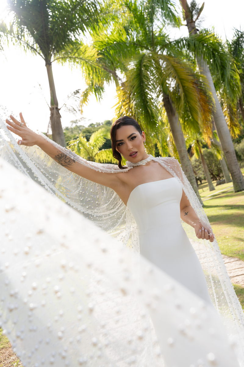 Gabi estava deslumbrante de noiva, com sua presença radiante e um sorriso iluminado. E o vestido de noiva da La Modelista foi a moldura perfeita para tanto brilho. Um modelo sereia com leve brilho, que valorizava cada curva com sofisticação, enquanto a saia se abria suavemente em uma cauda que deslizava com movimento fluido a cada passo. O decote tomara que caia, clean e atemporal, destacava o colo e os ombros da noiva com discrição elegante. Mas o verdadeiro protagonismo ficou por conta da capa de tule translúcido bordada com pérolas, que criava um efeito quase celestial. As pérolas captavam a luz natural e criavam pequenos reflexos que davam vida e movimento ao look.