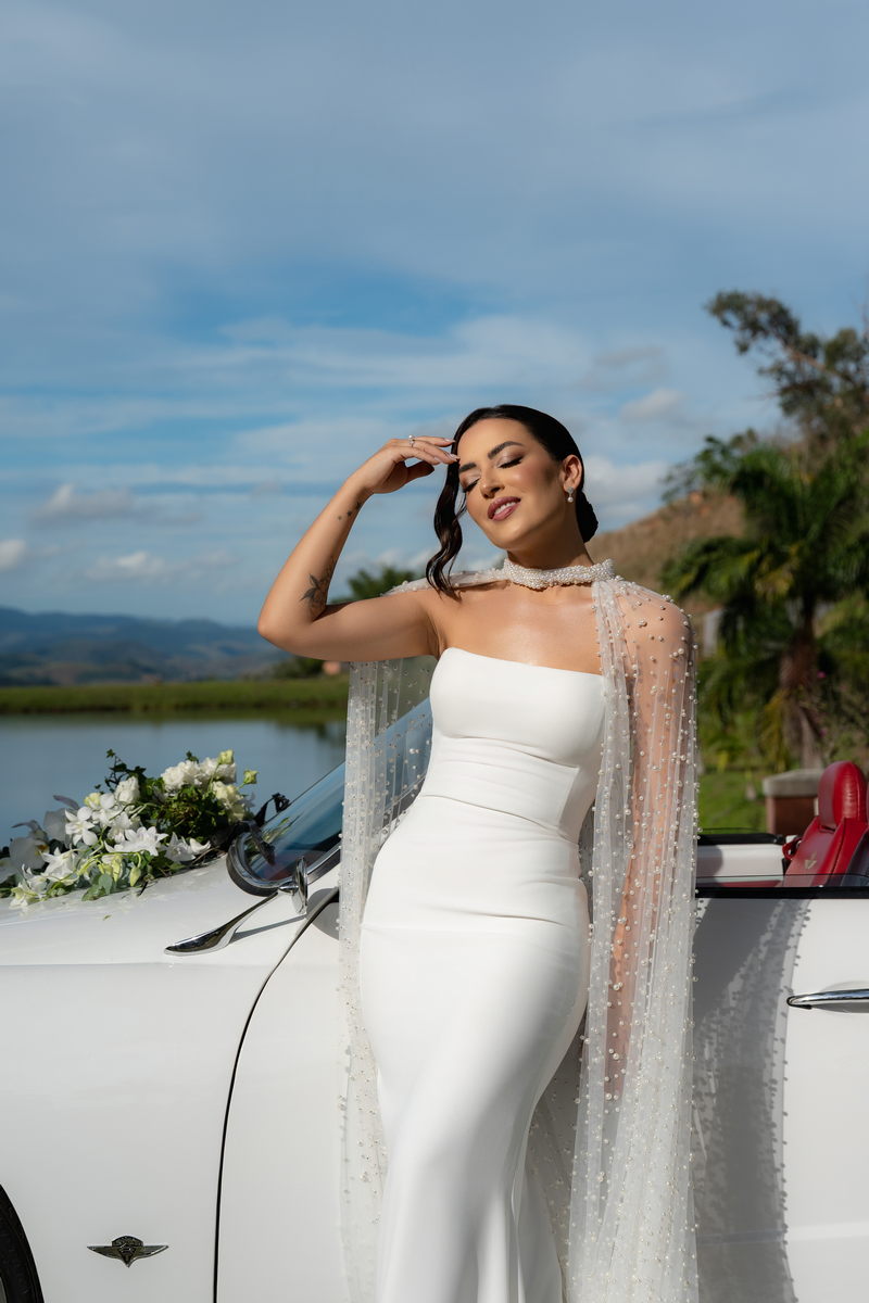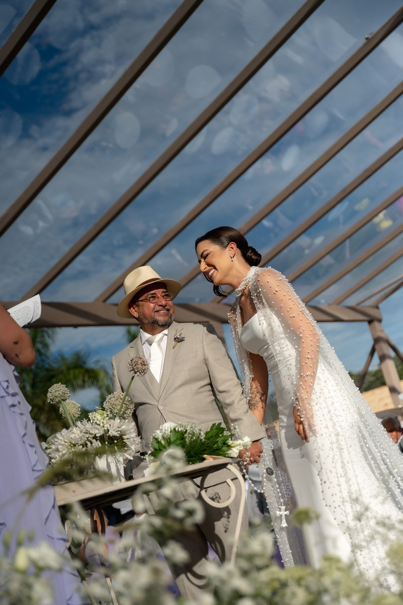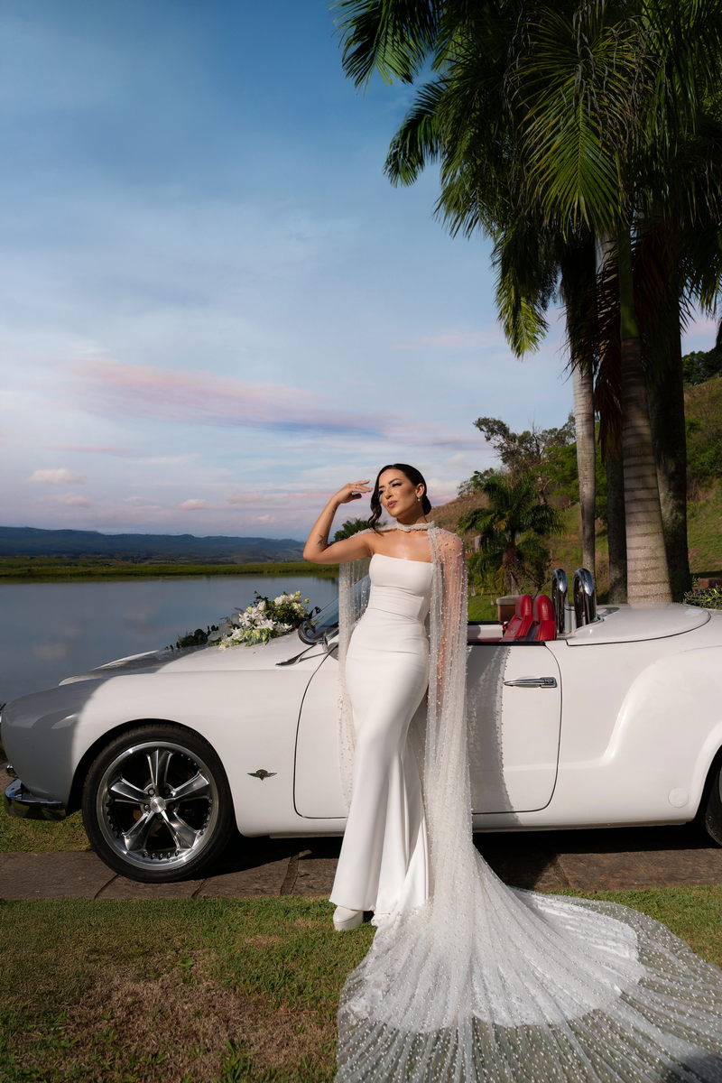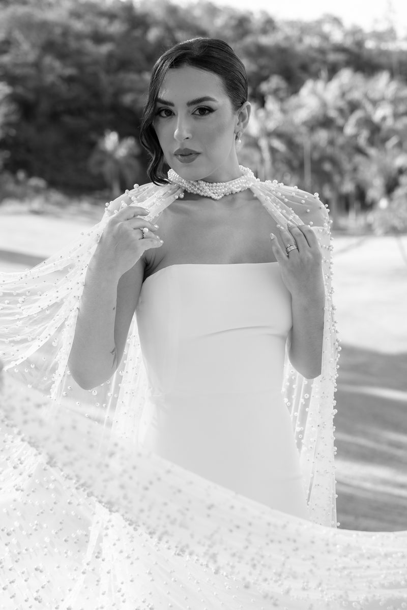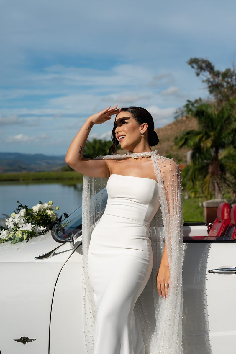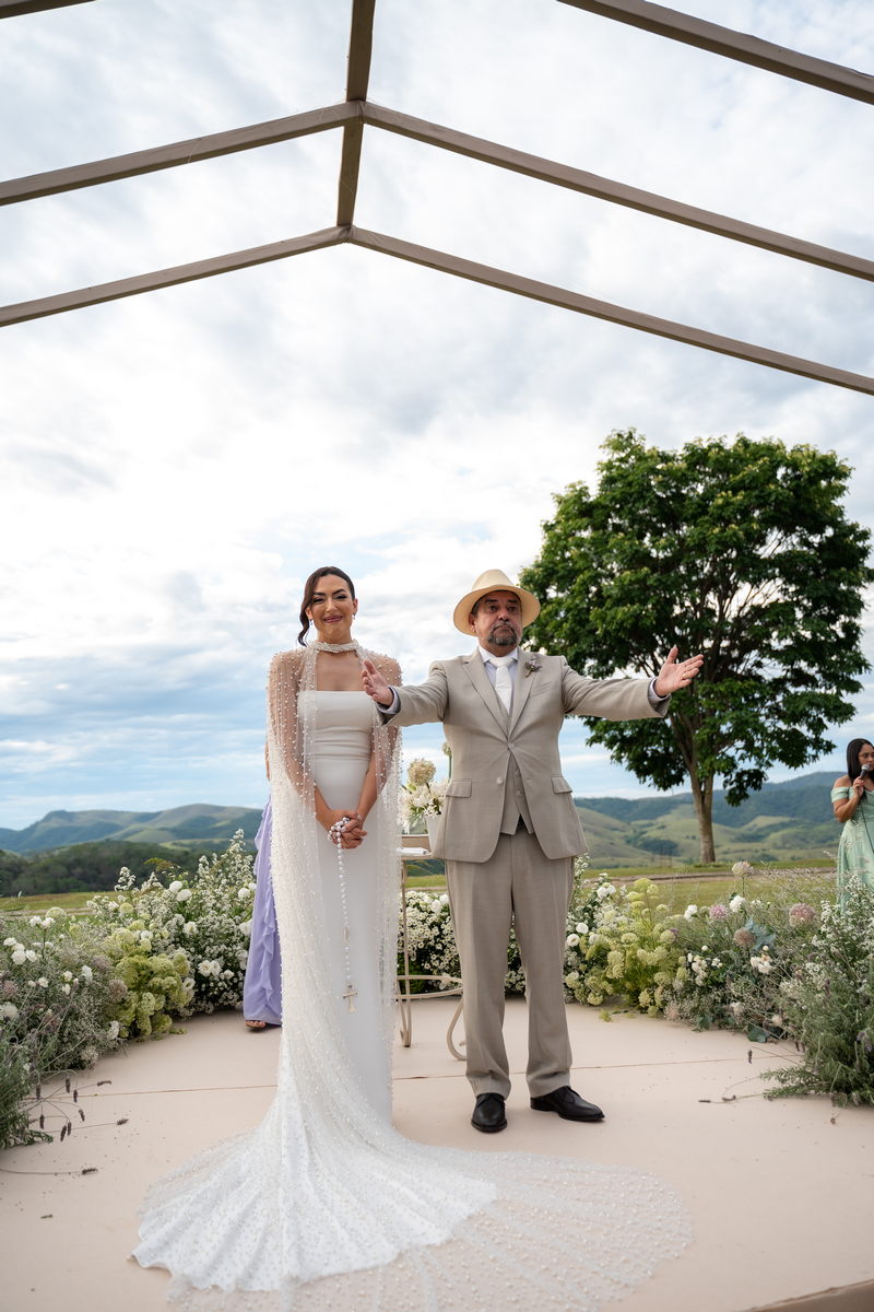 Gabi estava deslumbrante de noiva, com sua presença radiante e um sorriso iluminado. E o vestido de noiva da La Modelista foi a moldura perfeita para tanto brilho. Um modelo sereia com leve brilho, que valorizava cada curva com sofisticação, enquanto a saia se abria suavemente em uma cauda que deslizava com movimento fluido a cada passo. O decote tomara que caia, clean e atemporal, destacava o colo e os ombros da noiva com discrição elegante. Mas o verdadeiro protagonismo ficou por conta da capa de tule translúcido bordada com pérolas, que criava um efeito quase celestial. As pérolas captavam a luz natural e criavam pequenos reflexos que davam vida e movimento ao look.