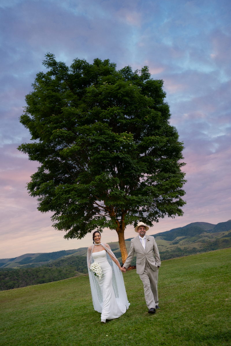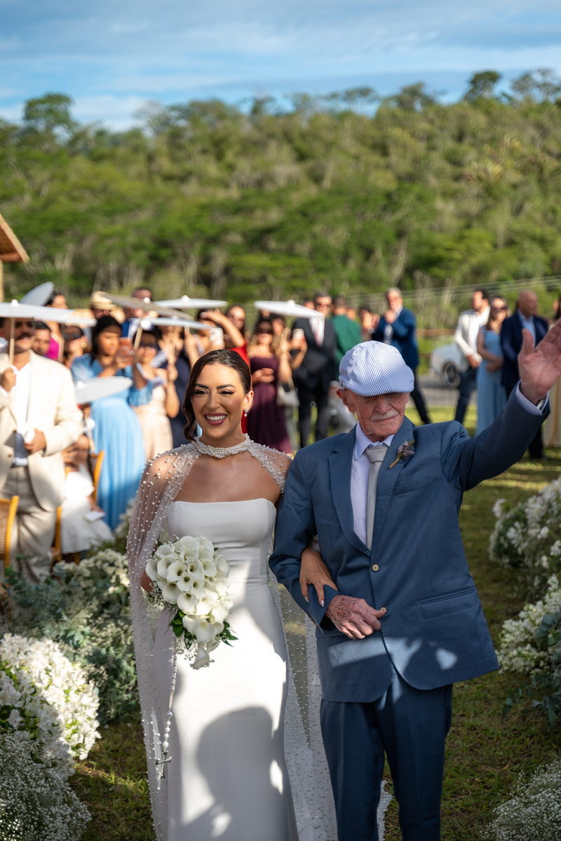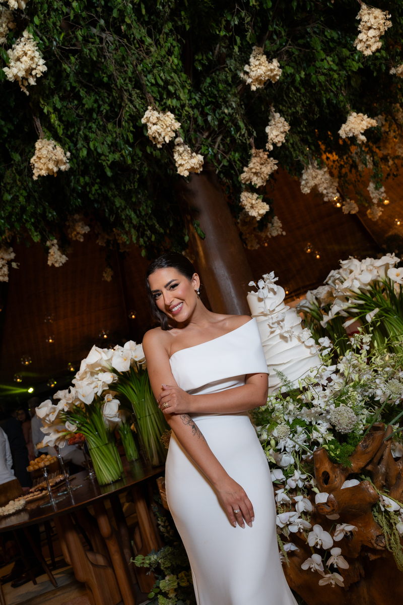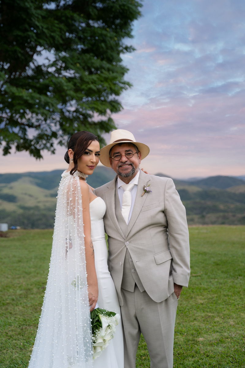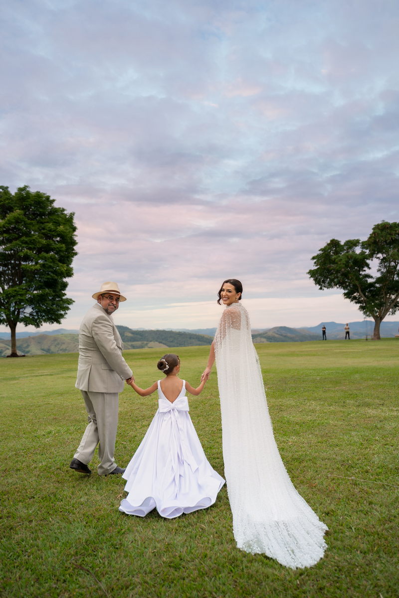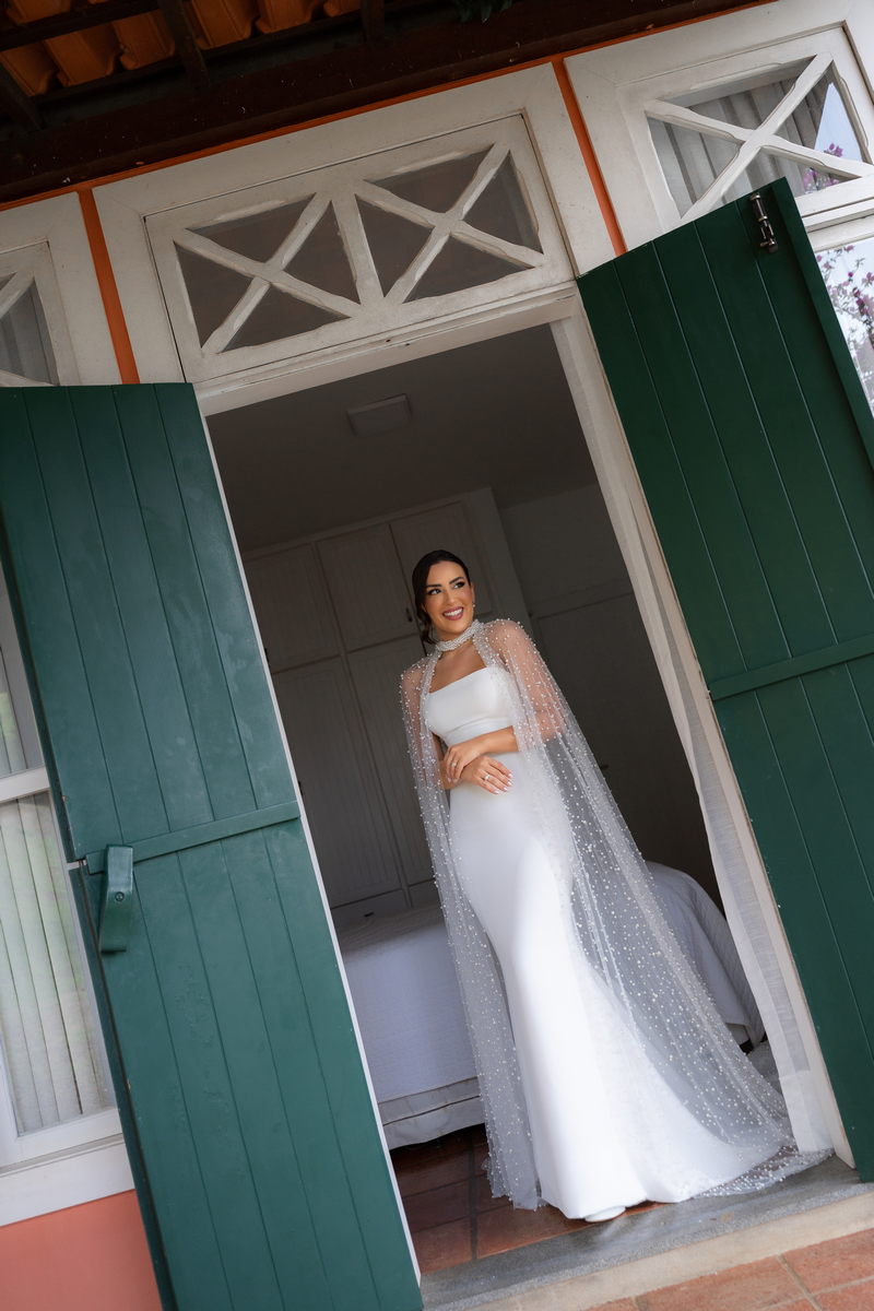 Gabi estava deslumbrante de noiva, com sua presença radiante e um sorriso iluminado. E o vestido de noiva da La Modelista foi a moldura perfeita para tanto brilho. Um modelo sereia com leve brilho, que valorizava cada curva com sofisticação, enquanto a saia se abria suavemente em uma cauda que deslizava com movimento fluido a cada passo. O decote tomara que caia, clean e atemporal, destacava o colo e os ombros da noiva com discrição elegante. Mas o verdadeiro protagonismo ficou por conta da capa de tule translúcido bordada com pérolas, que criava um efeito quase celestial. As pérolas captavam a luz natural e criavam pequenos reflexos que davam vida e movimento ao look.