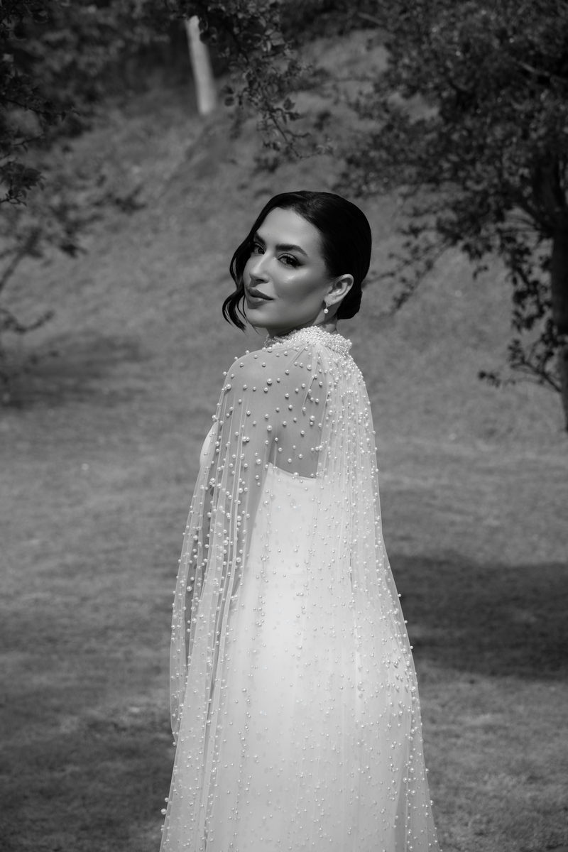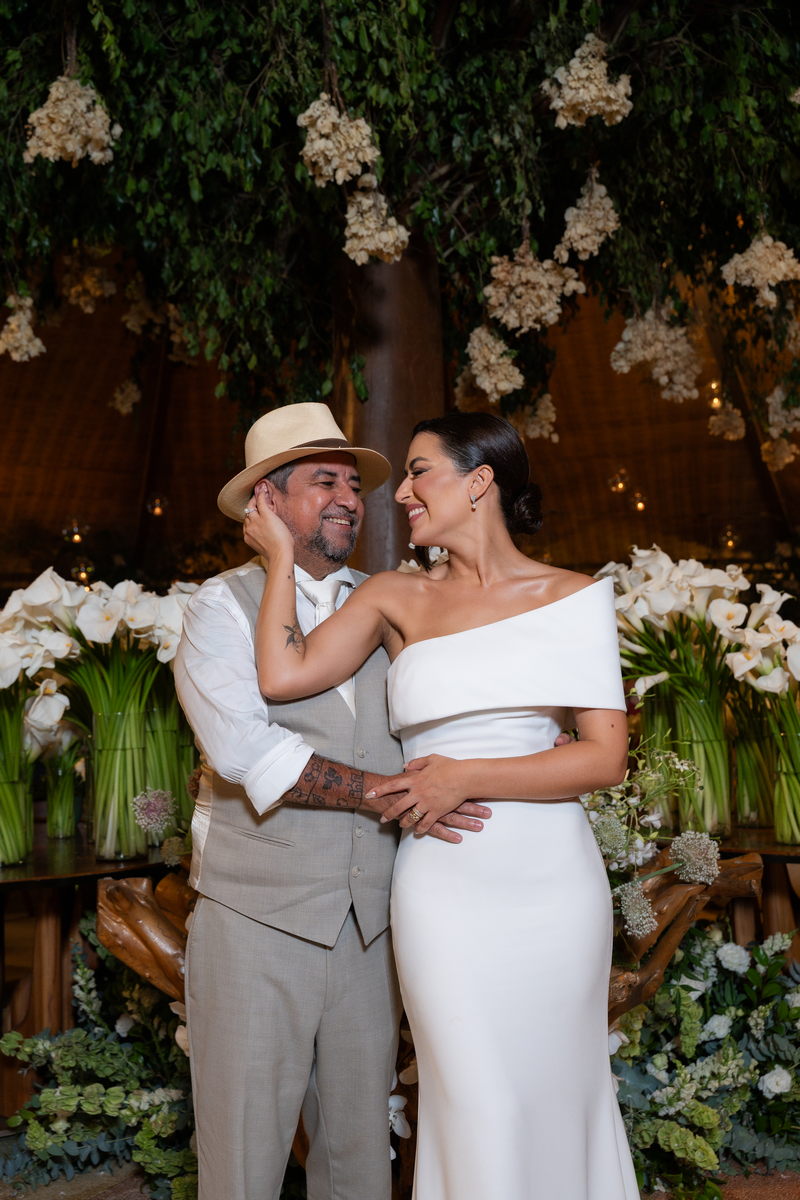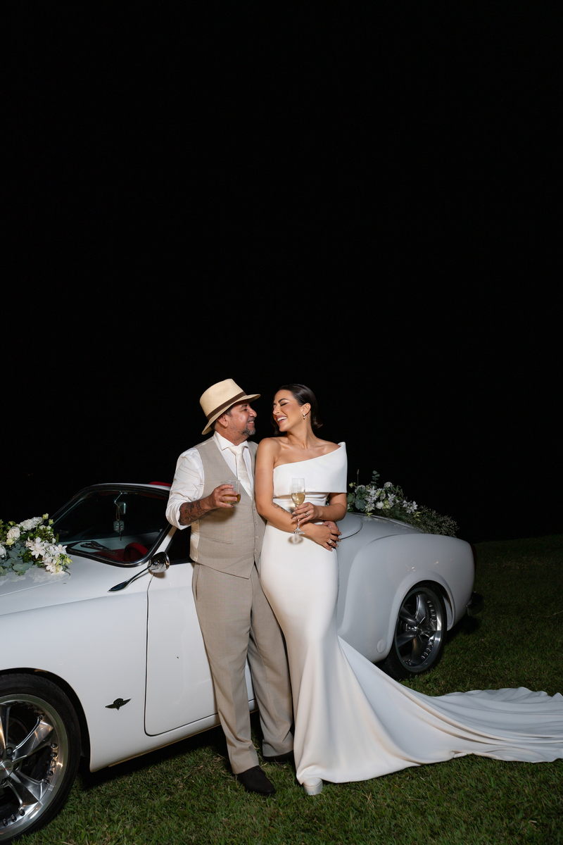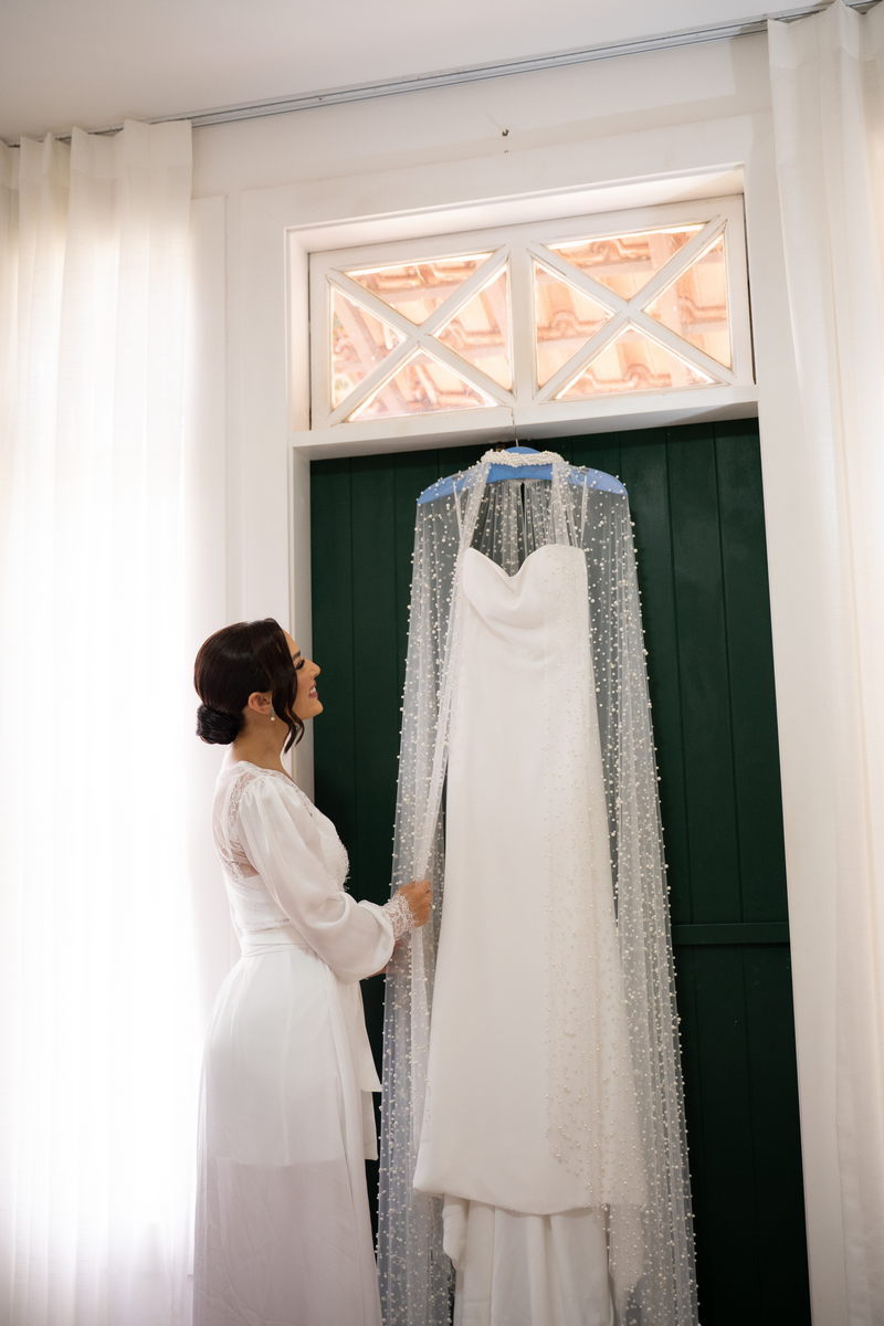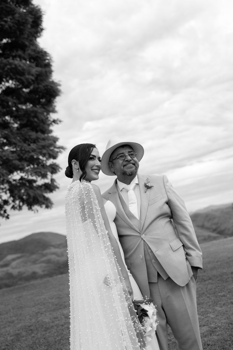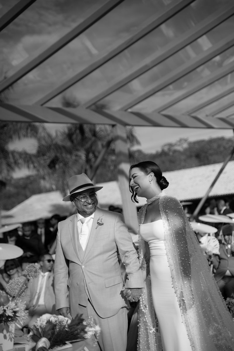Gabi estava deslumbrante de noiva, com sua presença radiante e um sorriso iluminado. E o vestido de noiva da La Modelista foi a moldura perfeita para tanto brilho. Um modelo sereia com leve brilho, que valorizava cada curva com sofisticação, enquanto a saia se abria suavemente em uma cauda que deslizava com movimento fluido a cada passo. O decote tomara que caia, clean e atemporal, destacava o colo e os ombros da noiva com discrição elegante. Mas o verdadeiro protagonismo ficou por conta da capa de tule translúcido bordada com pérolas, que criava um efeito quase celestial. As pérolas captavam a luz natural e criavam pequenos reflexos que davam vida e movimento ao look.