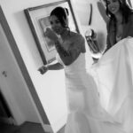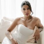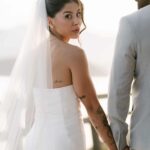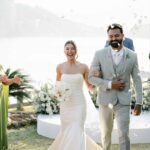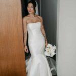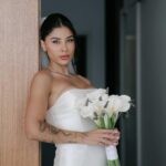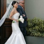 Thay estava simplesmente deslumbrante como noiva. O sorriso iluminado, os olhos brilhando de felicidade e aquela naturalidade encantadora fizeram dela o centro absoluto de todas as atenções. E o vestido de noiva? Um sonho assinado pela La Modelista, na modelagem sereia que valorizou cada curva com elegância. O corpete tomara que caia trazia um caimento impecável, justo ao corpo, enquanto a saia se abria em volume dramático a partir dos joelhos, criando aquela silhueta sofisticada e atemporal que é marca registrada desse estilo. Era um vestido feito para brilhar e a noiva brilhou lindamente.