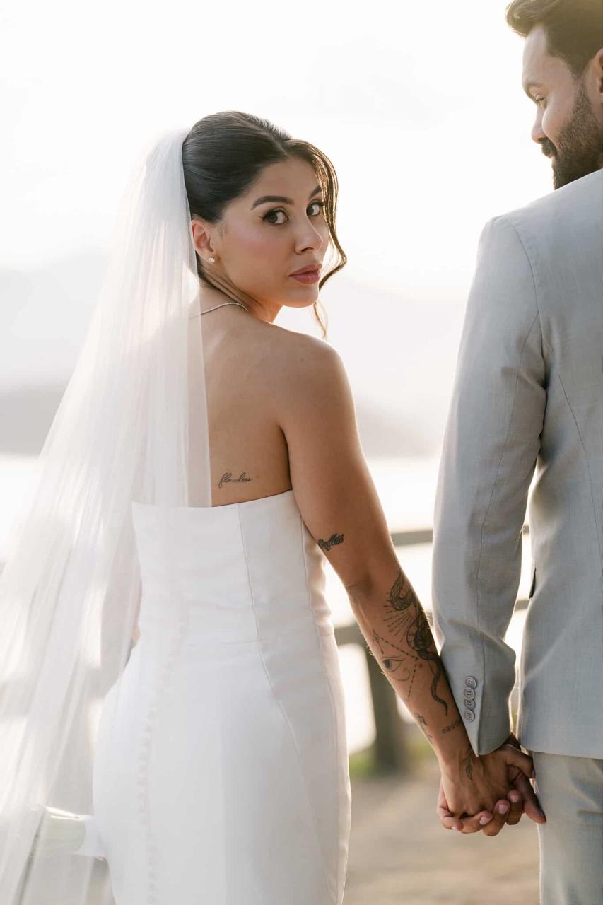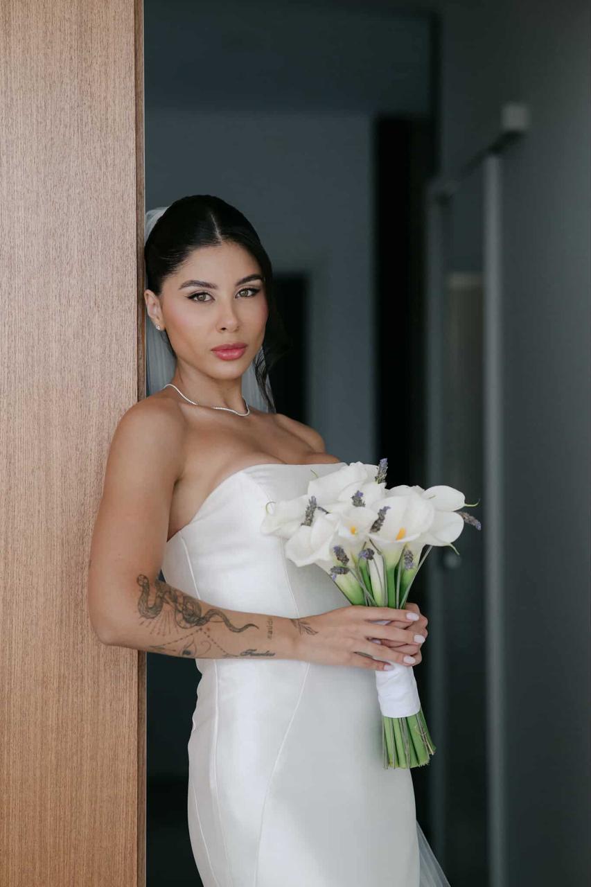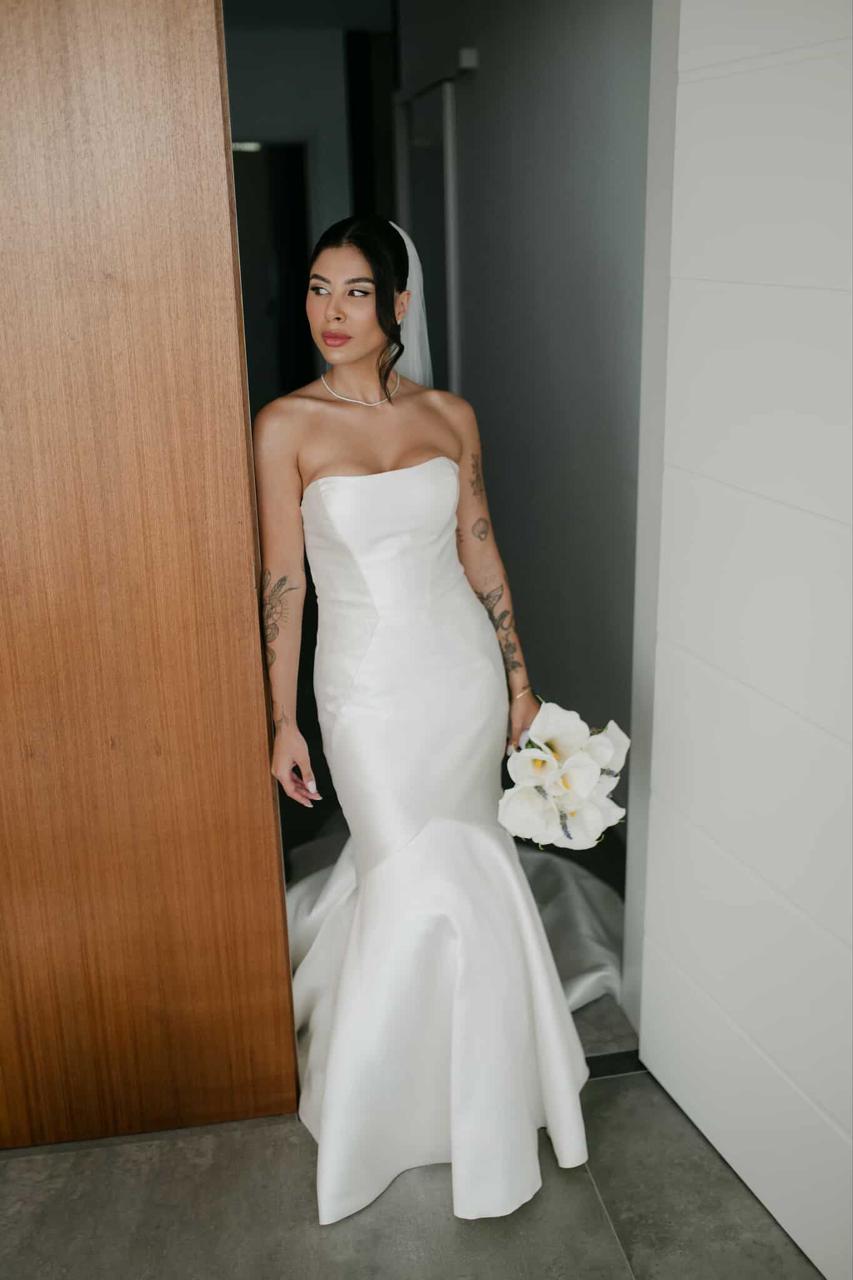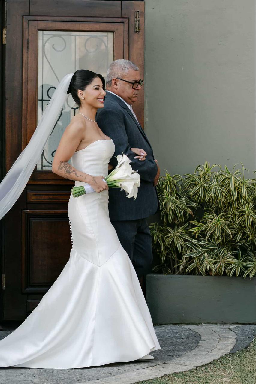 Thay estava simplesmente deslumbrante como noiva. O sorriso iluminado, os olhos brilhando de felicidade e aquela naturalidade encantadora fizeram dela o centro absoluto de todas as atenções. E o vestido de noiva? Um sonho assinado pela La Modelista, na modelagem sereia que valorizou cada curva com elegância. O corpete tomara que caia trazia um caimento impecável, justo ao corpo, enquanto a saia se abria em volume dramático a partir dos joelhos, criando aquela silhueta sofisticada e atemporal que é marca registrada desse estilo. Era um vestido feito para brilhar e a noiva brilhou lindamente.