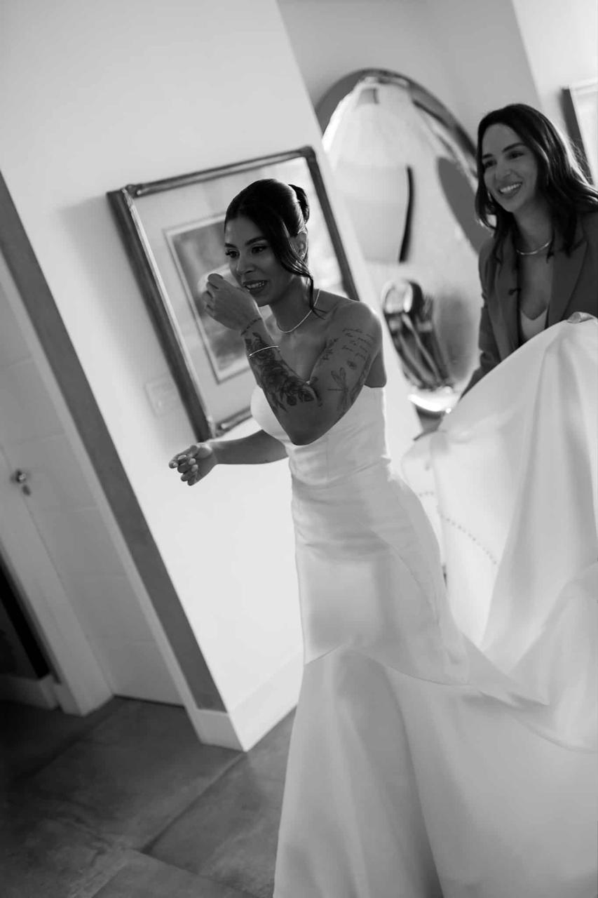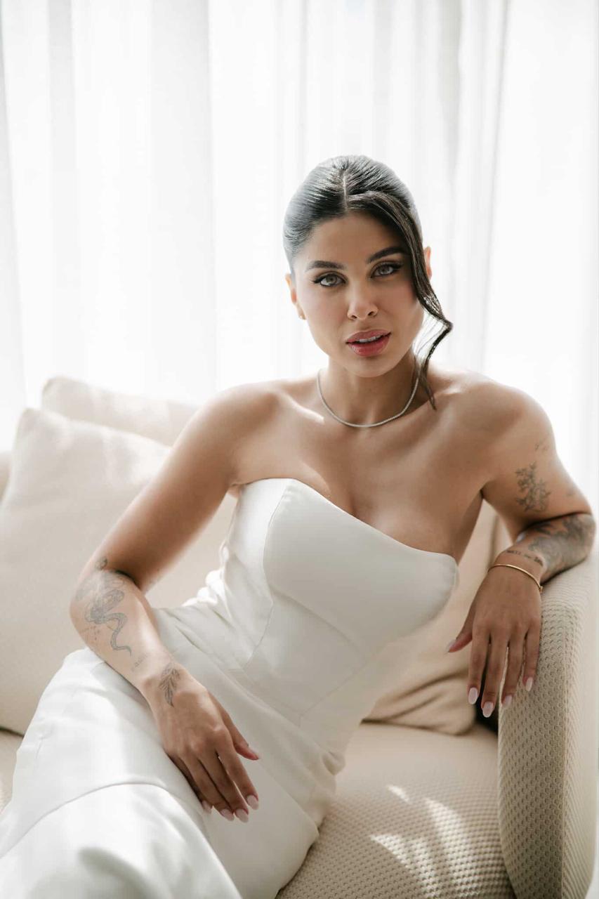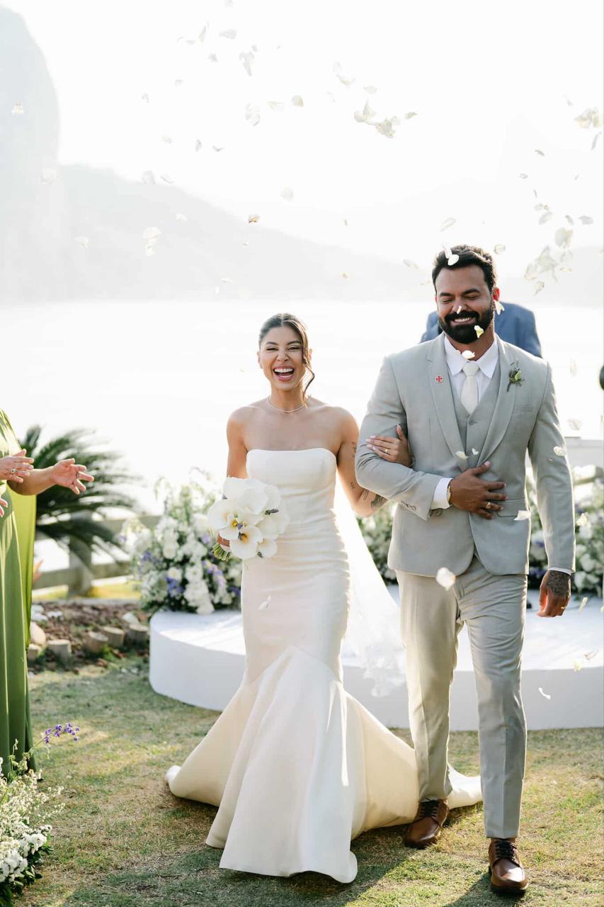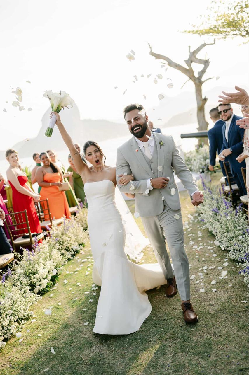 Thay estava simplesmente deslumbrante como noiva. O sorriso iluminado, os olhos brilhando de felicidade e aquela naturalidade encantadora fizeram dela o centro absoluto de todas as atenções. E o vestido de noiva? Um sonho assinado pela La Modelista, na modelagem sereia que valorizou cada curva com elegância. O corpete tomara que caia trazia um caimento impecável, justo ao corpo, enquanto a saia se abria em volume dramático a partir dos joelhos, criando aquela silhueta sofisticada e atemporal que é marca registrada desse estilo. Era um vestido feito para brilhar e a noiva brilhou lindamente.