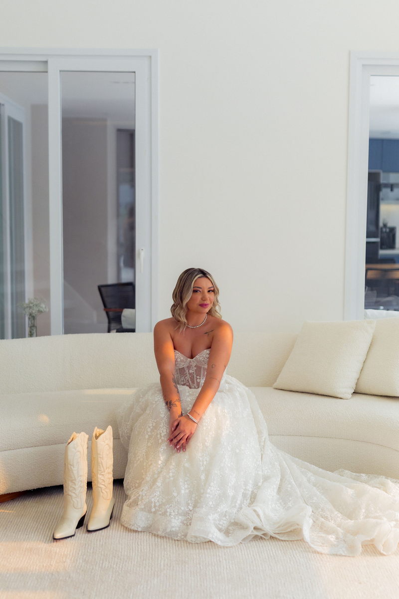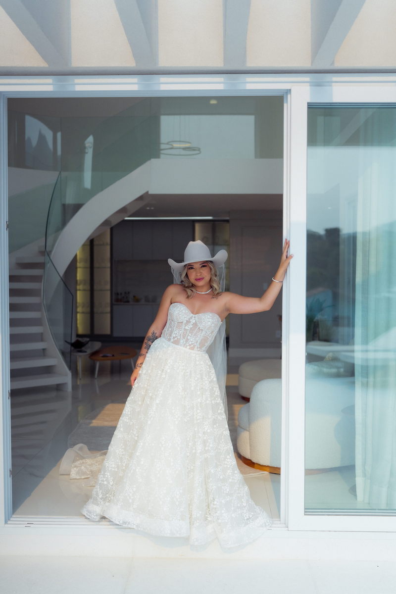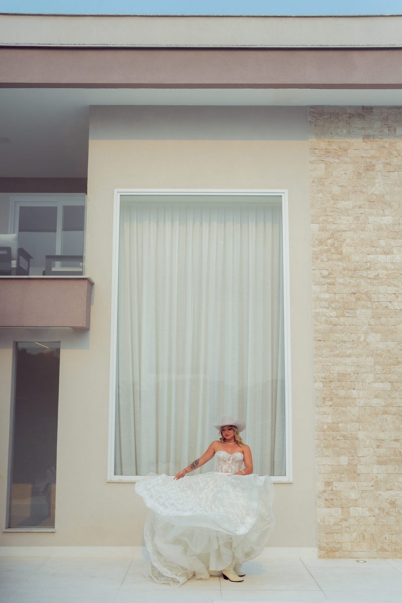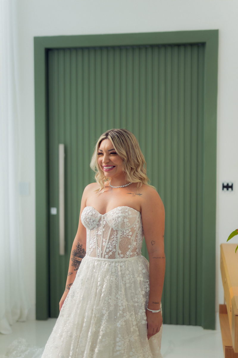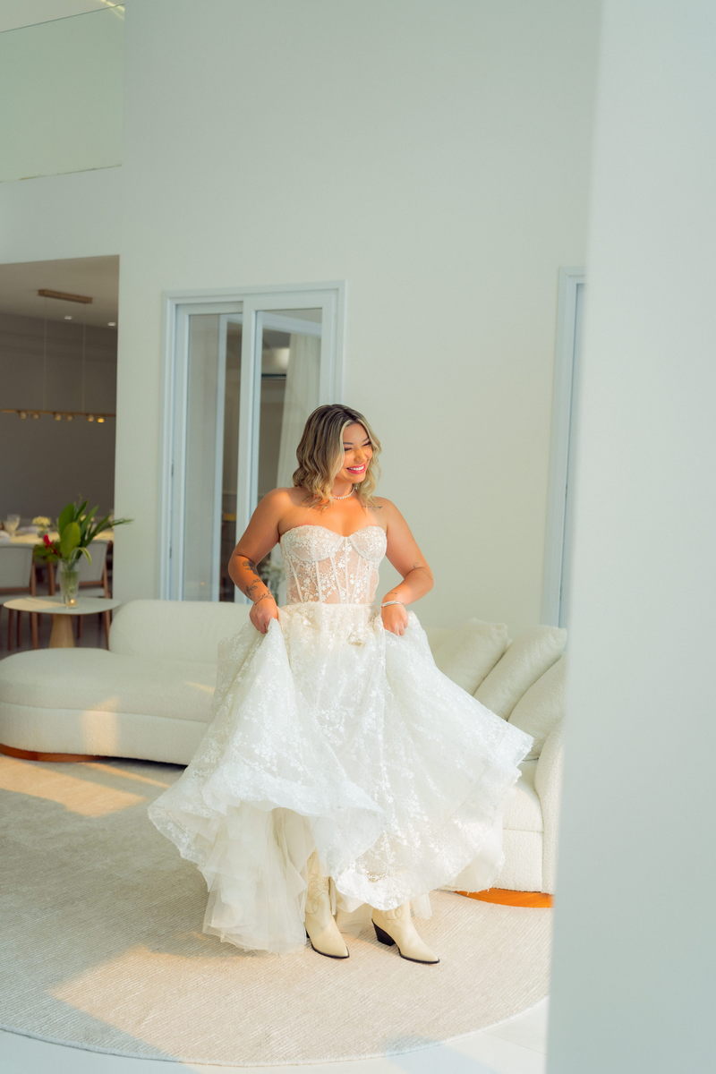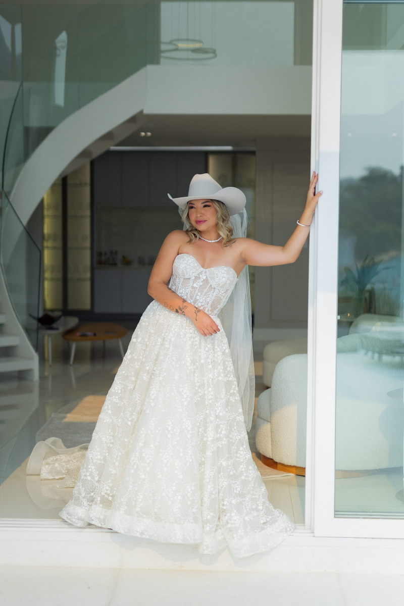 Grace estava deslumbrante em seu vestido de noiva da La Modelista, com design sofisticado e lindos detalhes em renda e transparências. O modelo tomara que caia estilo princesa era todo rendado e com uma saia perfeita. O toque moderno do chapéu e das botas complementou o visual, refletindo perfeitamente a personalidade única da noiva. A maquiagem, feita por Yasmim Lopes, realçou a beleza natural da noiva, finalizando o look de forma impecável!
