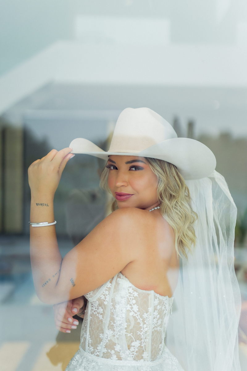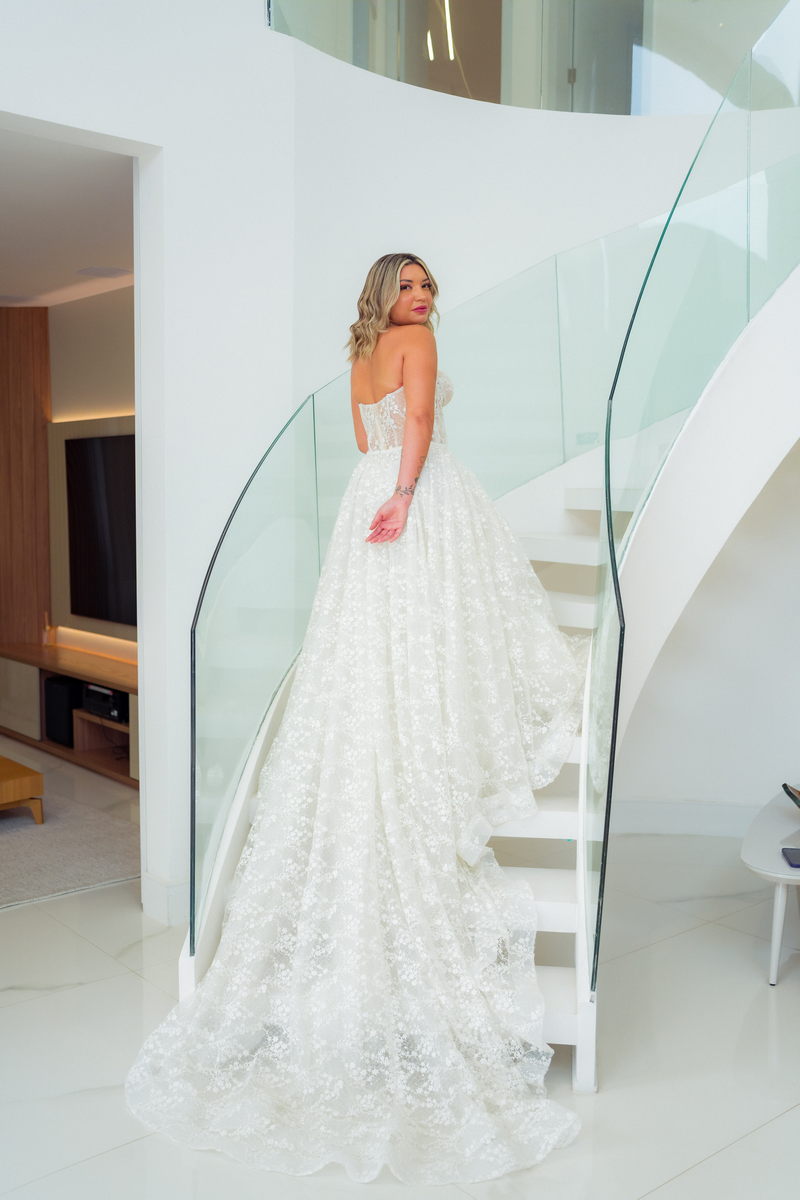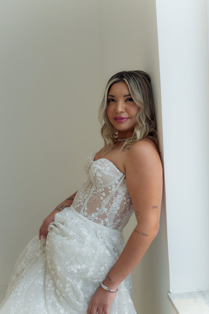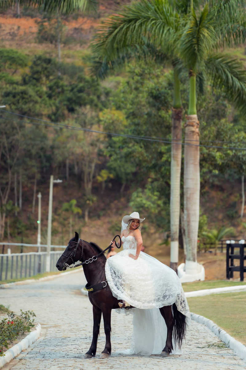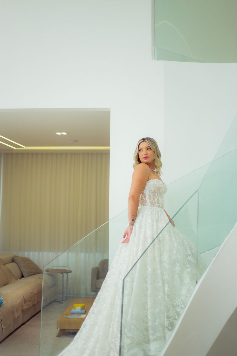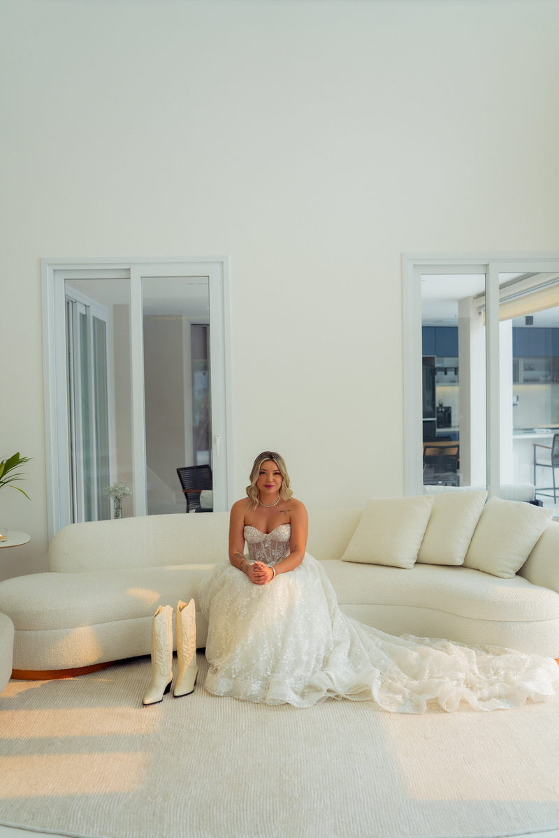 Grace estava deslumbrante em seu vestido de noiva da La Modelista, com design sofisticado e lindos detalhes em renda e transparências. O modelo tomara que caia estilo princesa era todo rendado e com uma saia perfeita. O toque moderno do chapéu e das botas complementou o visual, refletindo perfeitamente a personalidade única da noiva. A maquiagem, feita por Yasmim Lopes, realçou a beleza natural da noiva, finalizando o look de forma impecável!