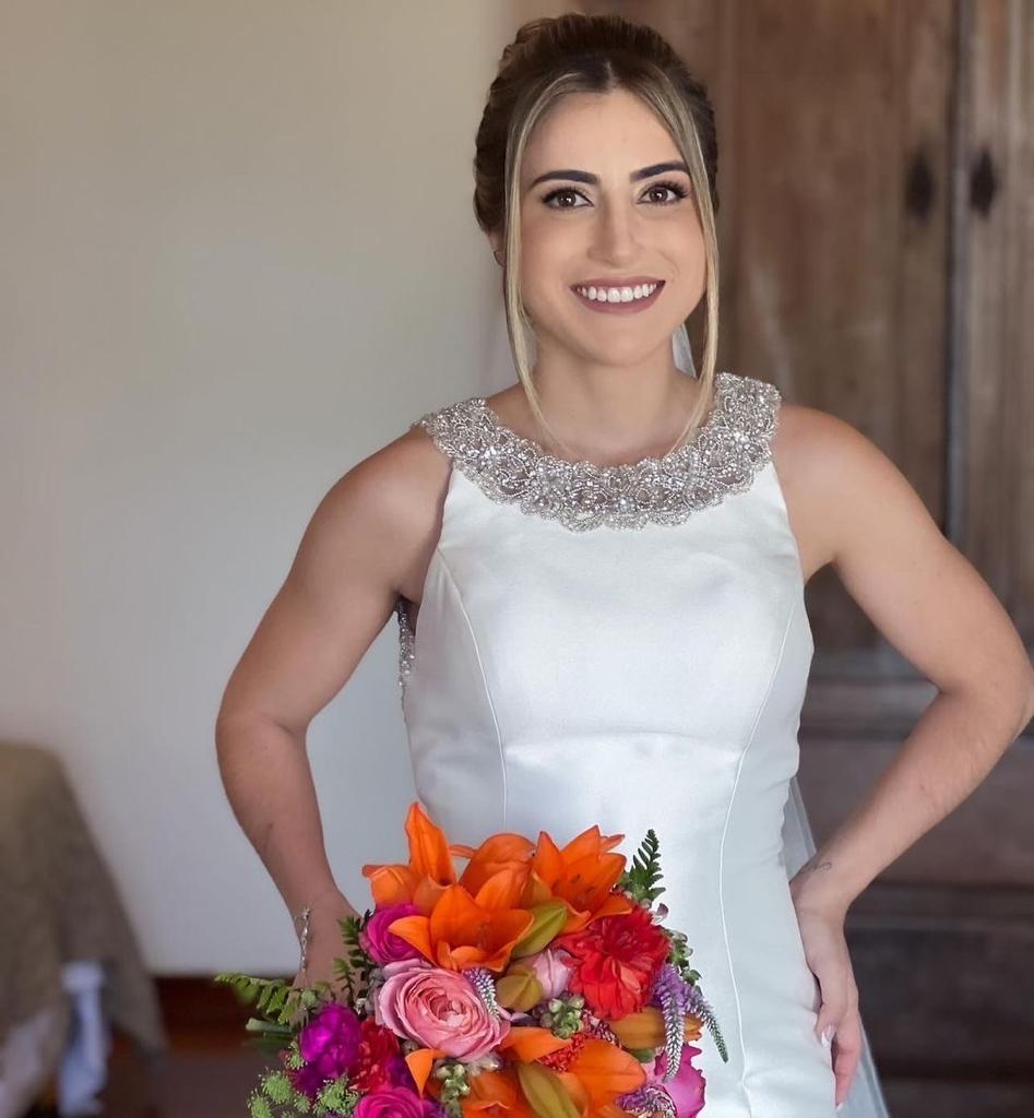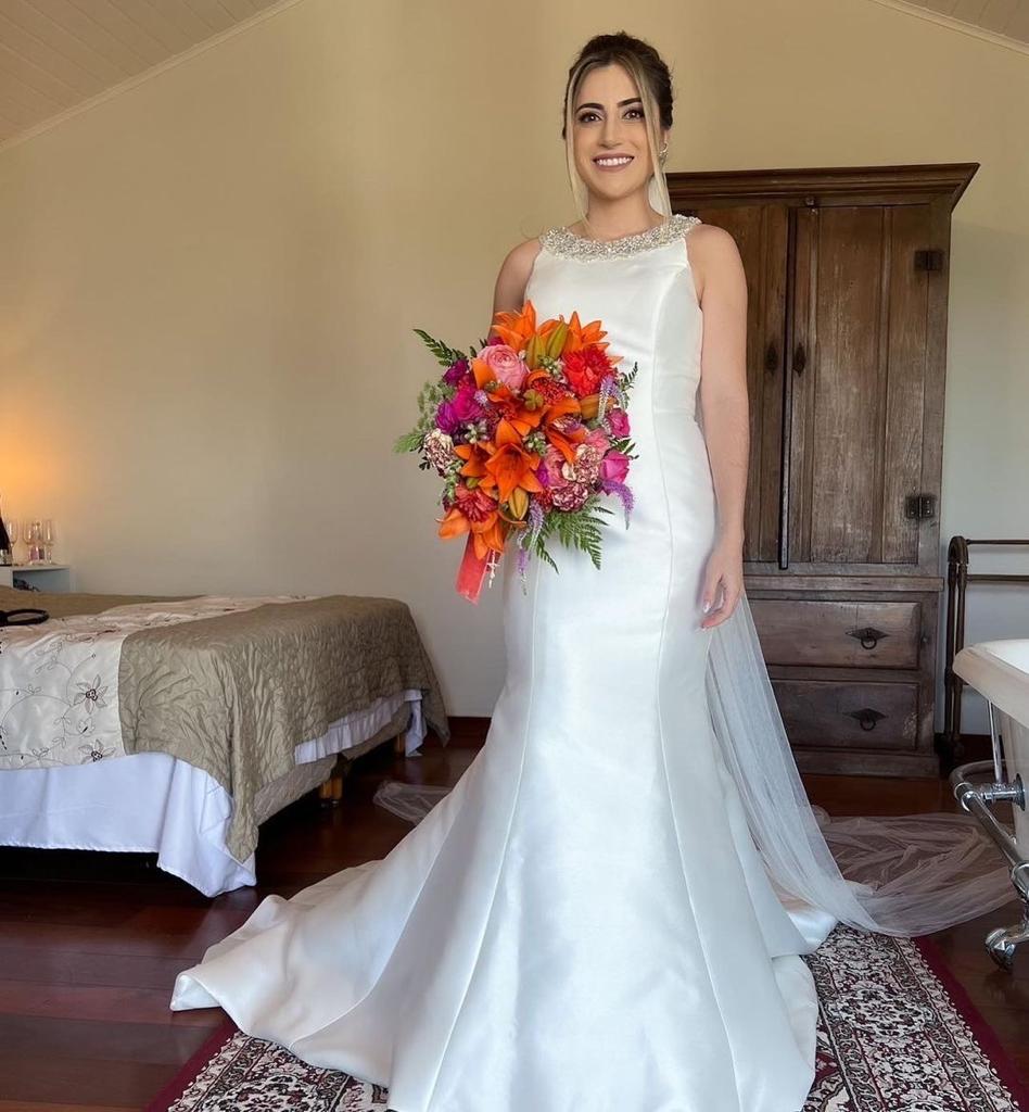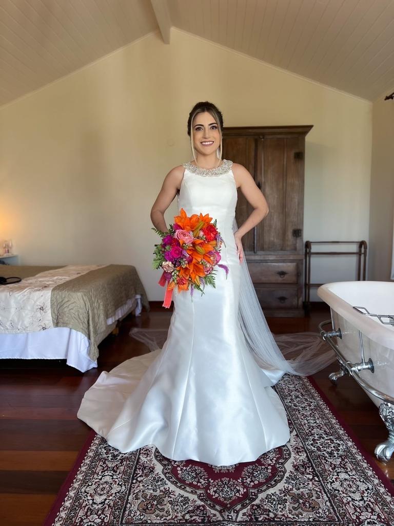 Um vestido com detalhe incrível nas costas, trabalho em pedrarias, que deu todo esse charme ao look. O tecido e a modelagem realçaram a beleza da noiva, que também optou por um penteado clássico e um buquê de flores bem alegre!