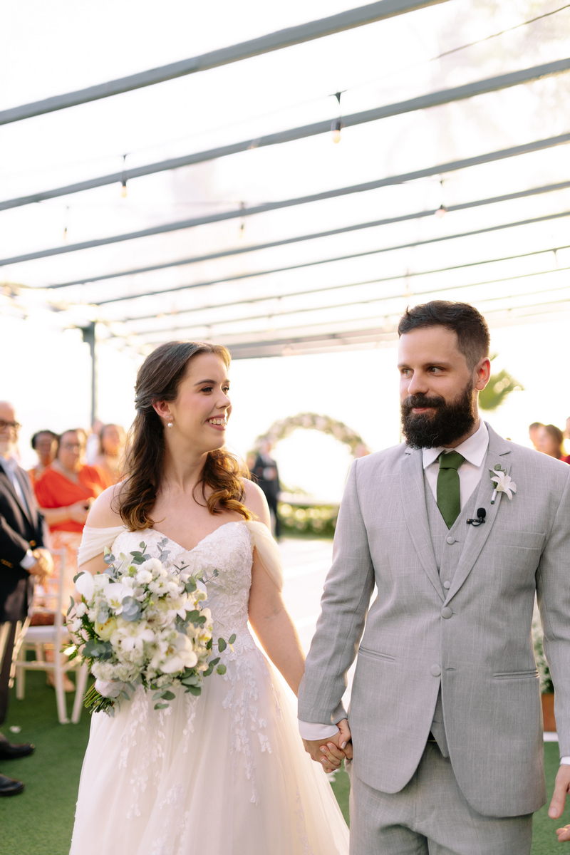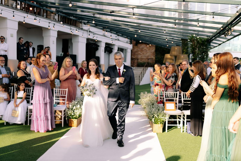 O casal optou por um casamento ao ar livre no Espaço Barcelona, um ambiente íntimo e aconchegante, onde os convidados foram acolhidos por uma atmosfera de serenidade e harmonia. A beleza natural do espaço se uniu à decoração cuidadosamente planejada, criando um cenário de conto de fadas para celebrar o amor em sua forma mais genuína e pura.