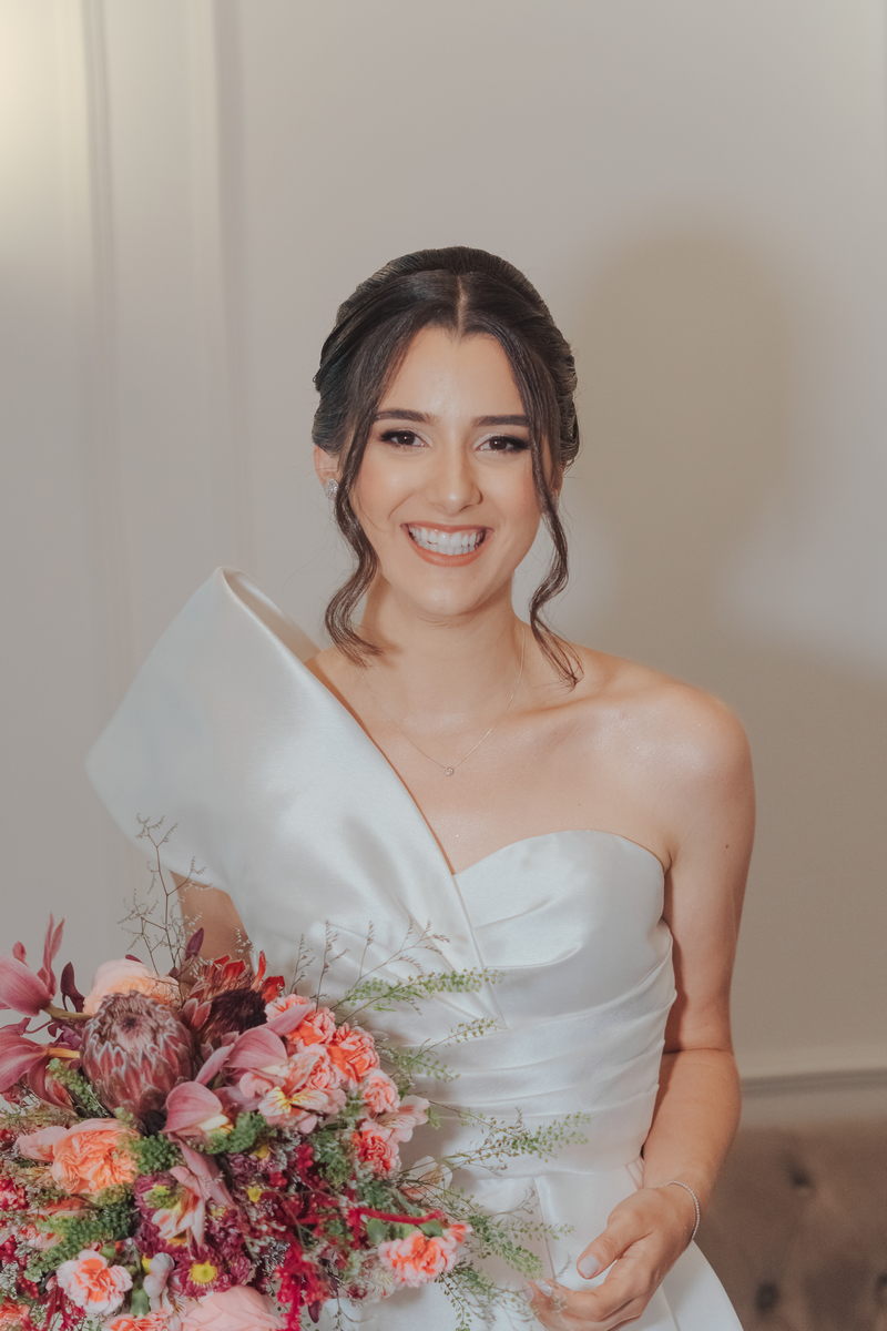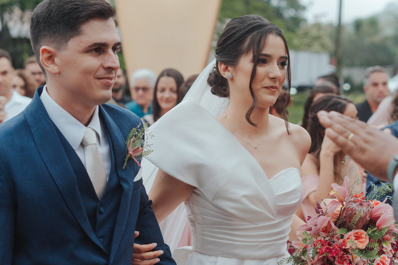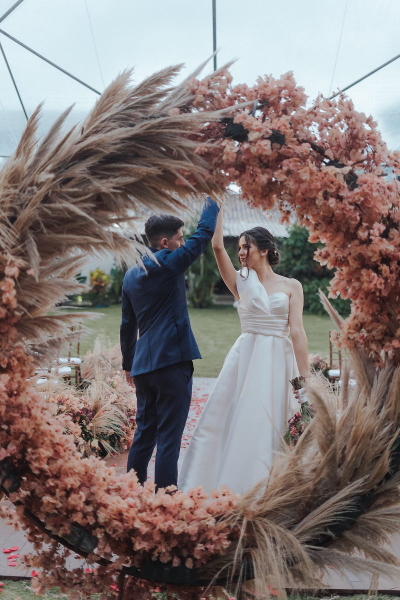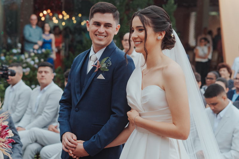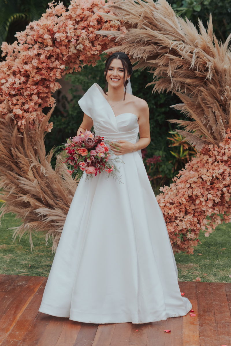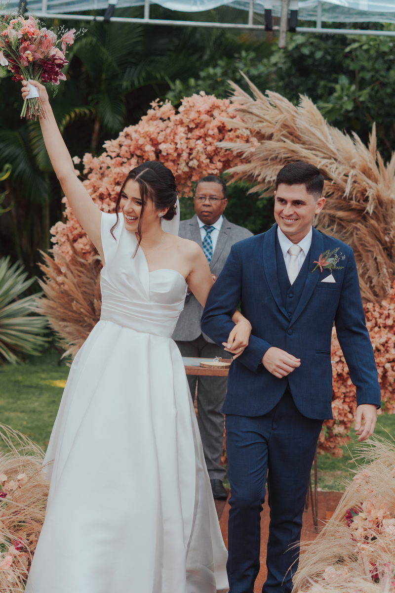 Cada cantinho da festa ficou perfeito, mas temos certeza que o que mais destacou em todo casamento foi a beleza da Fernanda. O vestido de noiva La modelista minimalista com uma manga super diferenciada, trouxe uma elegância única ao look, e combinou perfeitamente com o penteado e maquiagem, sem falar no buquê maravilhoso.