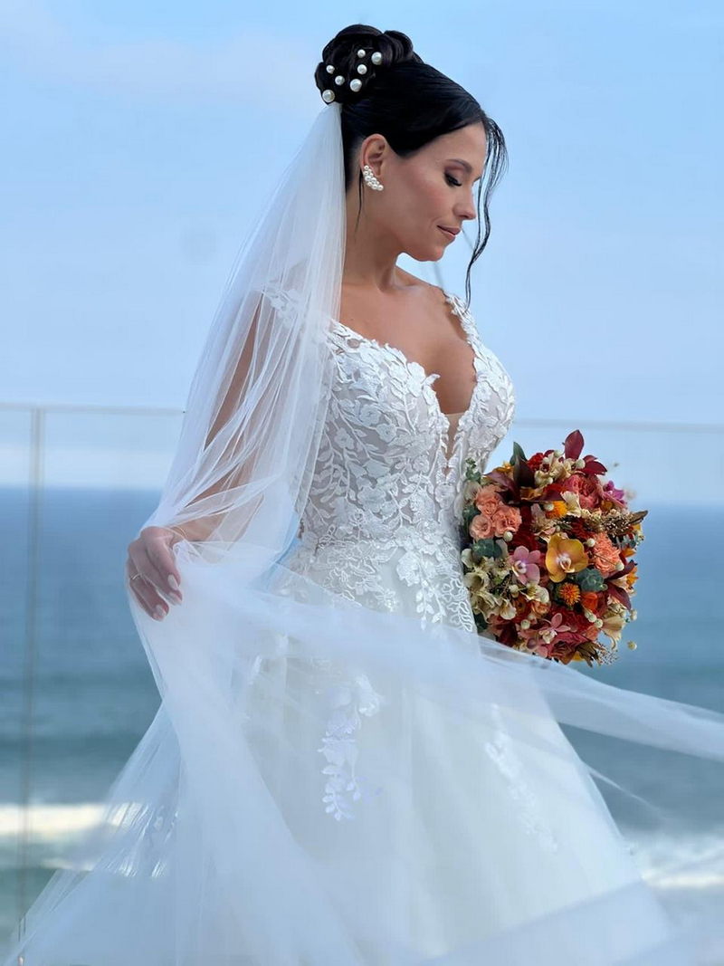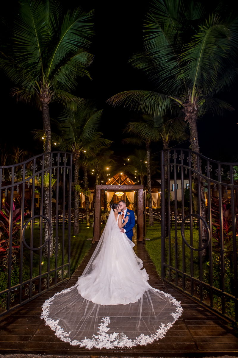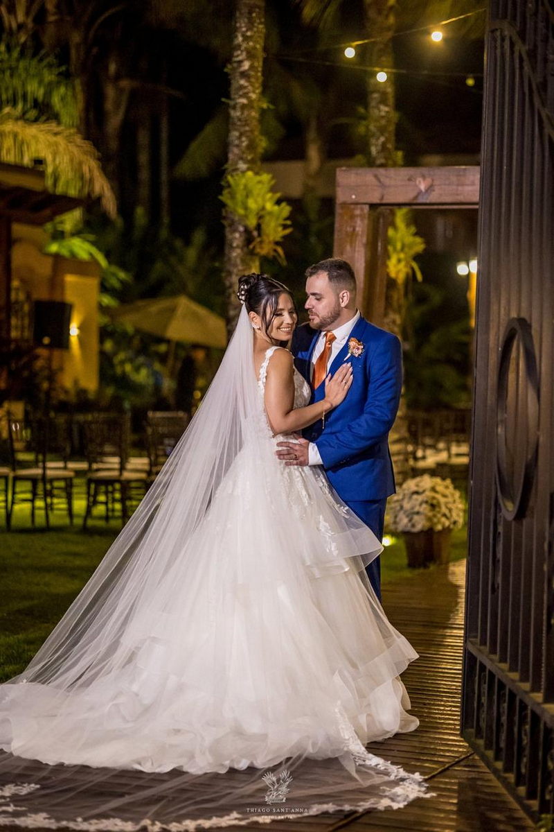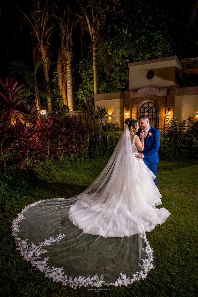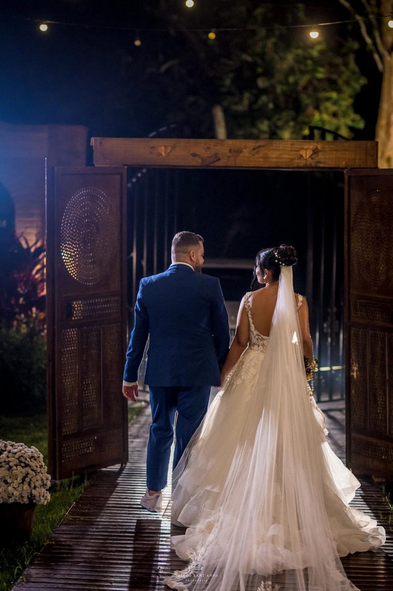 Mas se o cenário do Espaço Paradisus já era espetacular, a beleza da noiva era simplesmente de outro mundo. A Bruna escolheu um vestido de noiva Internovias que parecia ter sido feito sob medida não apenas para ela, mas para este momento específico. O modelo apresentava um decote frontal em v e busto todo trabalhado em renda delicada. A saia volumosa criava um efeito romântico, com camadas de tule fluindo graciosamente e formando uma cauda longa divina. O look foi completado por um penteado e maquiagem leve e super elegante, obra prima da @tfbeauty_.