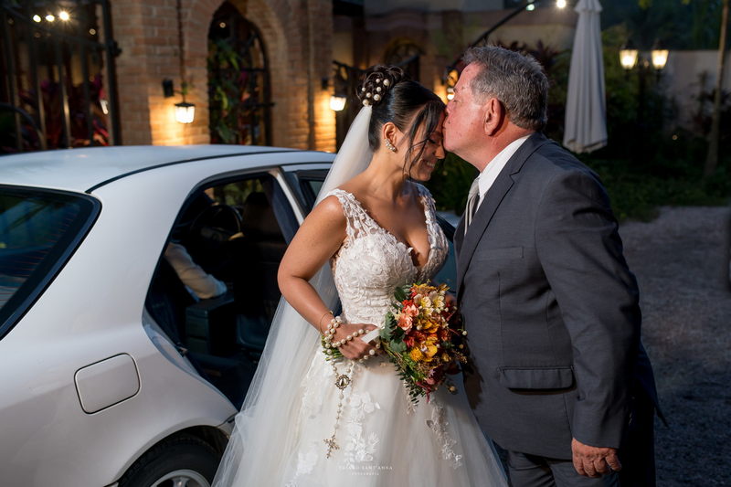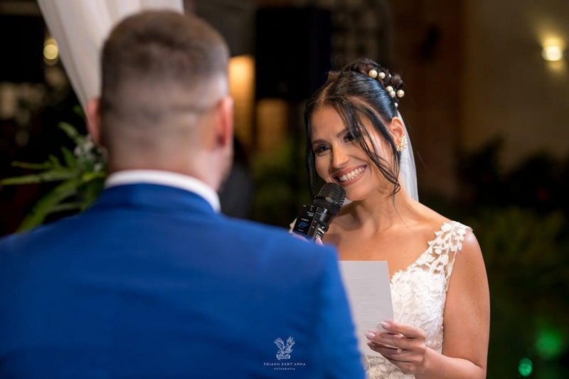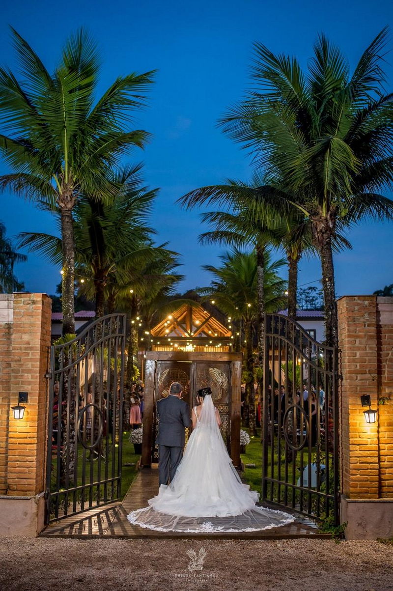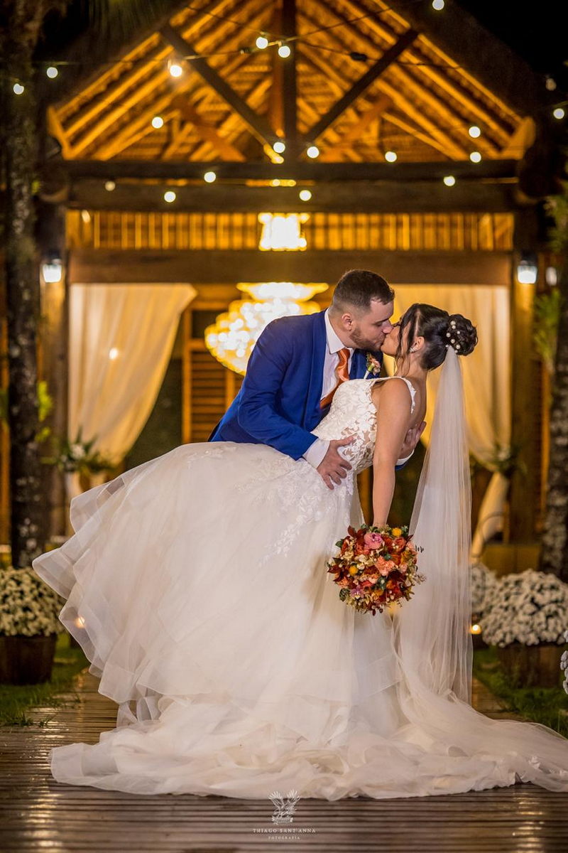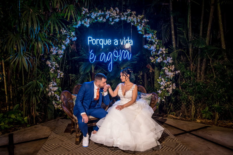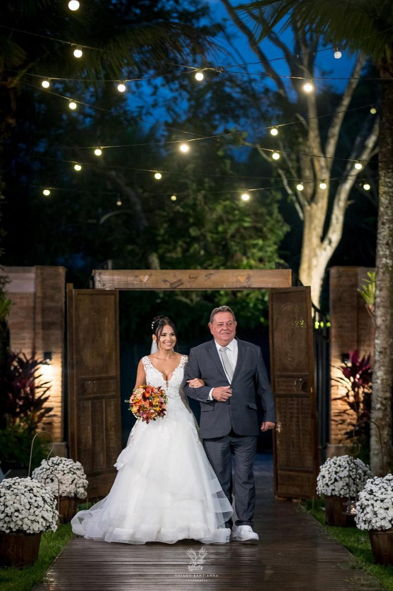 Mas se o cenário do Espaço Paradisus já era espetacular, a beleza da noiva era simplesmente de outro mundo. A Bruna escolheu um vestido de noiva Internovias que parecia ter sido feito sob medida não apenas para ela, mas para este momento específico. O modelo apresentava um decote frontal em v e busto todo trabalhado em renda delicada. A saia volumosa criava um efeito romântico, com camadas de tule fluindo graciosamente e formando uma cauda longa divina. O look foi completado por um penteado e maquiagem leve e super elegante, obra prima da @tfbeauty_.