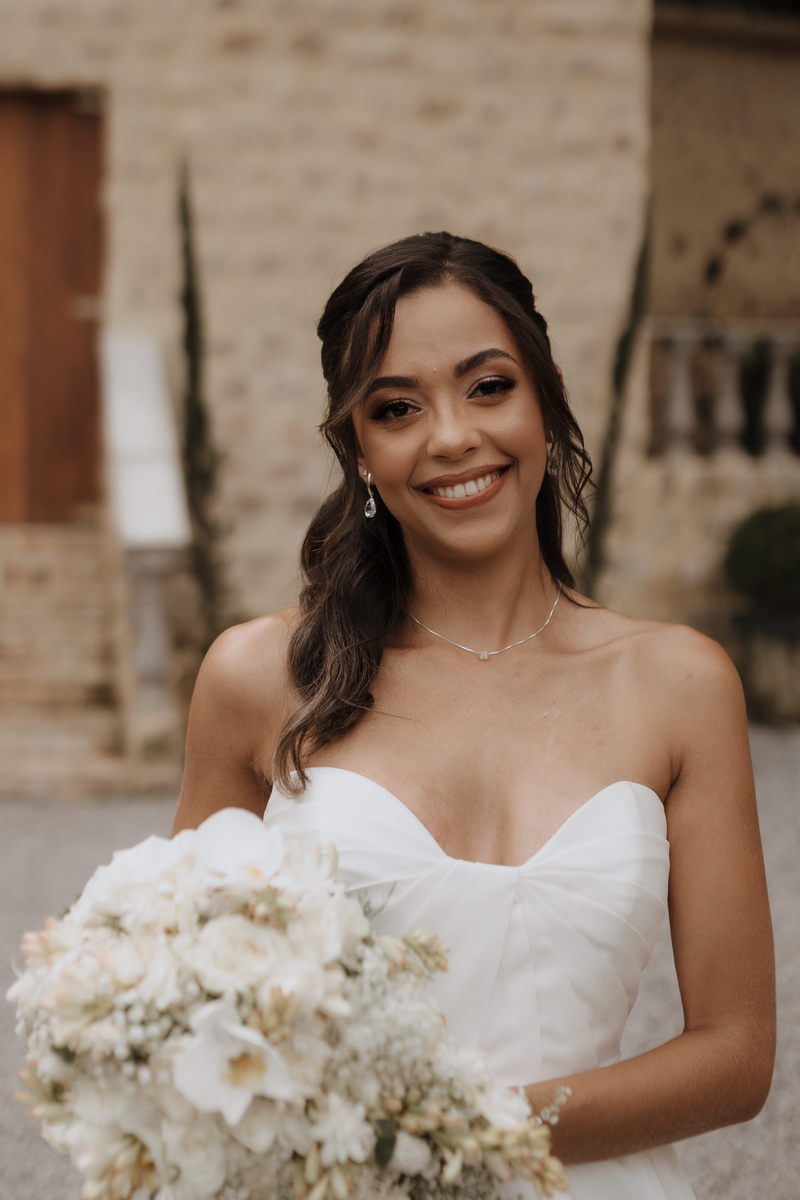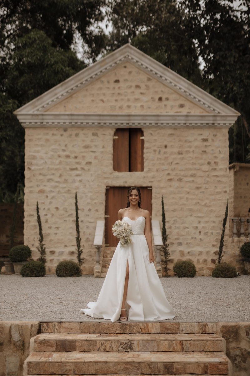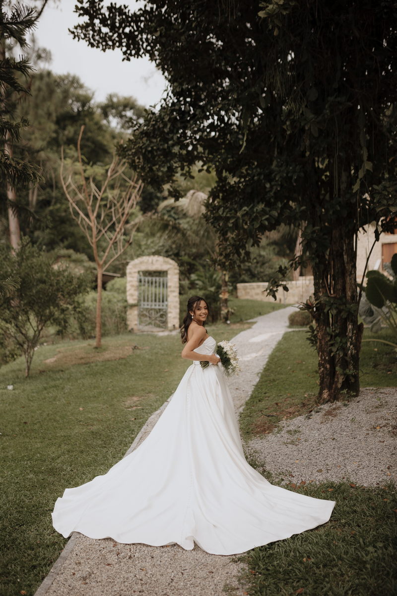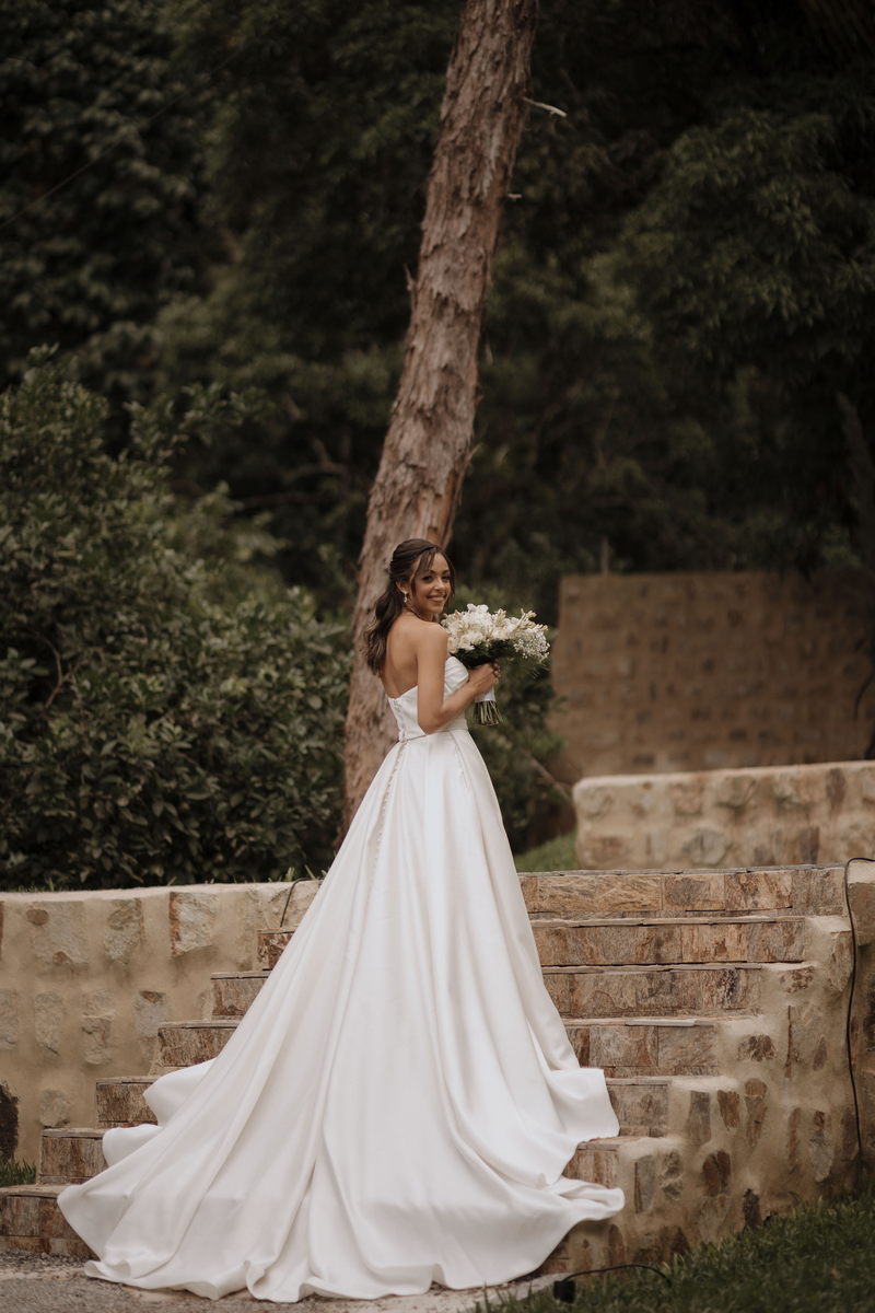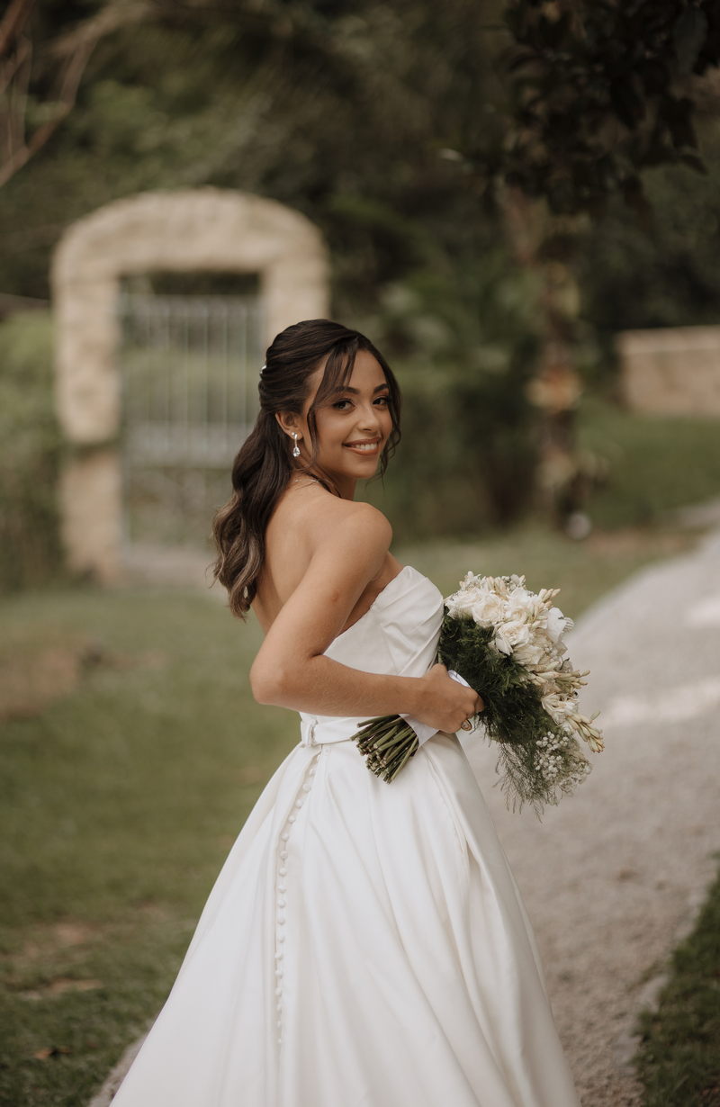 A Tatiane estava absolutamente radiante em seu vestido de noiva da La Modelista. O modelo minimalista estilo princesa, com decote tomara que caia, destacou a sua beleza e elegância. O encantador trabalho no busto adicionou um toque de sofisticação ao vestido, enquanto a fenda frontal revelava graciosamente os passos da noiva. A cauda belíssima complementou o visual, criando um efeito deslumbrante conforme a noiva caminhava em direção ao altar. A maquiagem impecável, cuidadosamente criada pela @aglaupemakeup, realçou ainda mais a beleza da noiva.