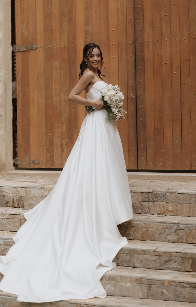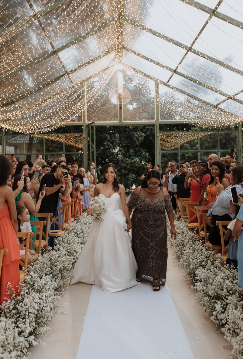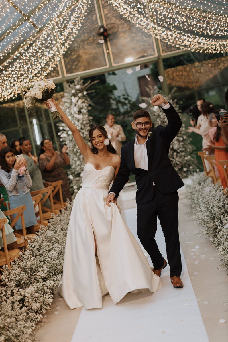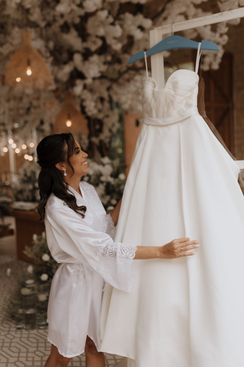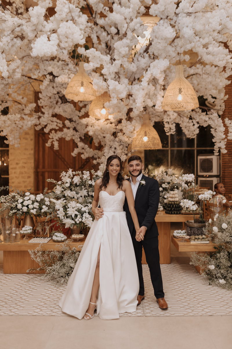A Tatiane estava absolutamente radiante em seu vestido de noiva da La Modelista. O modelo minimalista estilo princesa, com decote tomara que caia, destacou a sua beleza e elegância. O encantador trabalho no busto adicionou um toque de sofisticação ao vestido, enquanto a fenda frontal revelava graciosamente os passos da noiva. A cauda belíssima complementou o visual, criando um efeito deslumbrante conforme a noiva caminhava em direção ao altar. A maquiagem impecável, cuidadosamente criada pela @aglaupemakeup, realçou ainda mais a beleza da noiva.