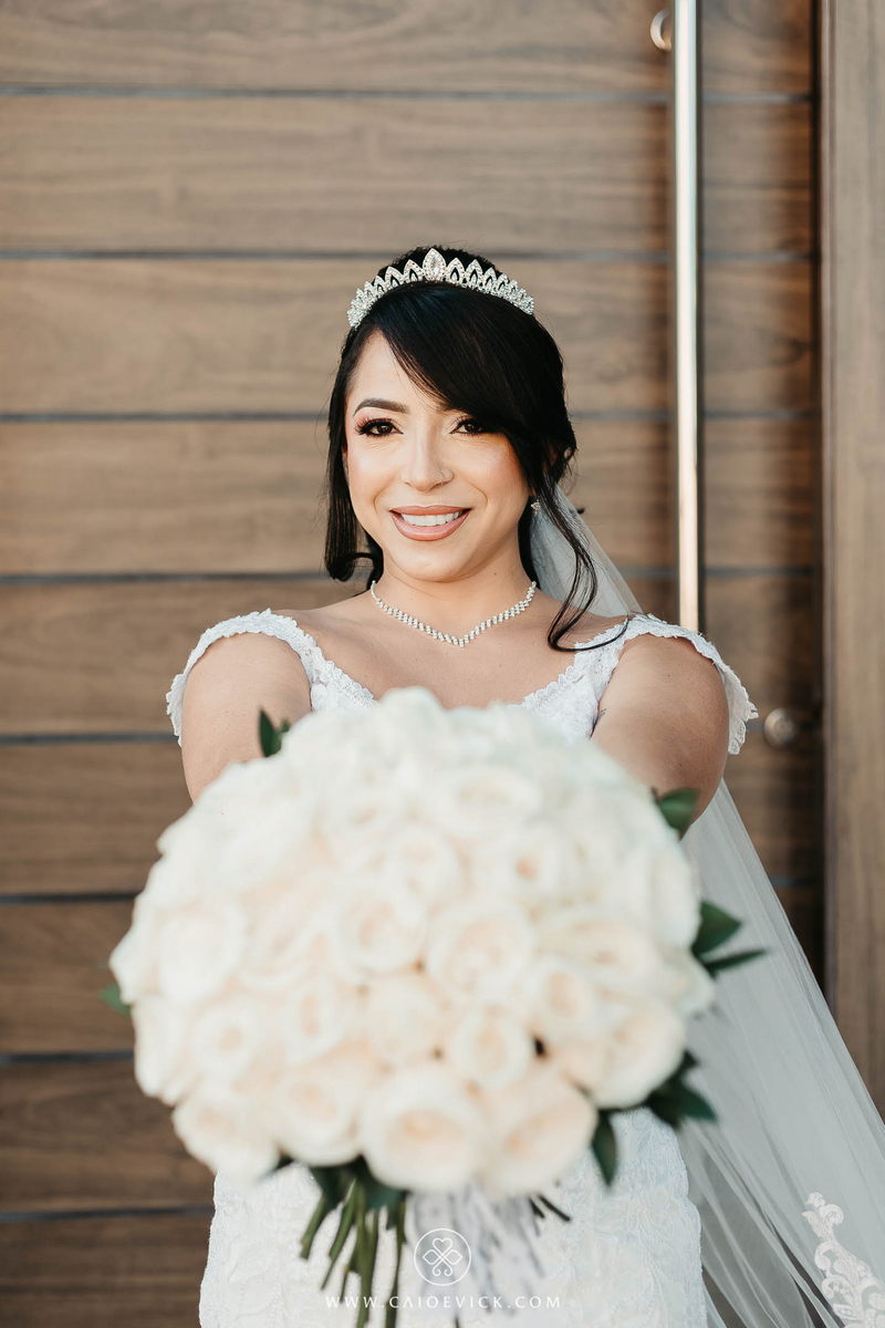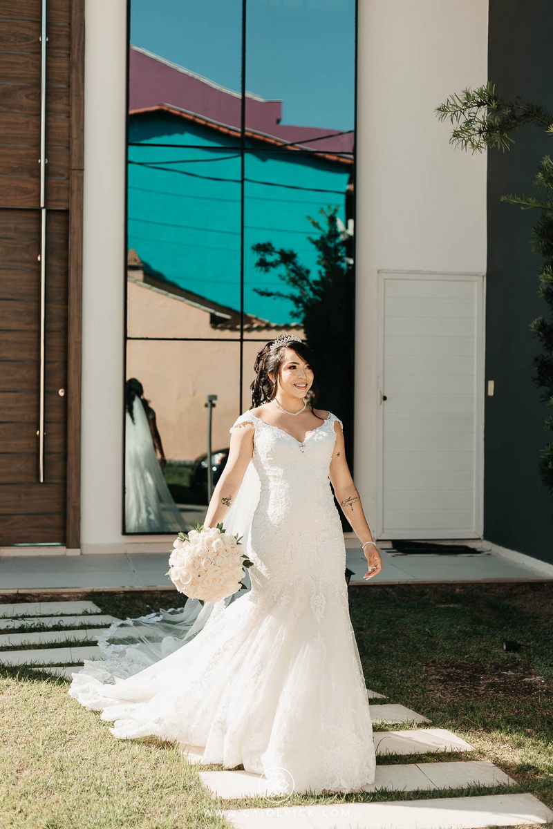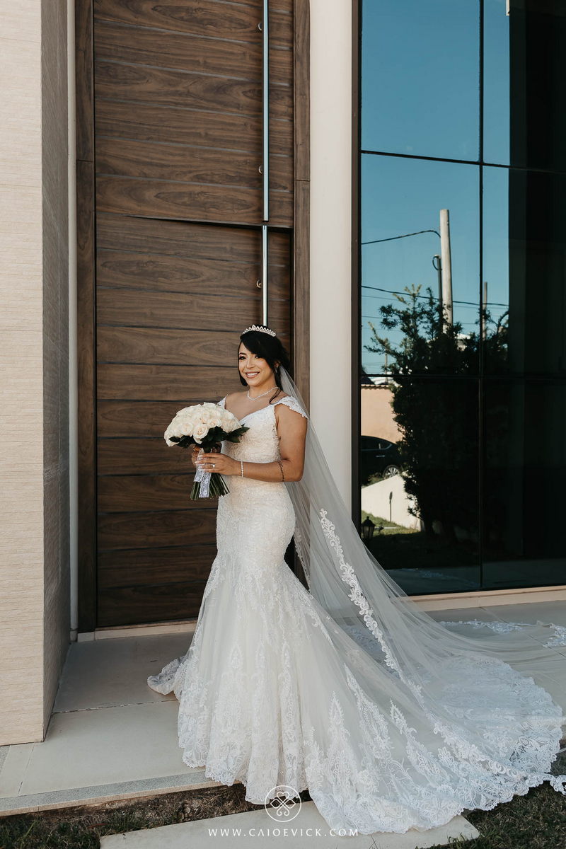 Ela optou por um vestido La Modelista riquíssimo de detalhes em renda e uma linda cauda que trouxe ainda mais elegância ao look. As rosas brancas do buquê complementaram toda ideia passada pela noiva, trazendo ainda mais beleza. Uma verdadeira princesa!