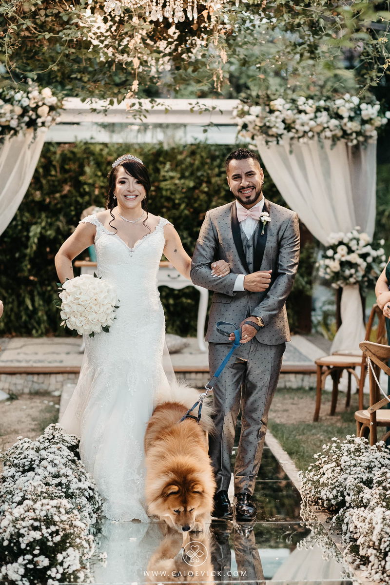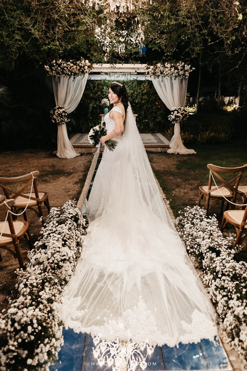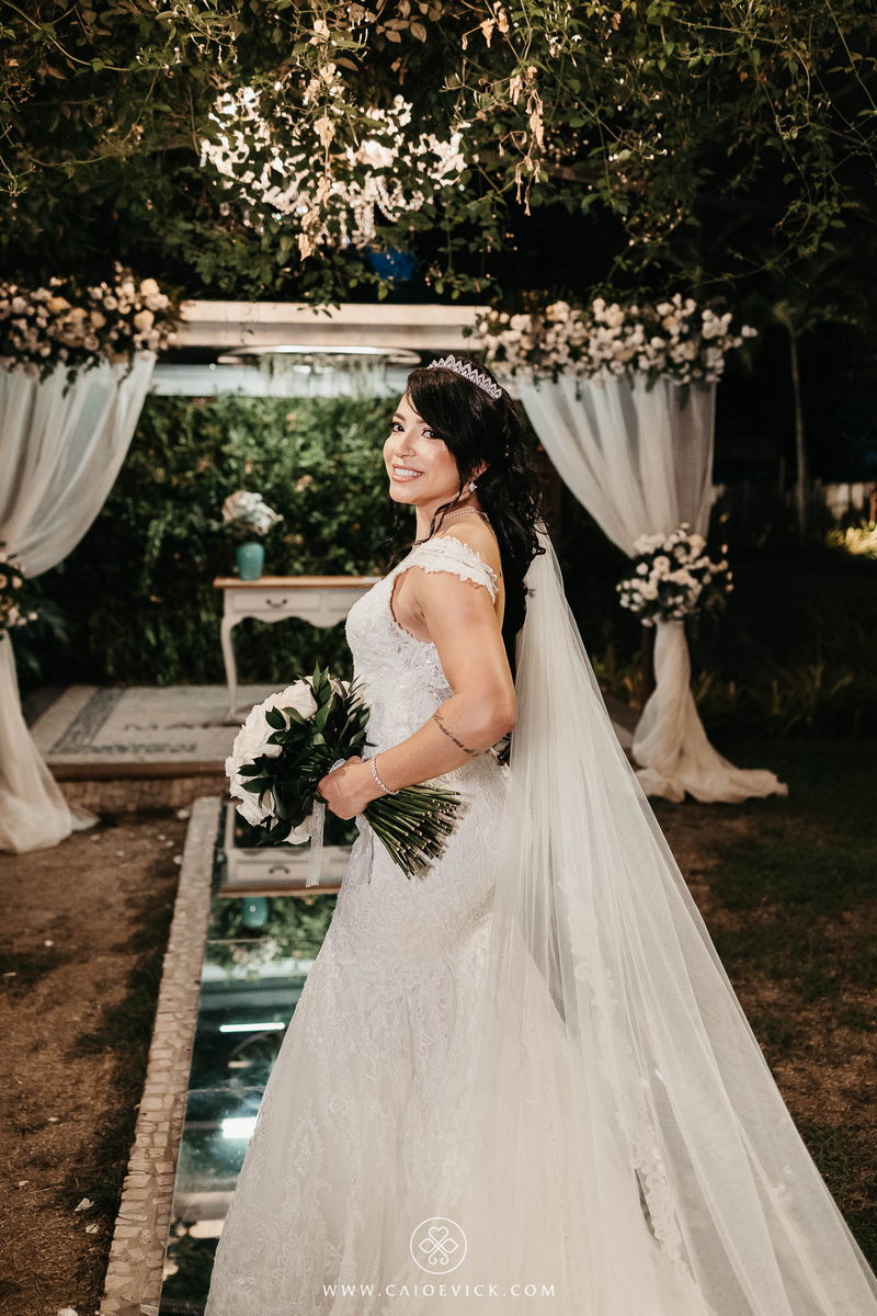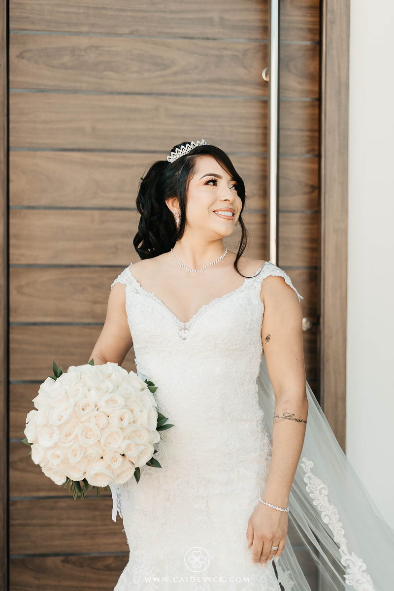 Ela optou por um vestido La Modelista riquíssimo de detalhes em renda e uma linda cauda que trouxe ainda mais elegância ao look. As rosas brancas do buquê complementaram toda ideia passada pela noiva, trazendo ainda mais beleza. Uma verdadeira princesa!