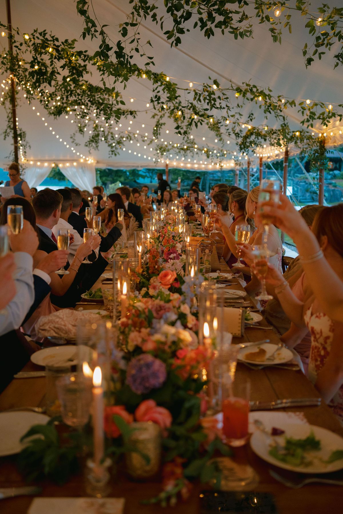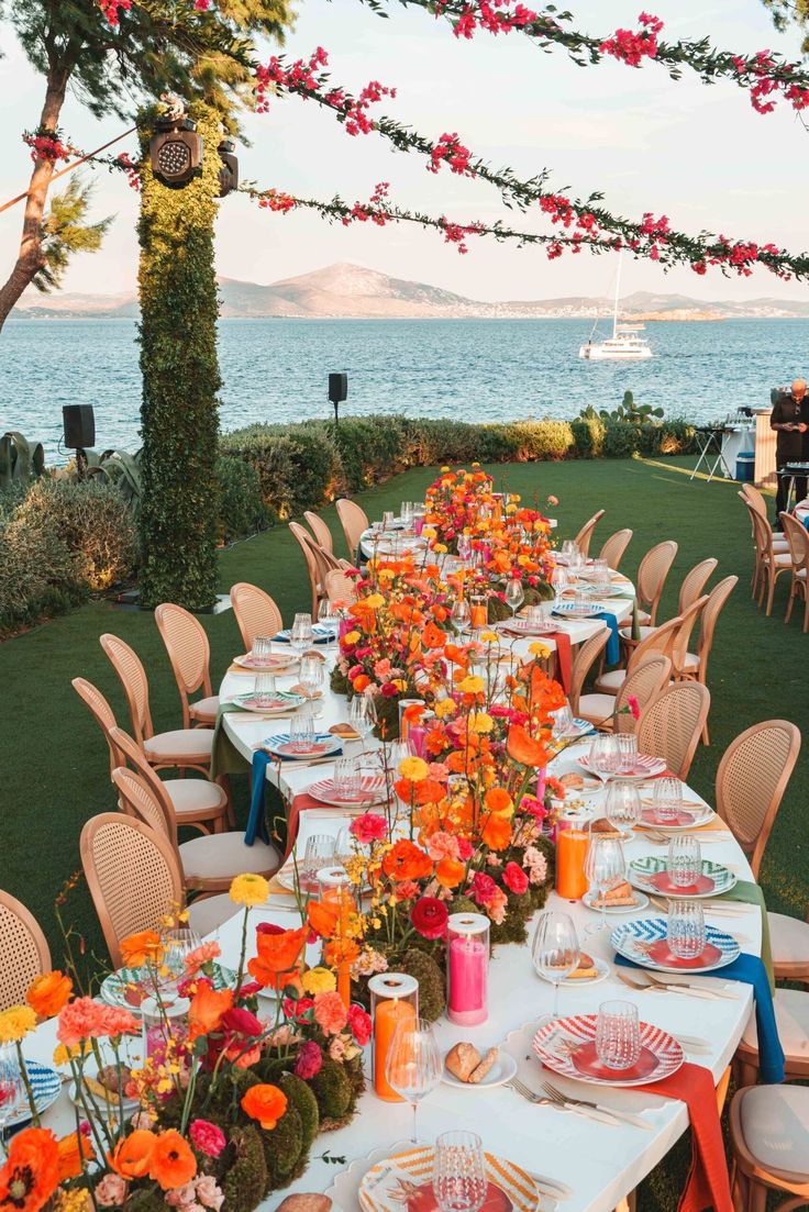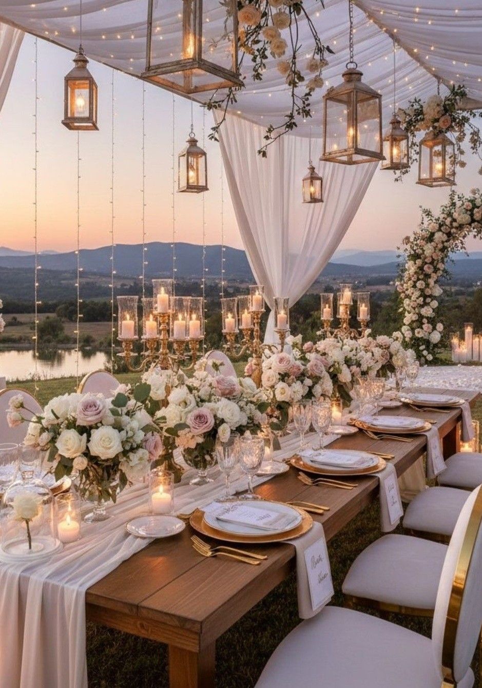 As mesas longas e compartilhadas são um dos símbolos mais marcantes desse estilo. Elas reforçam a ideia de convivência, aproximam os convidados e transformam a refeição em um momento central da experiência. Dispostas ao ar livre ou em espaços amplos, essas mesas criam uma composição visual elegante e acolhedora ao mesmo tempo.