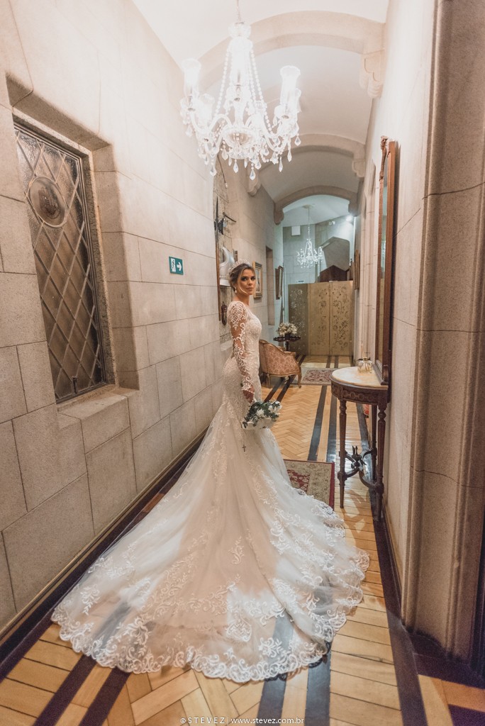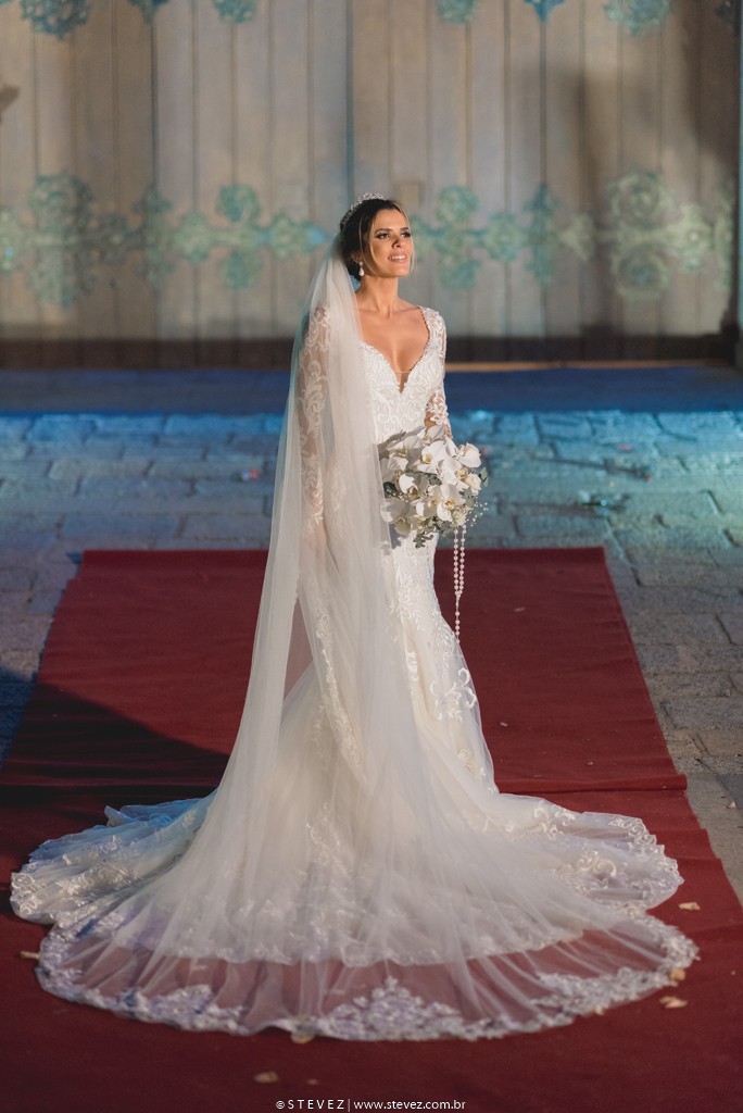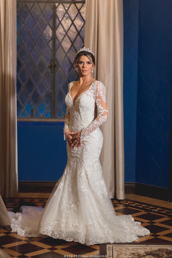 Ela estava como uma princesa em seu vestido de noiva da Internovias, um modelo manga longa com rendas detalhadas, e um decote em V no busto mais que perfeito. Um vestido divino para uma verdadeira princesa.