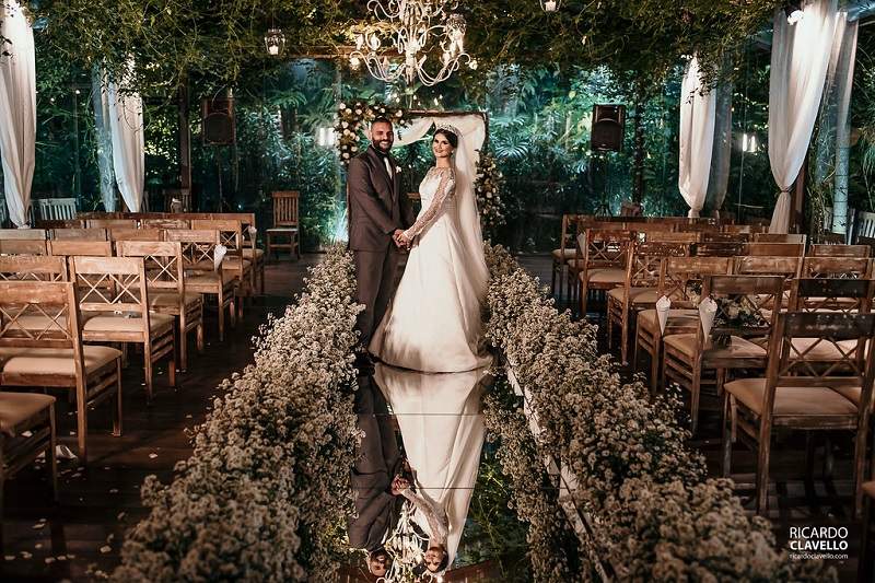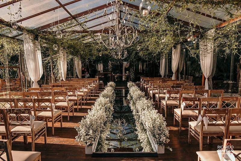 O que dizer dessa decoração impecável, com direito a uma passarela de espelho e com muitas flores brancas? Simplesmente estamos sem palavras para tamanha perfeição. O local escolhido parecia cena de filme, digno do nome Vale dos Sonhos!