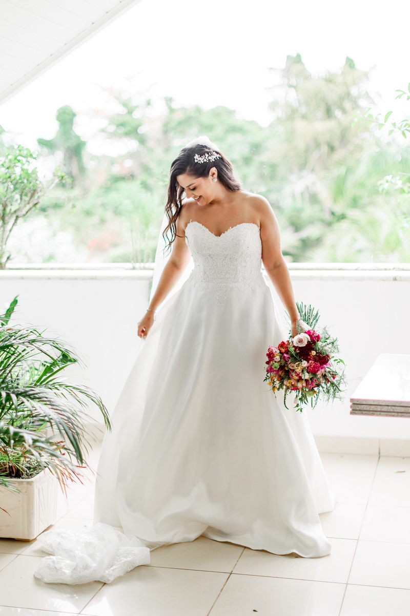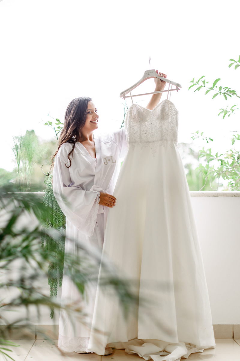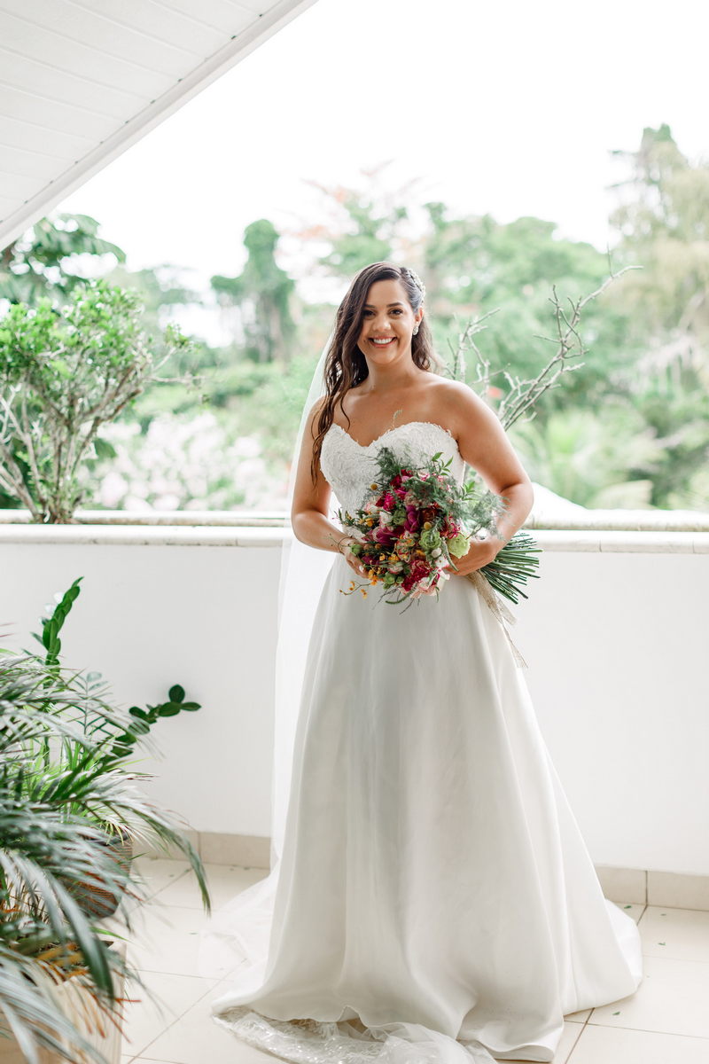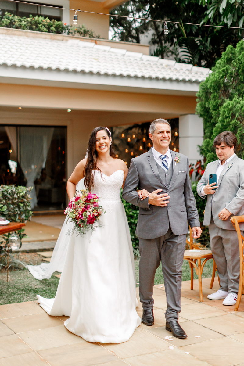 O destaque foi o encanto da noiva com seu deslumbrante vestido de noiva tomara que caia, uma verdadeira obra-prima da renomada loja de noiva La Modelista. O modelo, sofisticado e encantador, com belíssimo trabalho de renda no topo, enquanto a saia minimalista conferiu à Juliana uma elegância perfeita para a ocasião. A maquiagem realizada pela talentosa @maquiagemrj realçou a elegância natural da noiva de forma notável, combinando perfeitamente com a atmosfera íntima do casamento em casa.