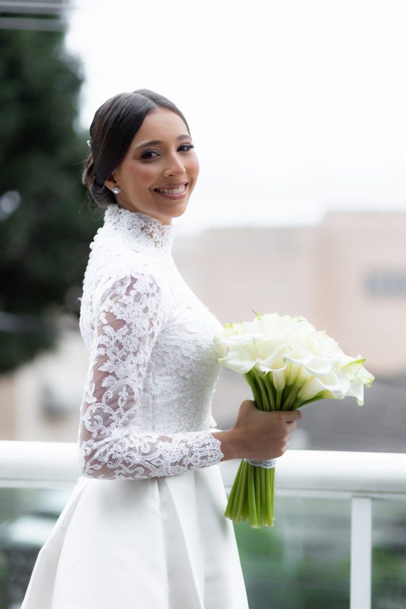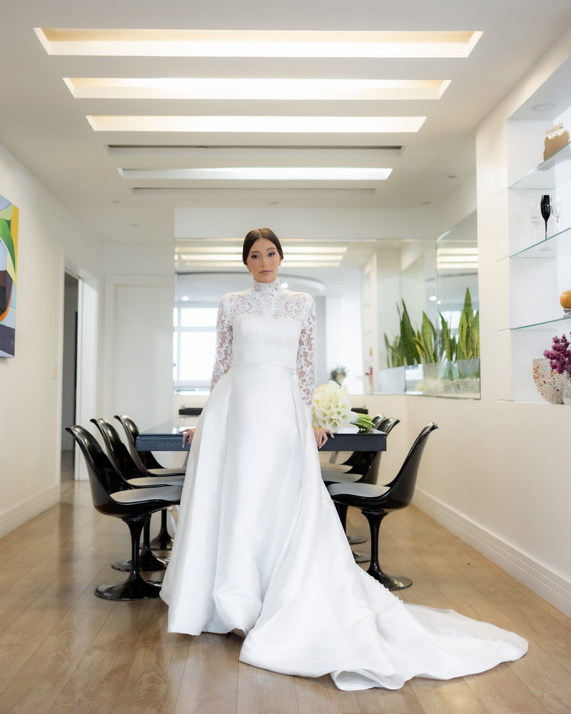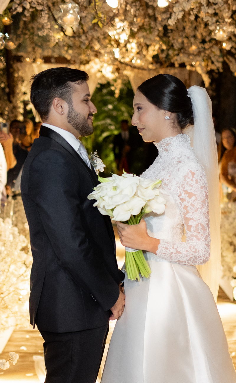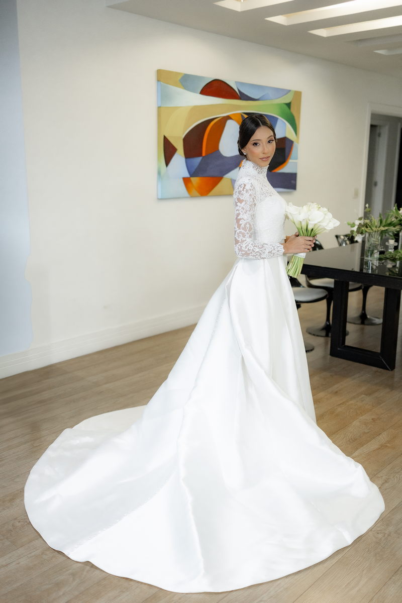 Pamela escolheu um vestido de noiva divino na La Modelista, que combinou perfeitamente com o estilo refinado do casamento. O modelo, com gola alta e mangas longas em renda delicada, irradiava um charme clássico e romântico. A saia belíssima e minimalista, adornada com botões delicados nas costas, conferia um ar de realeza ao visual. Este vestido, com sua elegância atemporal, é a escolha perfeita para noivas que desejam impressionar com um visual marcante e inesquecível.