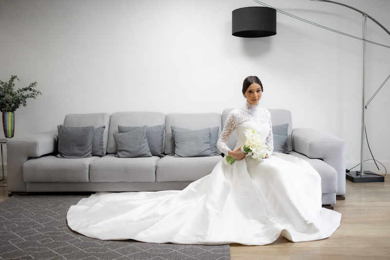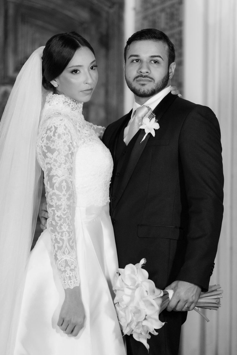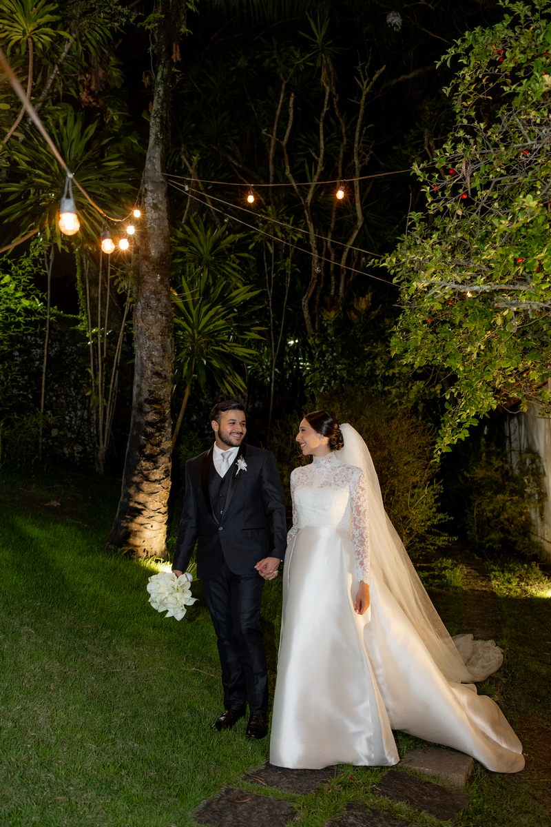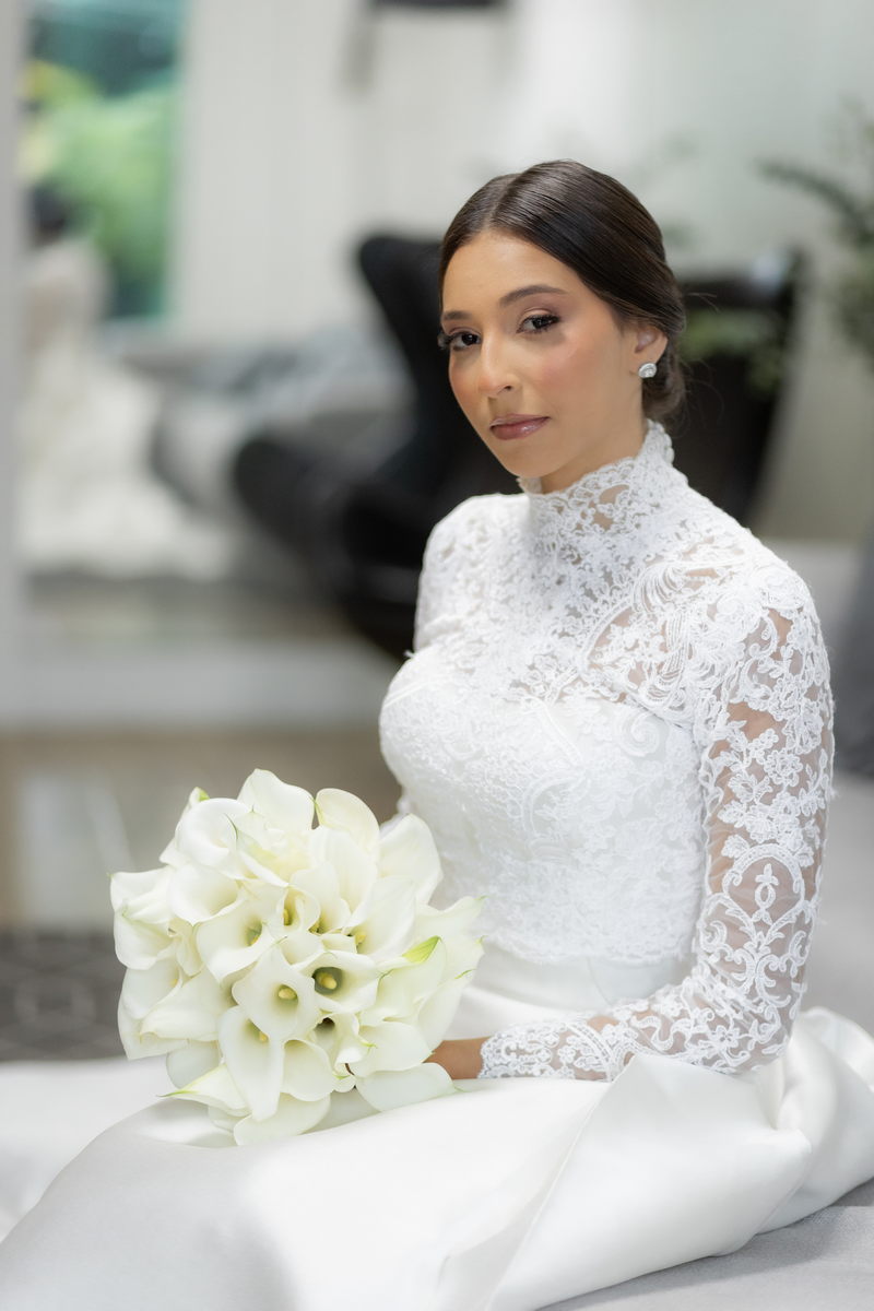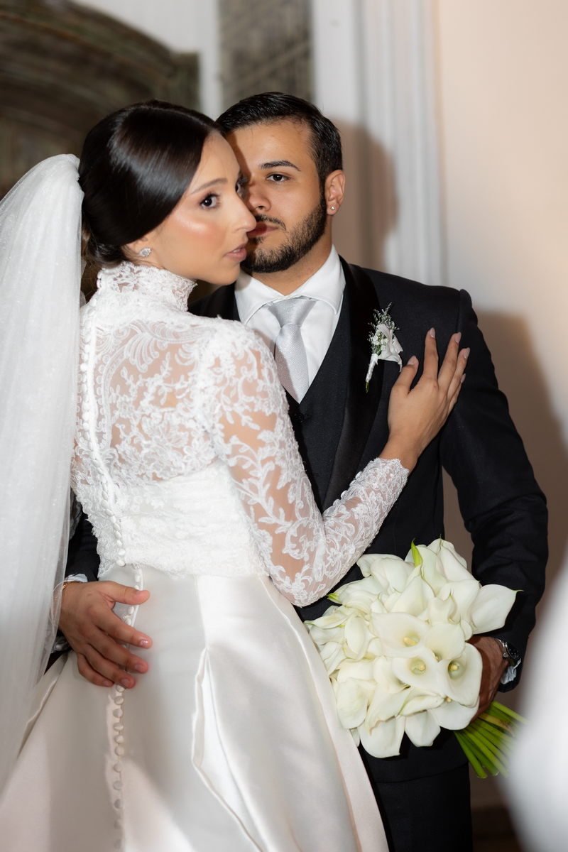 Pamela escolheu um vestido de noiva divino na La Modelista, que combinou perfeitamente com o estilo refinado do casamento. O modelo, com gola alta e mangas longas em renda delicada, irradiava um charme clássico e romântico. A saia belíssima e minimalista, adornada com botões delicados nas costas, conferia um ar de realeza ao visual. Este vestido, com sua elegância atemporal, é a escolha perfeita para noivas que desejam impressionar com um visual marcante e inesquecível.