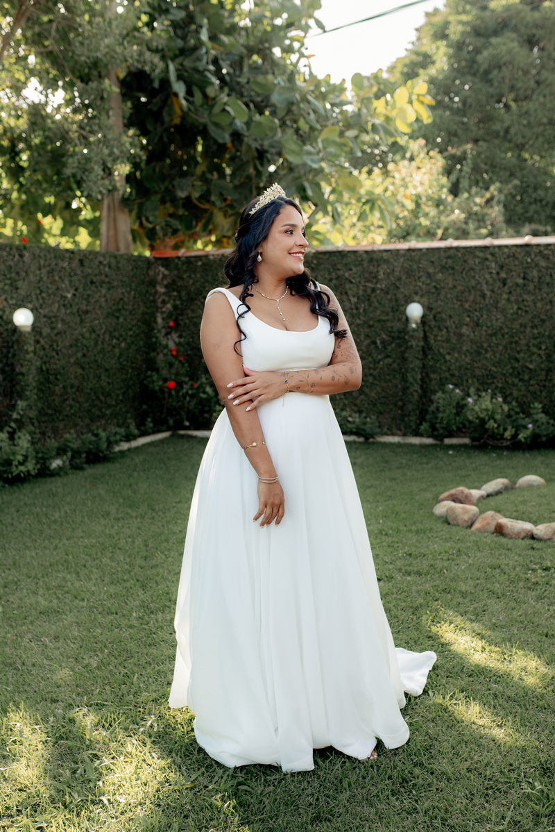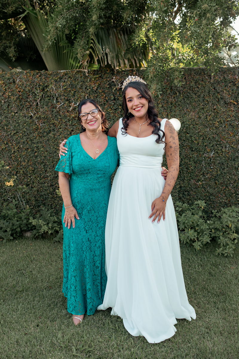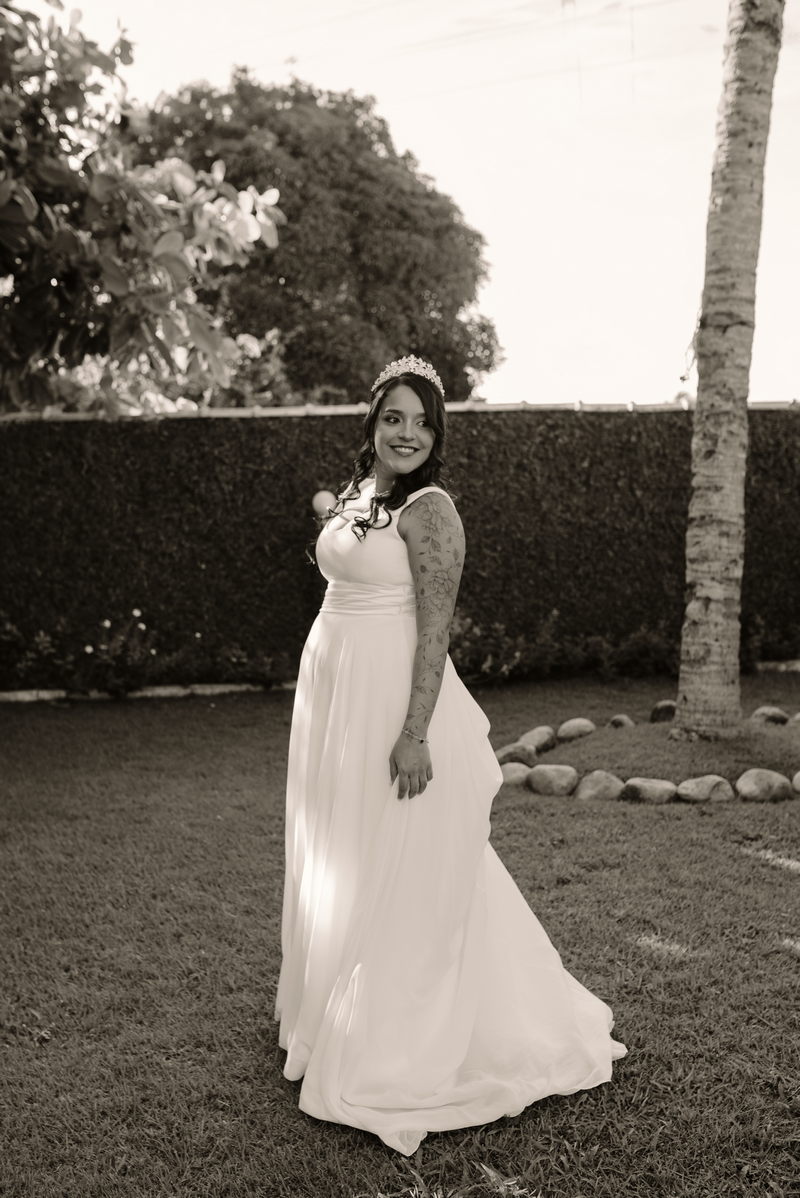 Gabriella optou um vestido de noiva deslumbrante da La Modelista. O design evasê, com um busto ajustado e uma saia fluida, destacou sua elegância natural e realçou de forma encantadora e charmosa a sua gravidez. Essa escolha não apenas valorizou sua beleza, mas também celebrou a nova vida que está por vir, tornando o visual ainda mais especial e emocionante. A maquiagem, criada por @joycemendesnoivas, trouxe à tona a beleza radiante da Gabriella, com um toque de sofisticação e suavidade. Seu cabelo, adornado com uma coroa, complementou o visual de forma harmoniosa.
