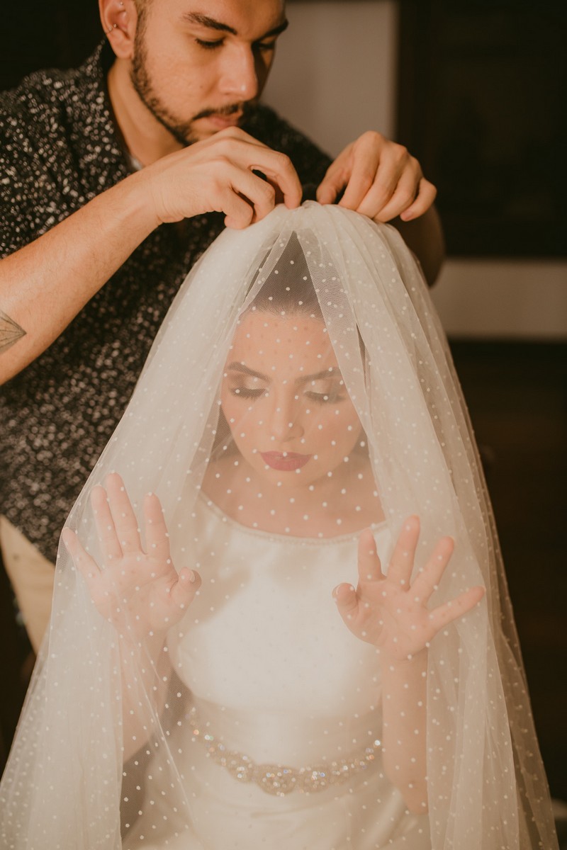 Para arrematar, mandei fazer um véu de poá de 5 metros que fechou o look com uma tiara de pérolas saindo do topo do meu coque bola.