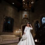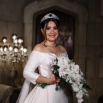 Helena chegou radiante, com aquele brilho nos olhos que só uma noiva verdadeiramente feliz tem. Seu vestido de noiva La Modelista apresentava modelagem princesa, com decote ombro a ombro em formato amplo e detalhe em V, que criava um visual sofisticado e feminino. O corpete estruturado apresentava aplicações discretas de renda e a saia volumosa impecável acompanhava cada movimento da noiva. A cauda longa se espalhava majestosamente pelo chão, refletindo a luz e criando um efeito de pura elegância enquanto ela caminhava pelos cenários do castelo. A tiara que coroava o penteado completava o visual, adicionando um toque de glamour e realeza.