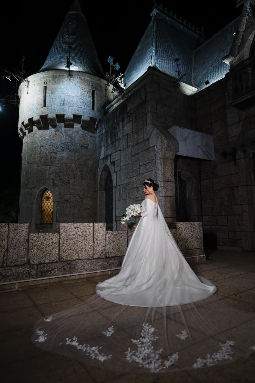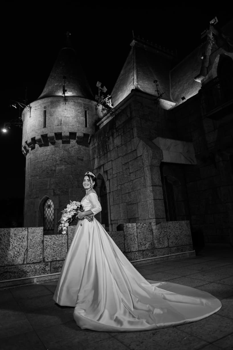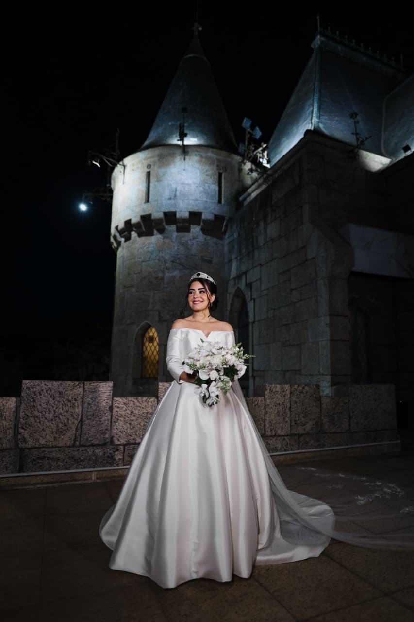 Helena chegou radiante, com aquele brilho nos olhos que só uma noiva verdadeiramente feliz tem. Seu vestido de noiva La Modelista apresentava modelagem princesa, com decote ombro a ombro em formato amplo e detalhe em V, que criava um visual sofisticado e feminino. O corpete estruturado apresentava aplicações discretas de renda e a saia volumosa impecável acompanhava cada movimento da noiva. A cauda longa se espalhava majestosamente pelo chão, refletindo a luz e criando um efeito de pura elegância enquanto ela caminhava pelos cenários do castelo. A tiara que coroava o penteado completava o visual, adicionando um toque de glamour e realeza.