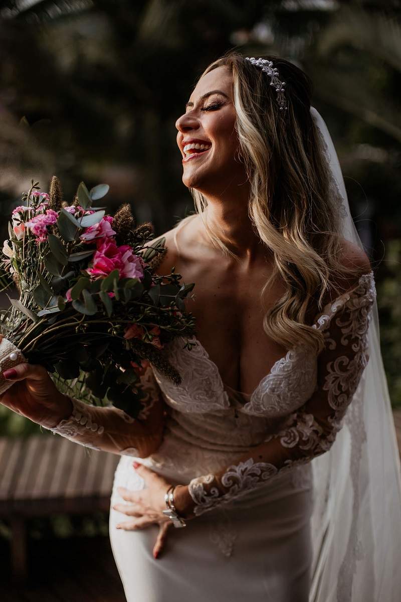 O vestido de noiva foi amor a primeira vista, preferi alugar e quando fui na La Modelista – Pronovias & Nicole, a Maria entendendo meu perfil me trouxe o vestido dos meus sonhos, o Enelsa, não consegui mais achar graça em nenhum outro vestido e ele foi o escolhido