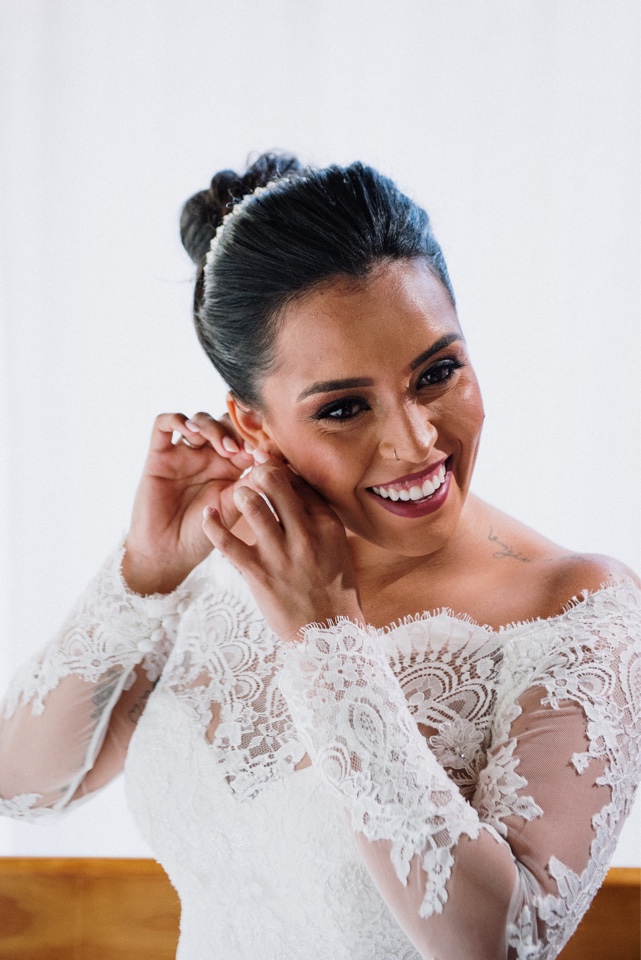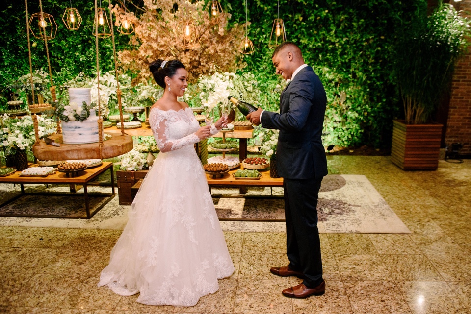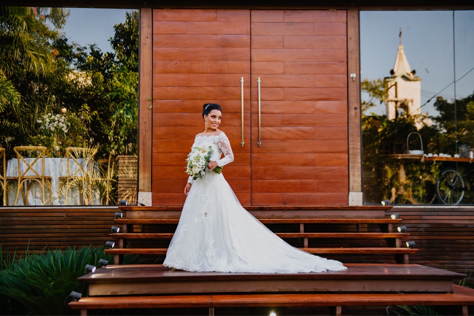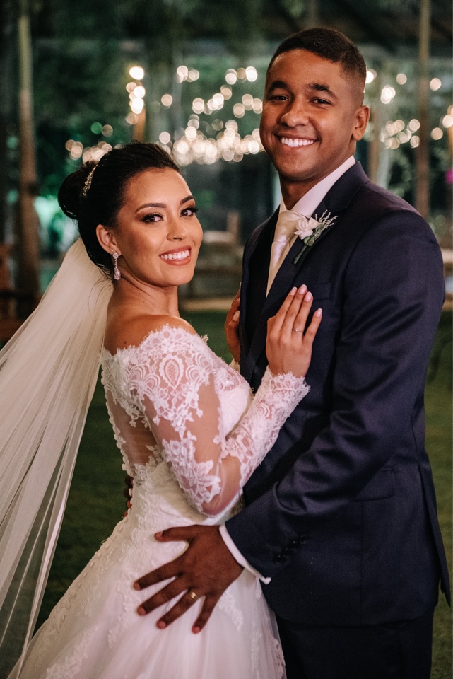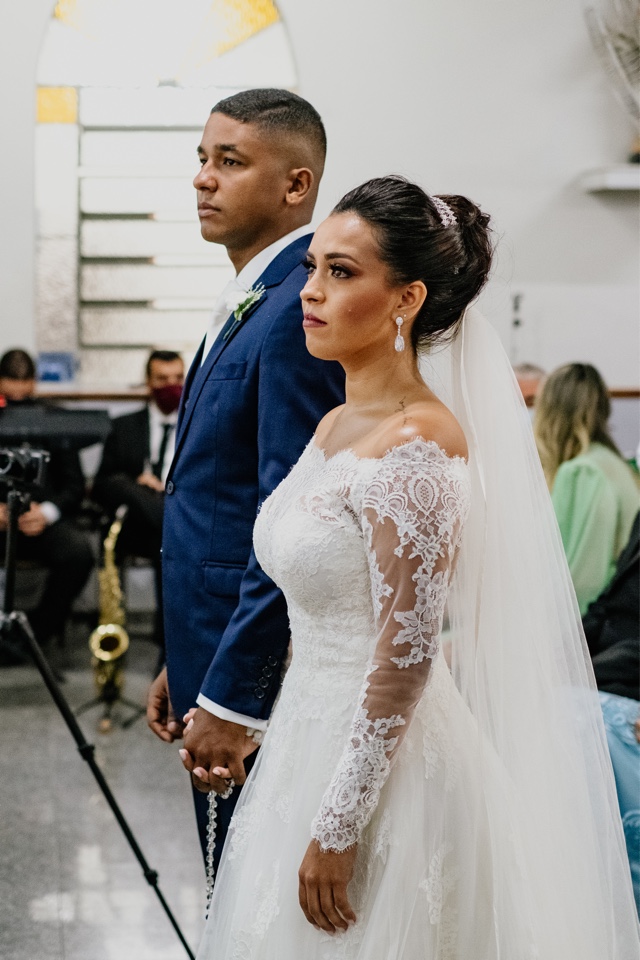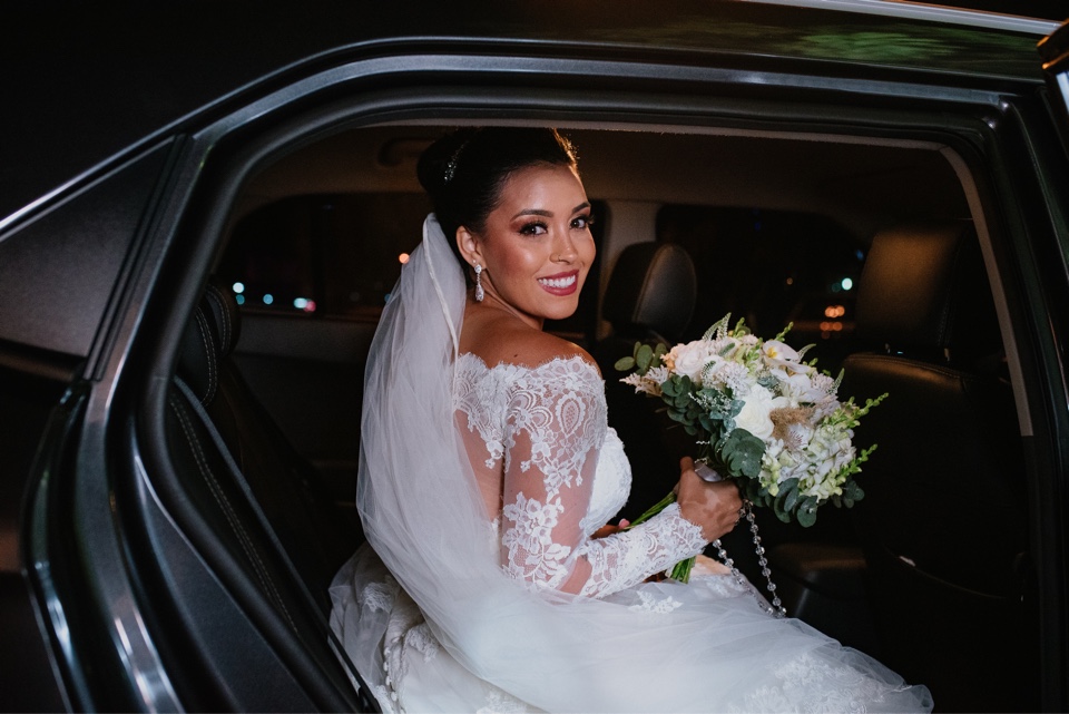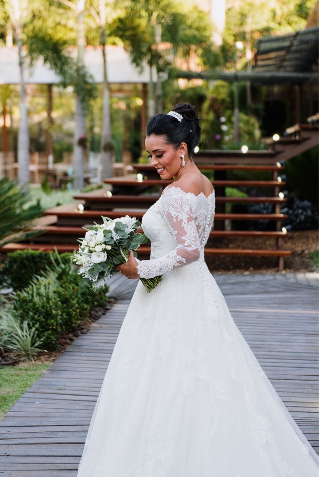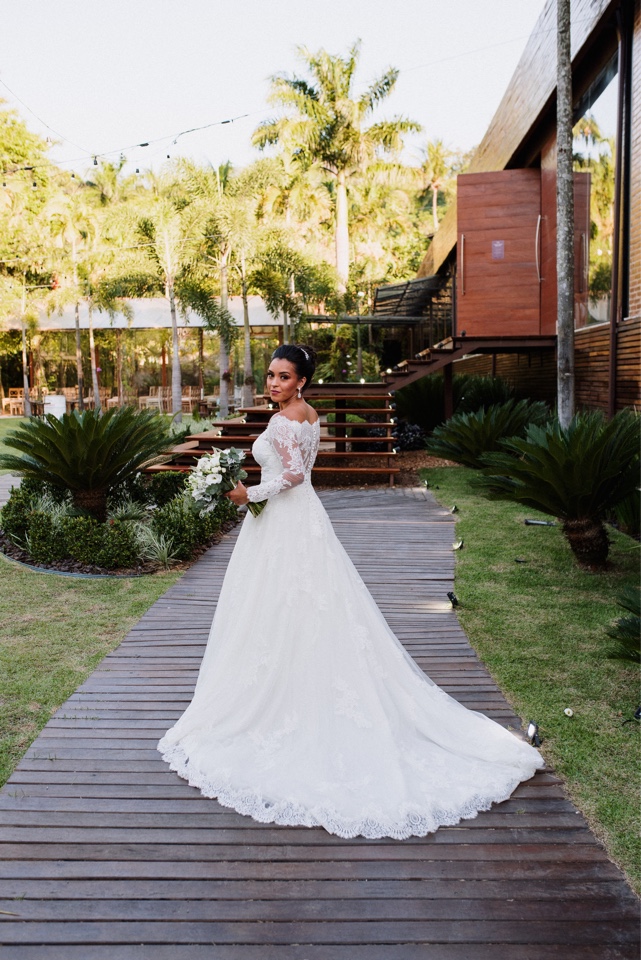 A Marcelle estava super elegante e linda com o seu vestido de noiva da La Modelista, ela optou por um modelo incrível, que realçou ainda mais a sua beleza. Um vestido manga longa, com decote ombro a ombro todo trabalhado em renda, estilo totalmente princesa!
