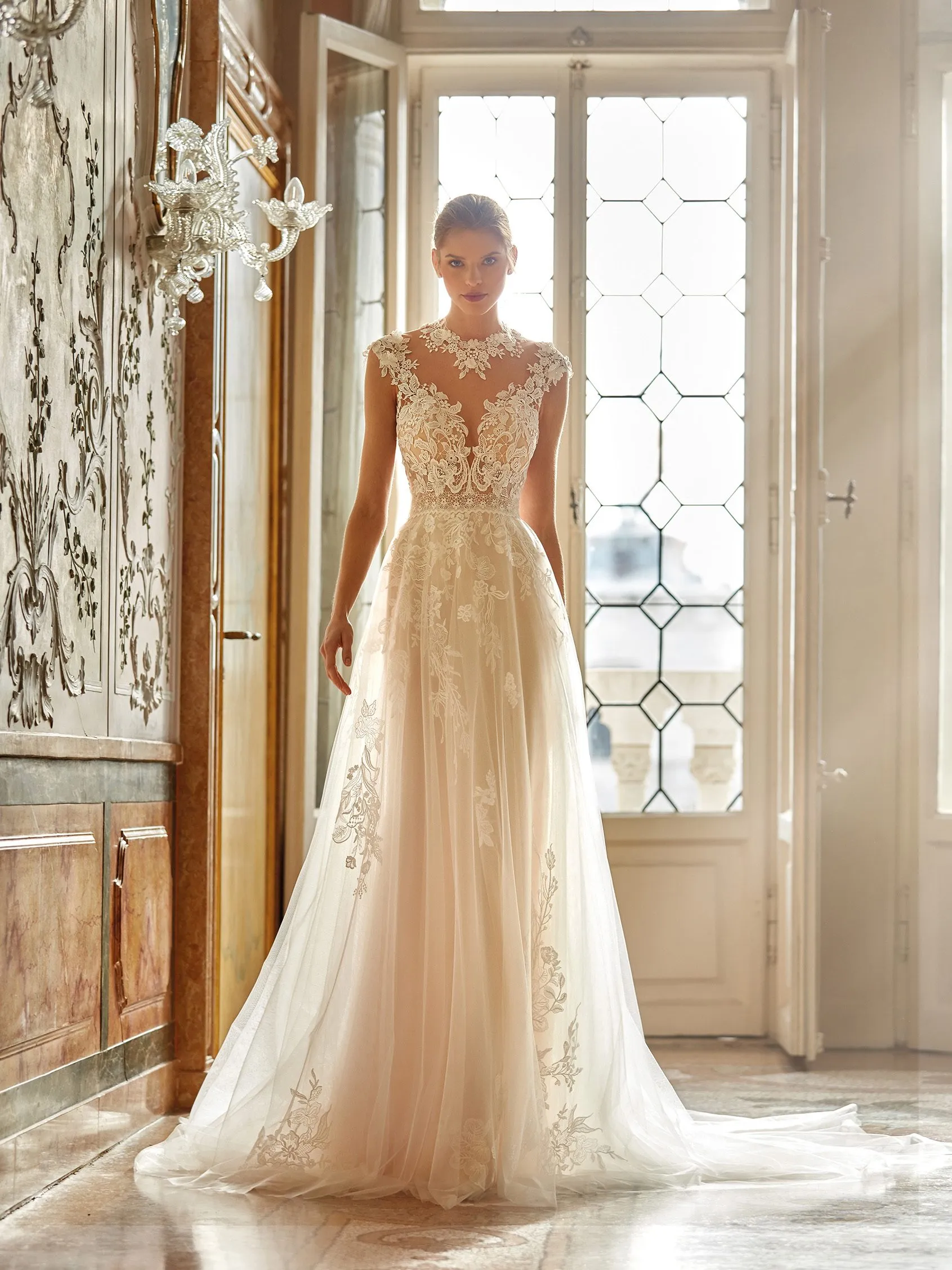 Um vestido de corte império, nem sereia nem princesa, com decote ilusão e delicadas aplicações de flores, pois essa leveza também faz parte de sua personalidade.