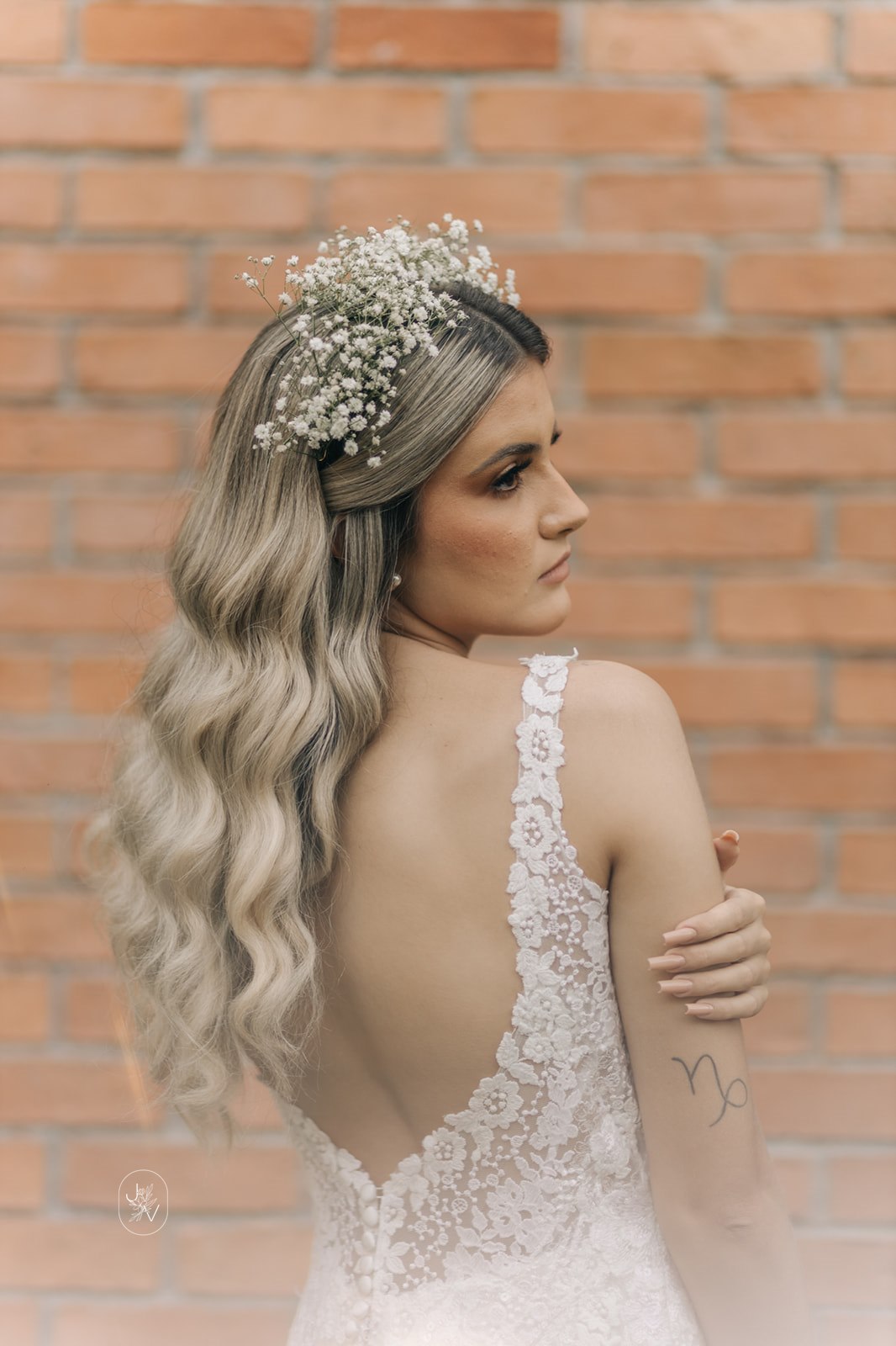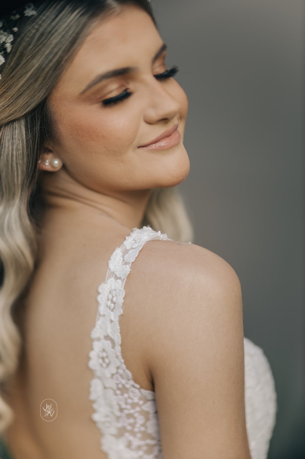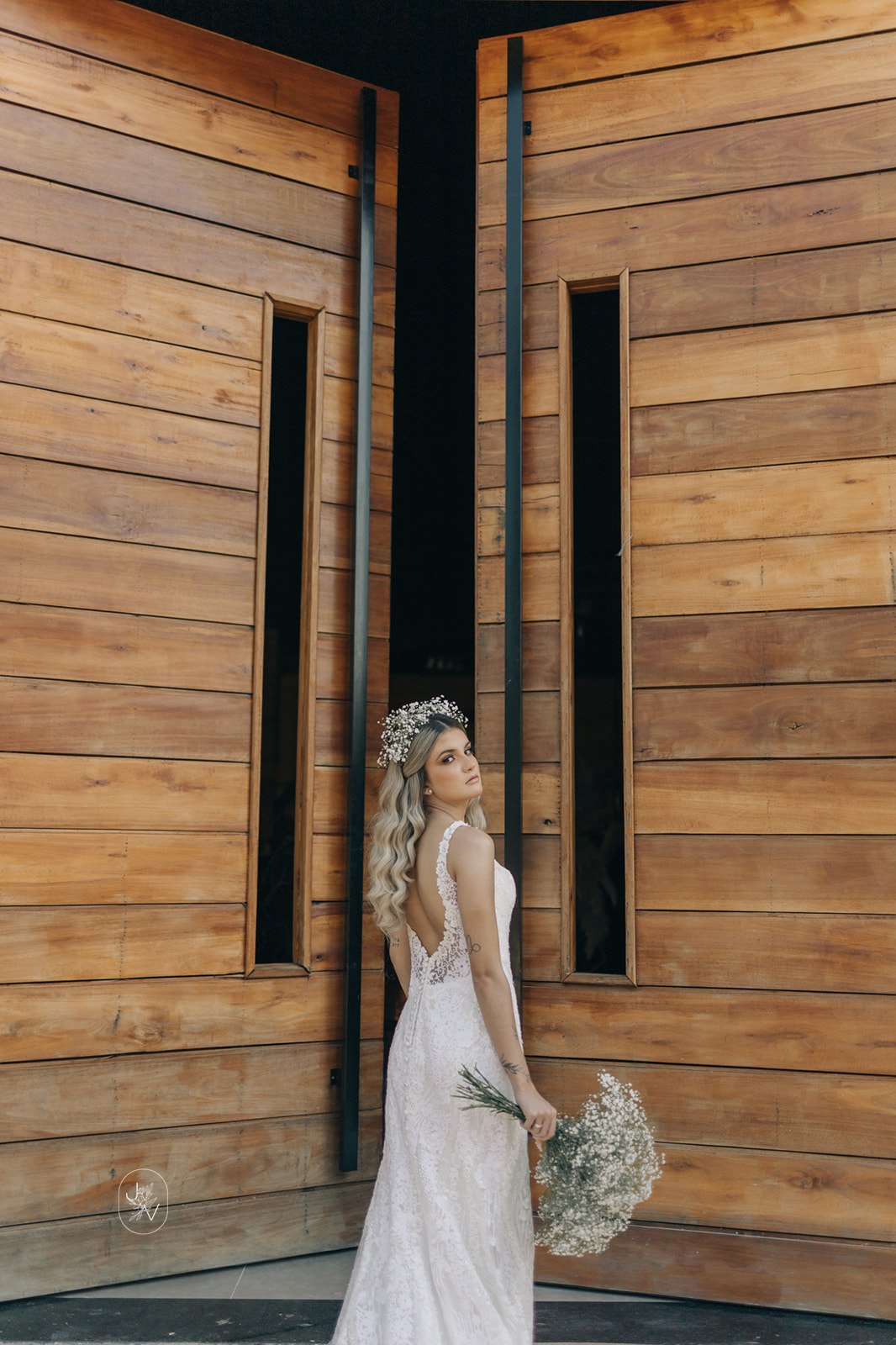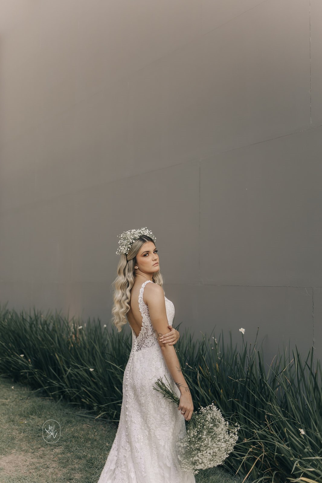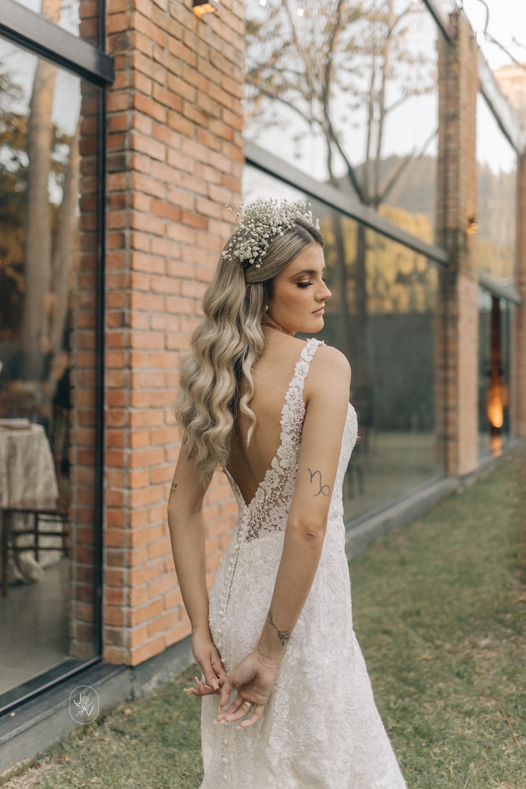 Desde o detalhe da coroa de flores, da maquiagem perfeita e também da escolha do vestido de noiva. Um modelo Internovias trabalhado em rendas delicadas, com decote perfeito e sensual nas costas, um caimento que definiu e valorizou ainda mais as curvas da noiva.