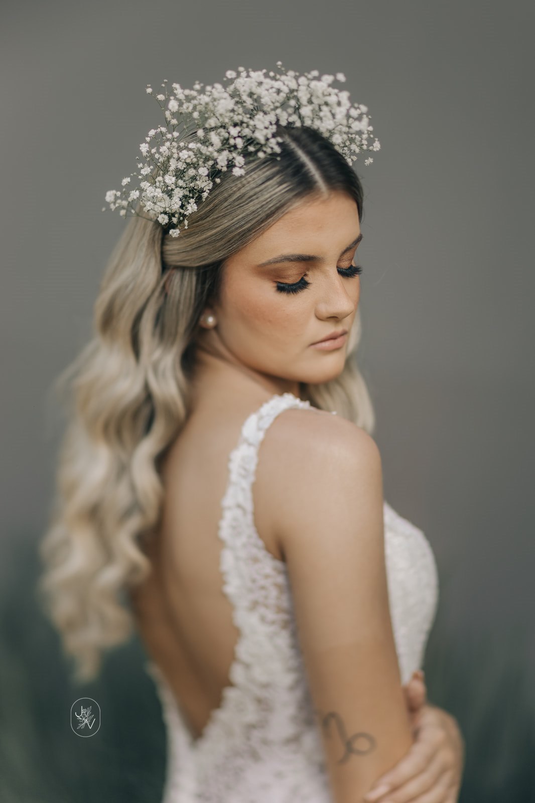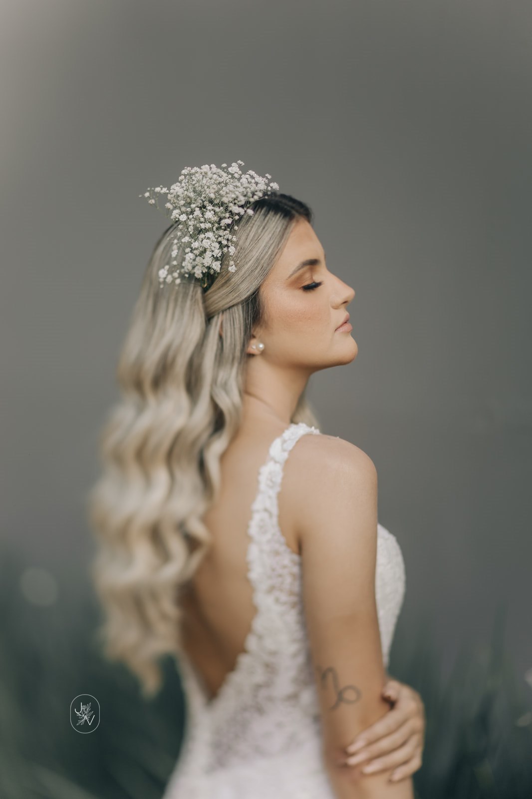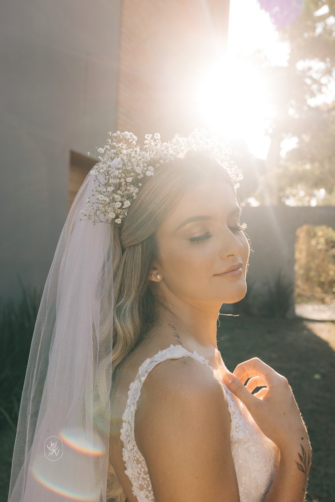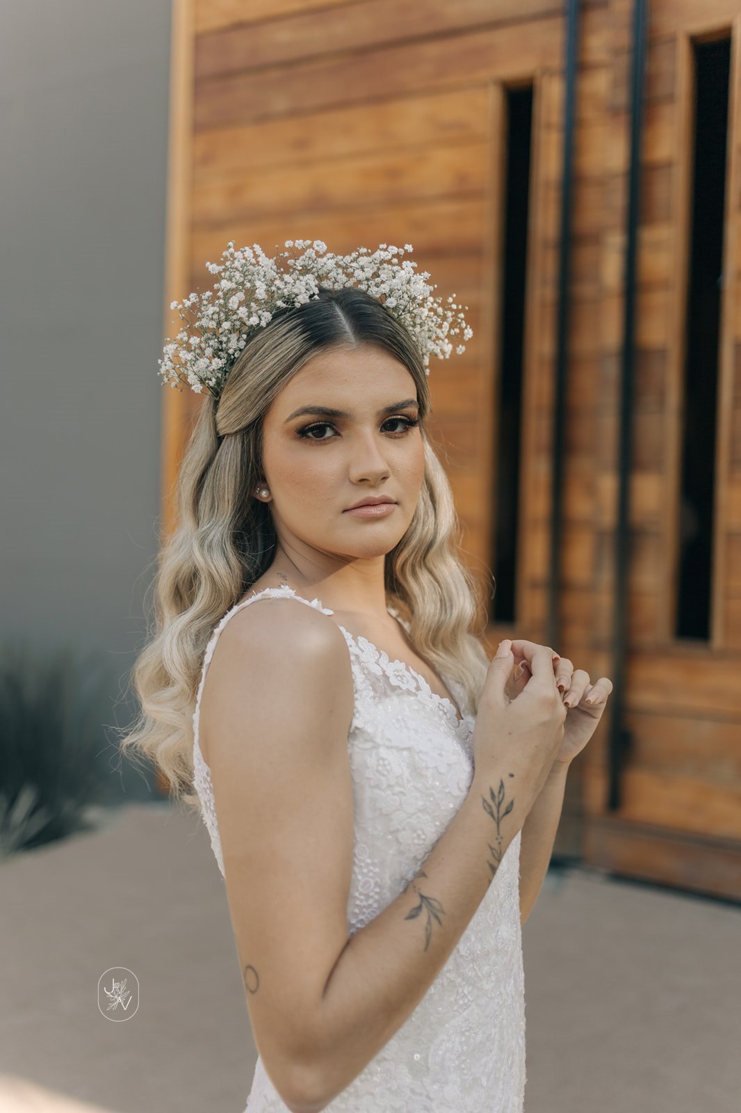 Desde o detalhe da coroa de flores, da maquiagem perfeita e também da escolha do vestido de noiva. Um modelo Internovias trabalhado em rendas delicadas, com decote perfeito e sensual nas costas, um caimento que definiu e valorizou ainda mais as curvas da noiva.