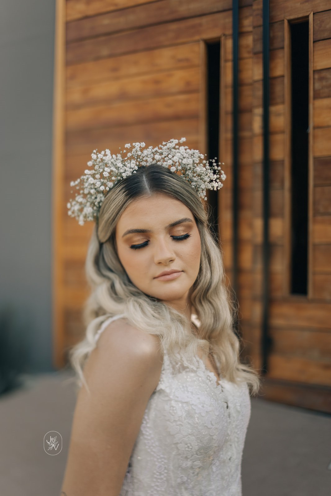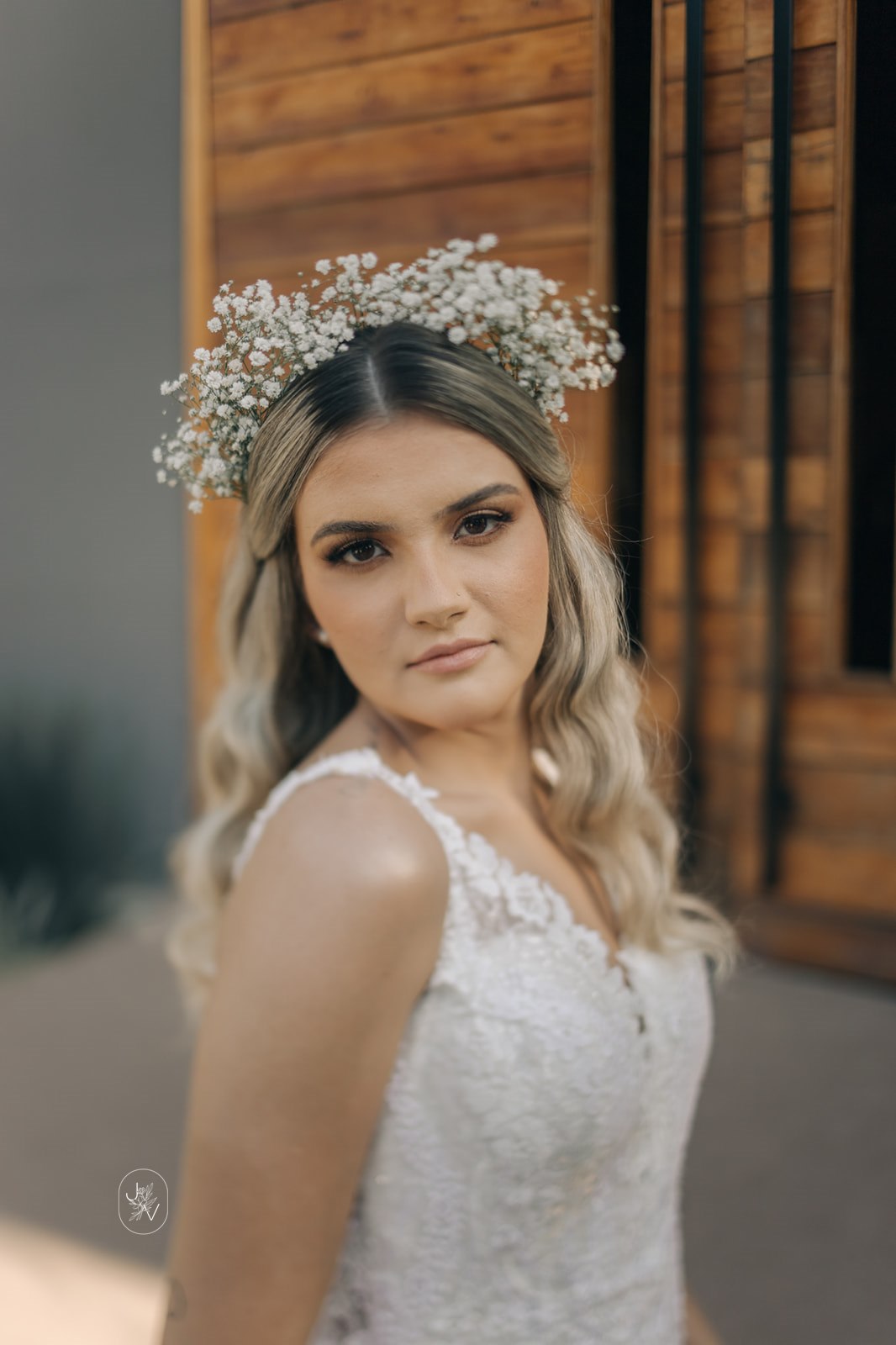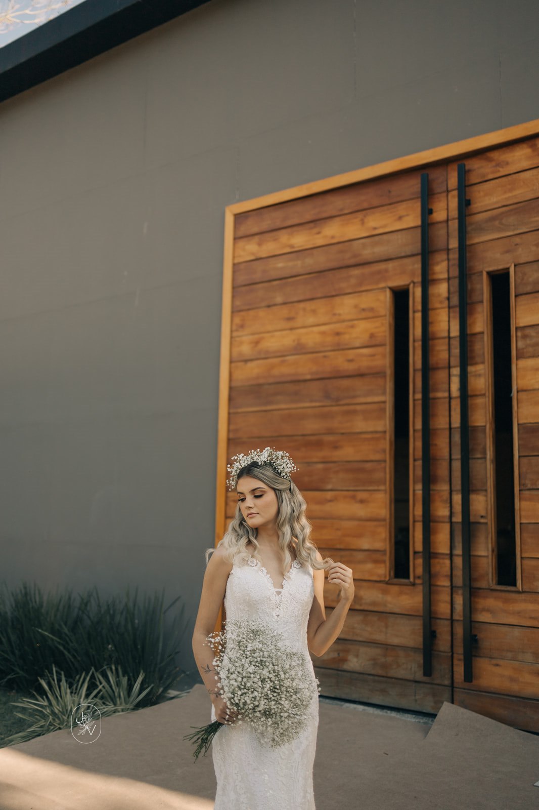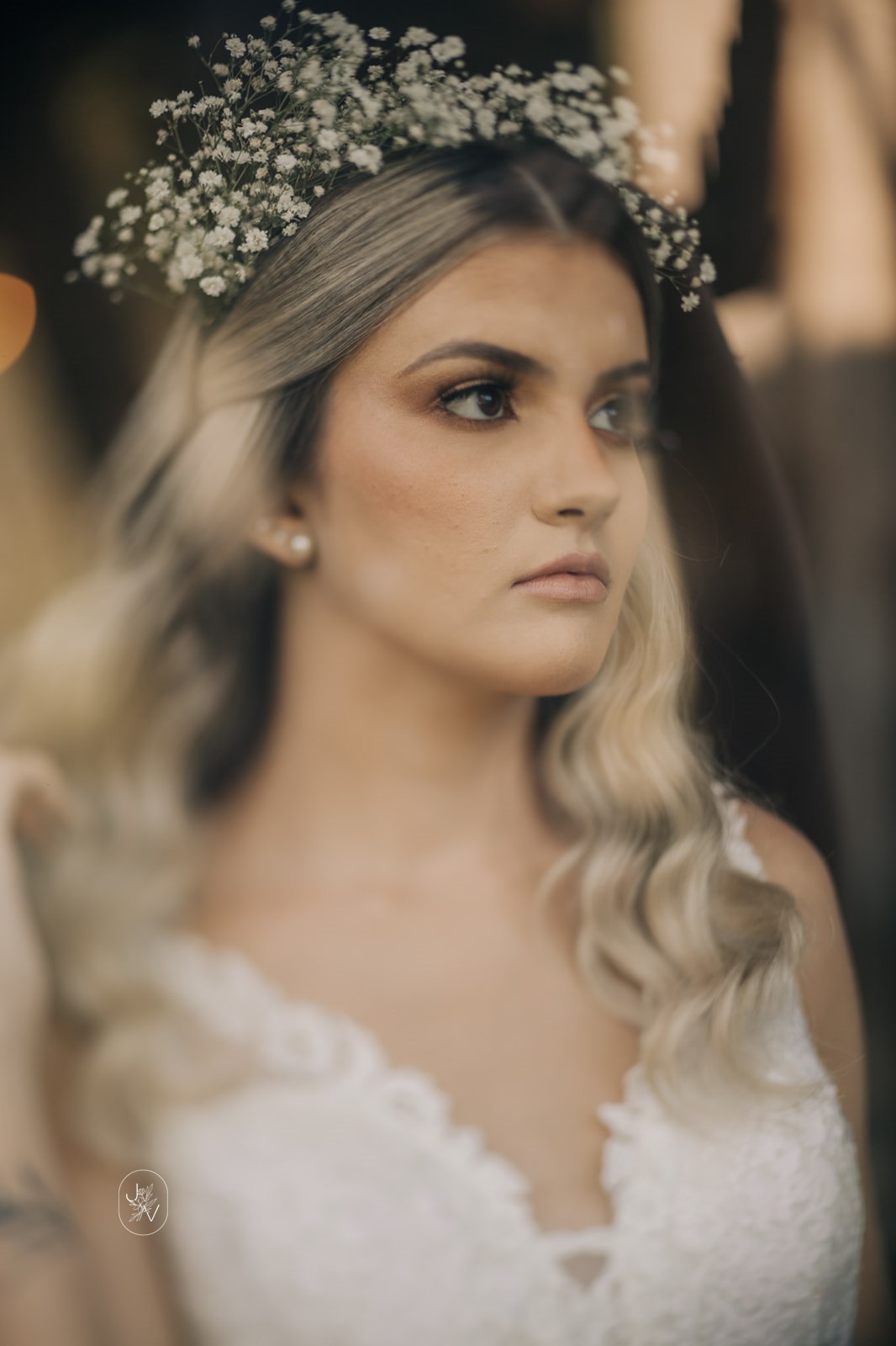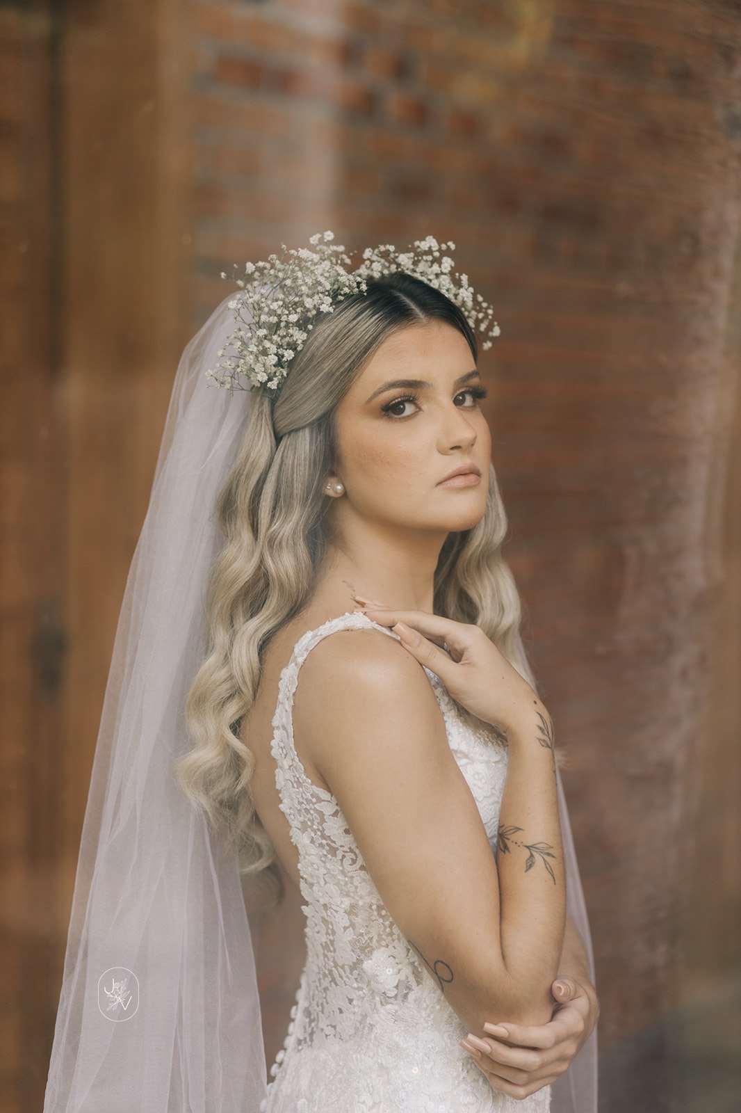 Desde o detalhe da coroa de flores, da maquiagem perfeita e também da escolha do vestido de noiva. Um modelo Internovias trabalhado em rendas delicadas, com decote perfeito e sensual nas costas, um caimento que definiu e valorizou ainda mais as curvas da noiva.