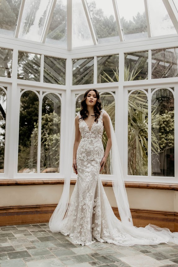 No vestido de noiva abaixo, também vemos um pouco do tattoo lace, mas também outro elemento muito especial em vestidos sereia: a cauda.