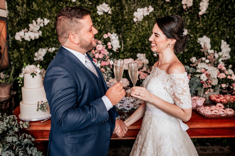 O casal optou por uma cerimônia mais intimista, ao estilo mini wedding clássico. Uma decoração impecável e apaixonante. Cada cantinho transmitia a ideia de aconchego e também de glamour. Um mix de emoções para todos os convidados, e também para quem comtempla as fotos do grande dia.